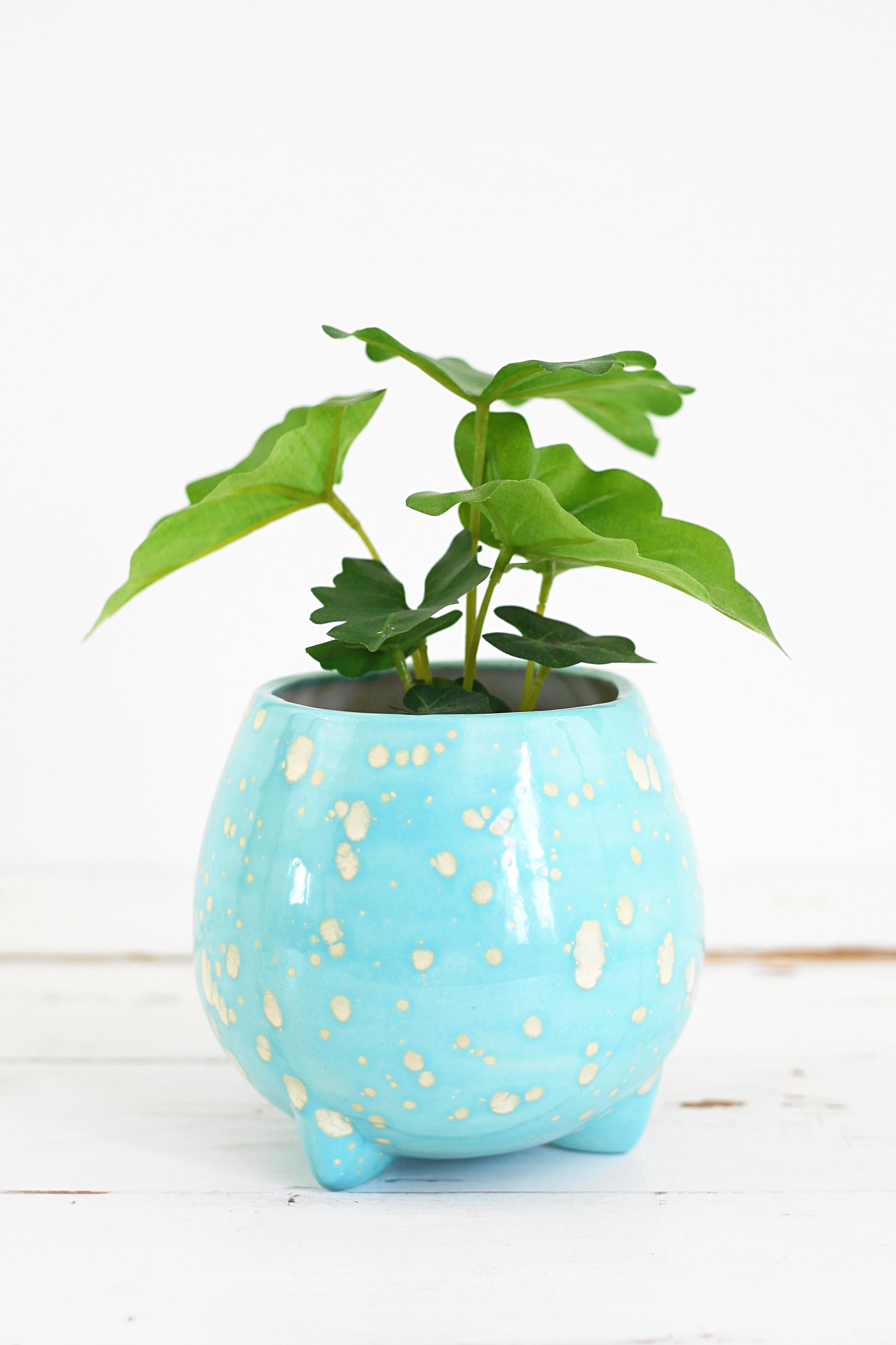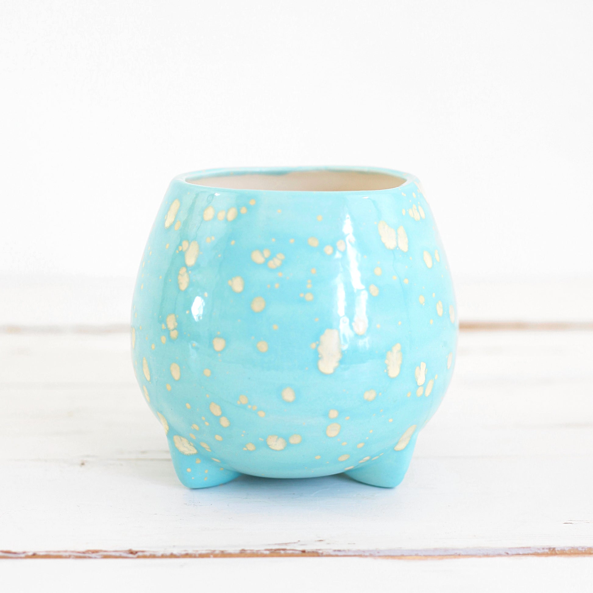 This bright and beautiful mid century planter is just so fun! Made of ceramic with a bright sky blue glaze speckled with white, this planter has a fun rounded shape and a footed tripod base. Perfect for holding an extra special house plant and adding a pop of color to your home!