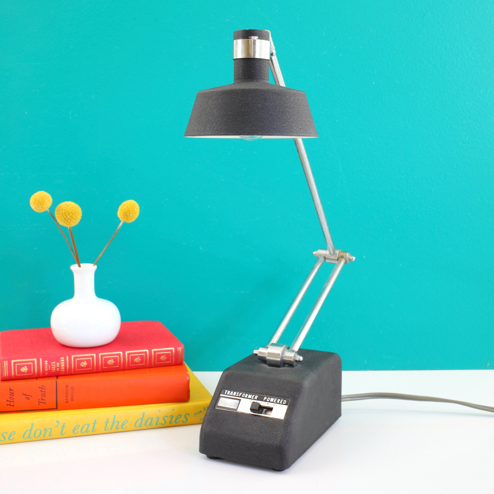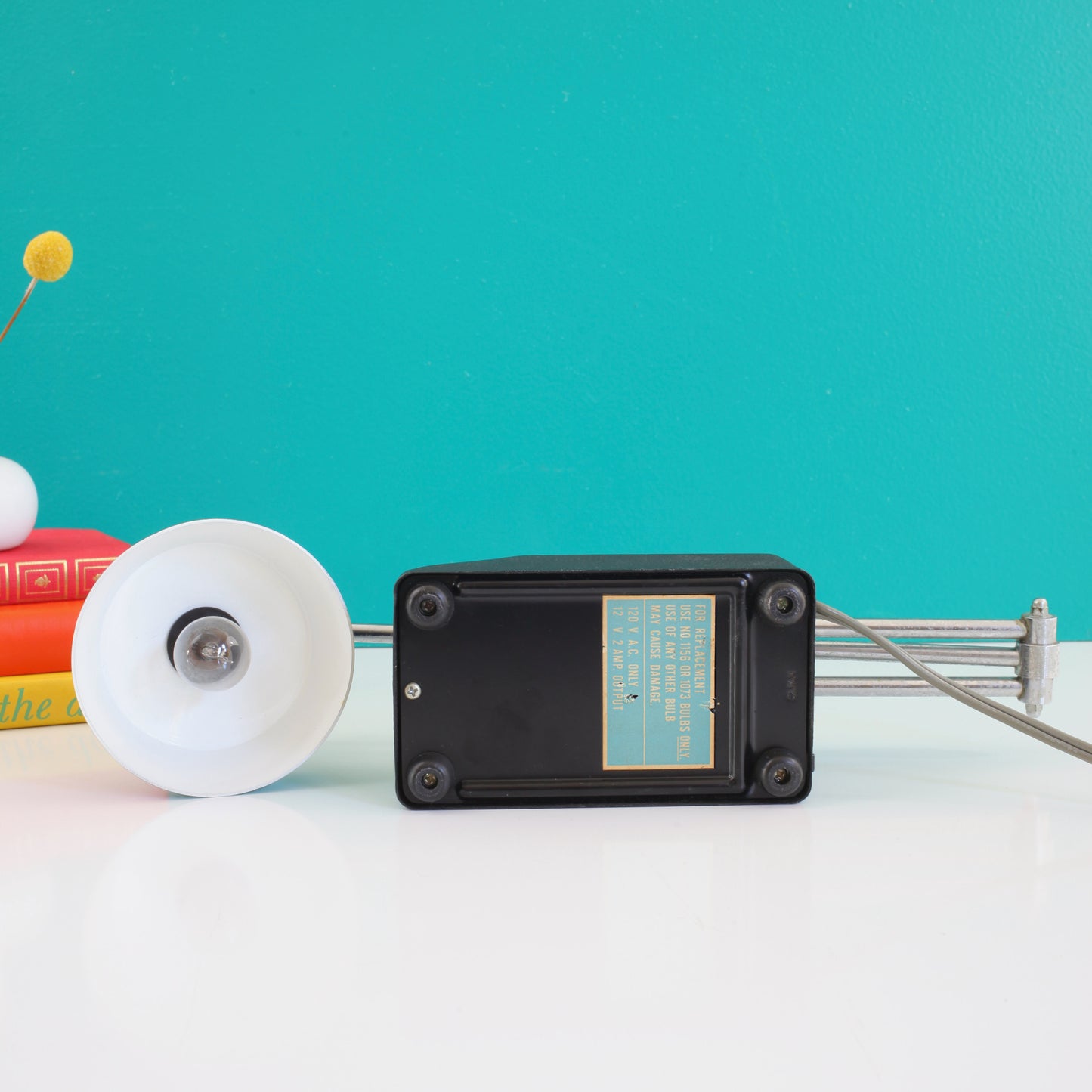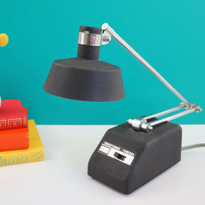 This handsome 'transformer powered' black and chrome vintage desk lamp features an adjustable arm, a 'hi' and 'lo' switch, and a simple, classy, undeniably retro design. Perfect for shedding some light on the task at hand, and just as perfect for adding a bit of retro charm to your desk. Comes with a working bulb so you're ready to plug it in and get down to business!