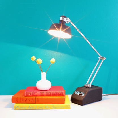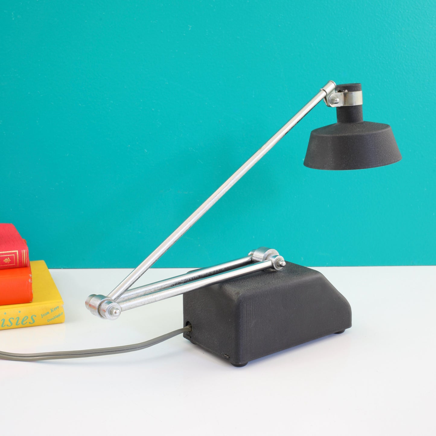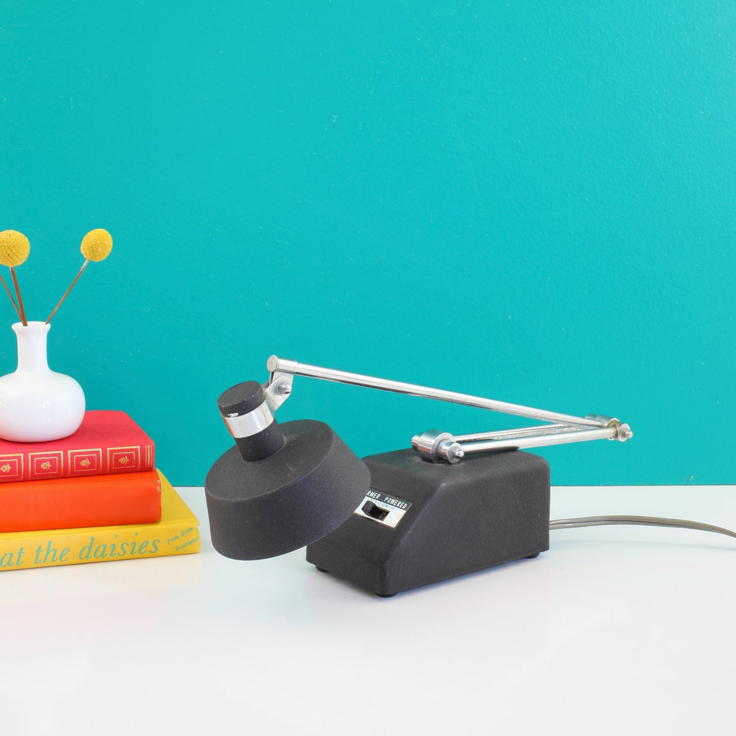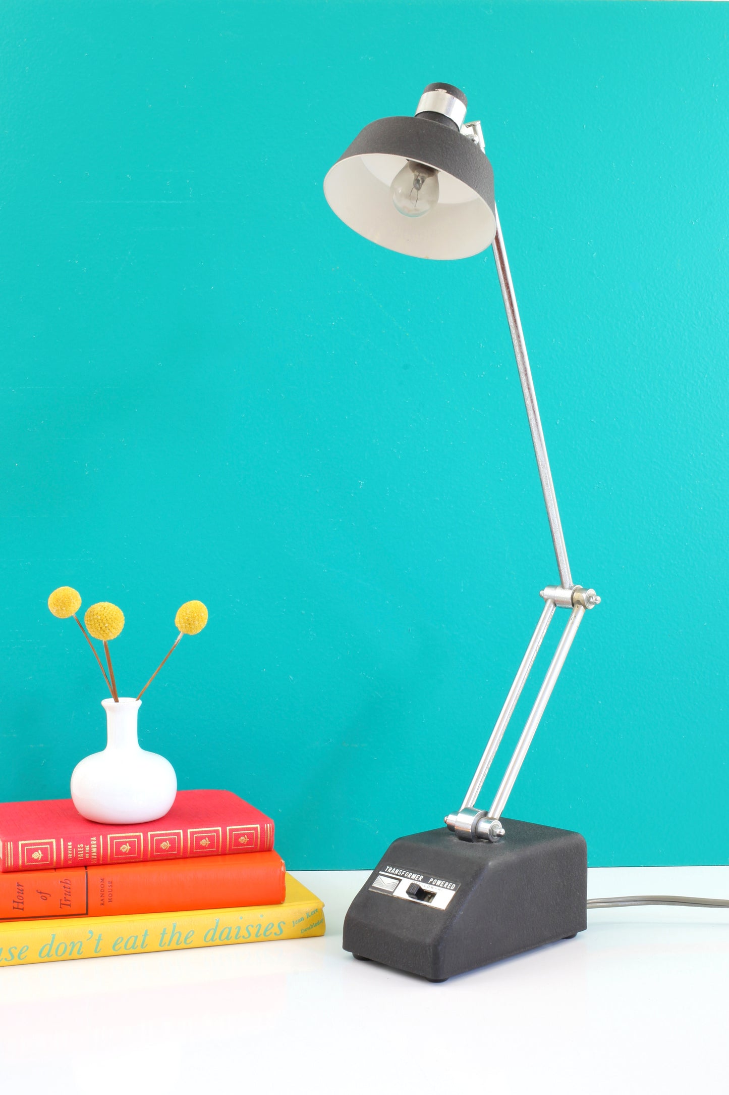 This handsome 'transformer powered' black and chrome vintage desk lamp features an adjustable arm, a 'hi' and 'lo' switch, and a simple, classy, undeniably retro design. Perfect for shedding some light on the task at hand, and just as perfect for adding a bit of retro charm to your desk. Comes with a working bulb so you're ready to plug it in and get down to business!