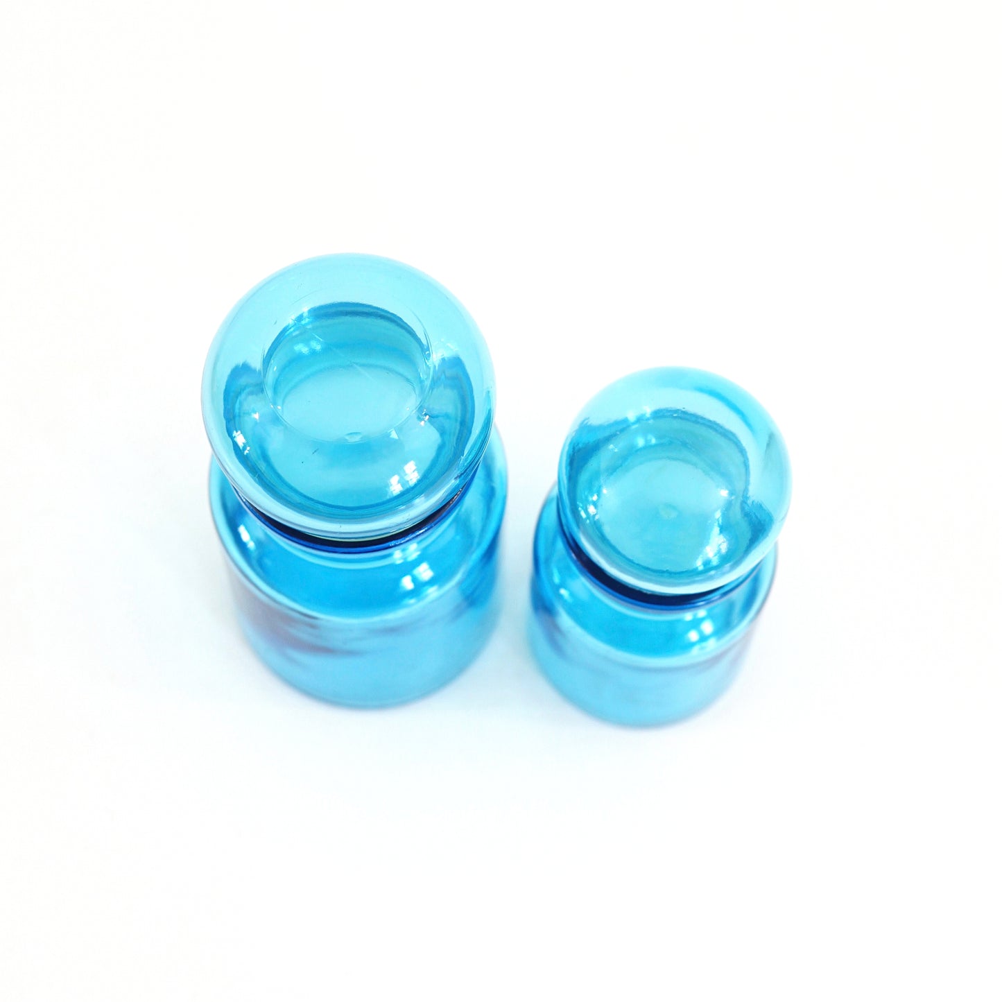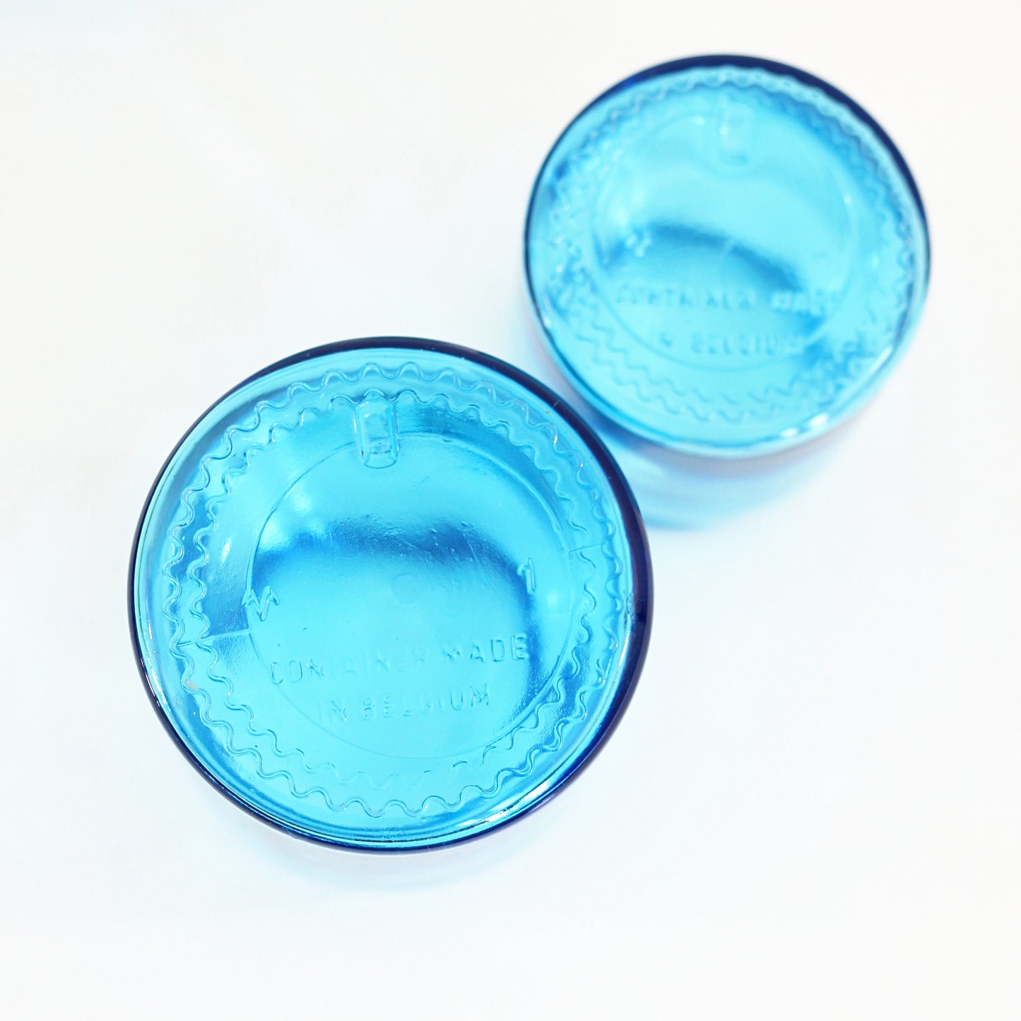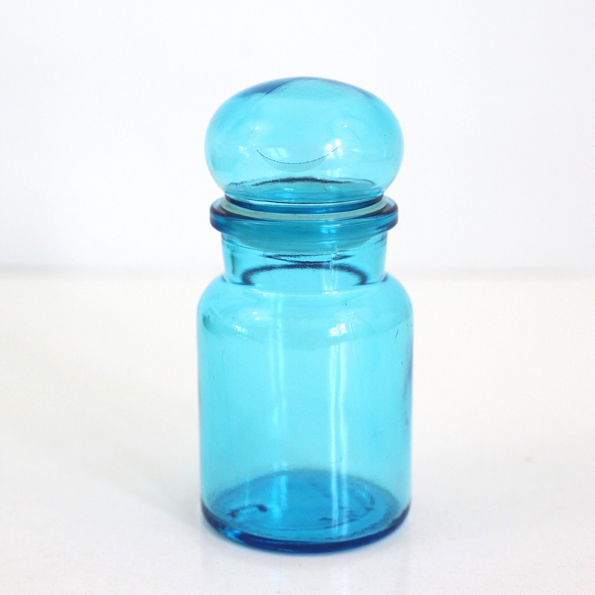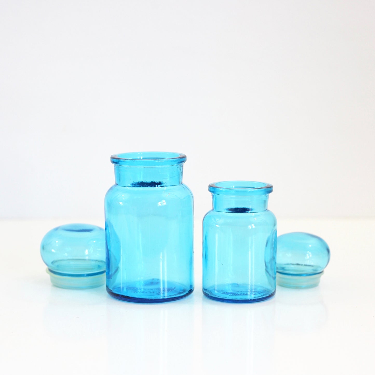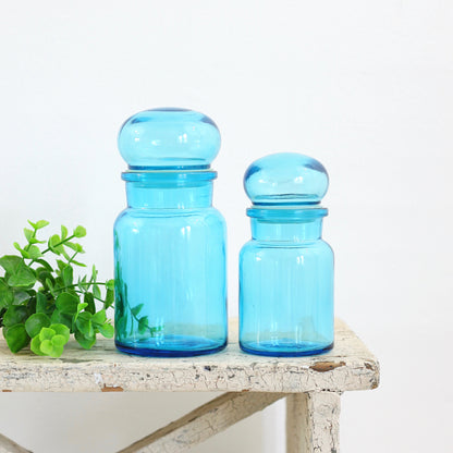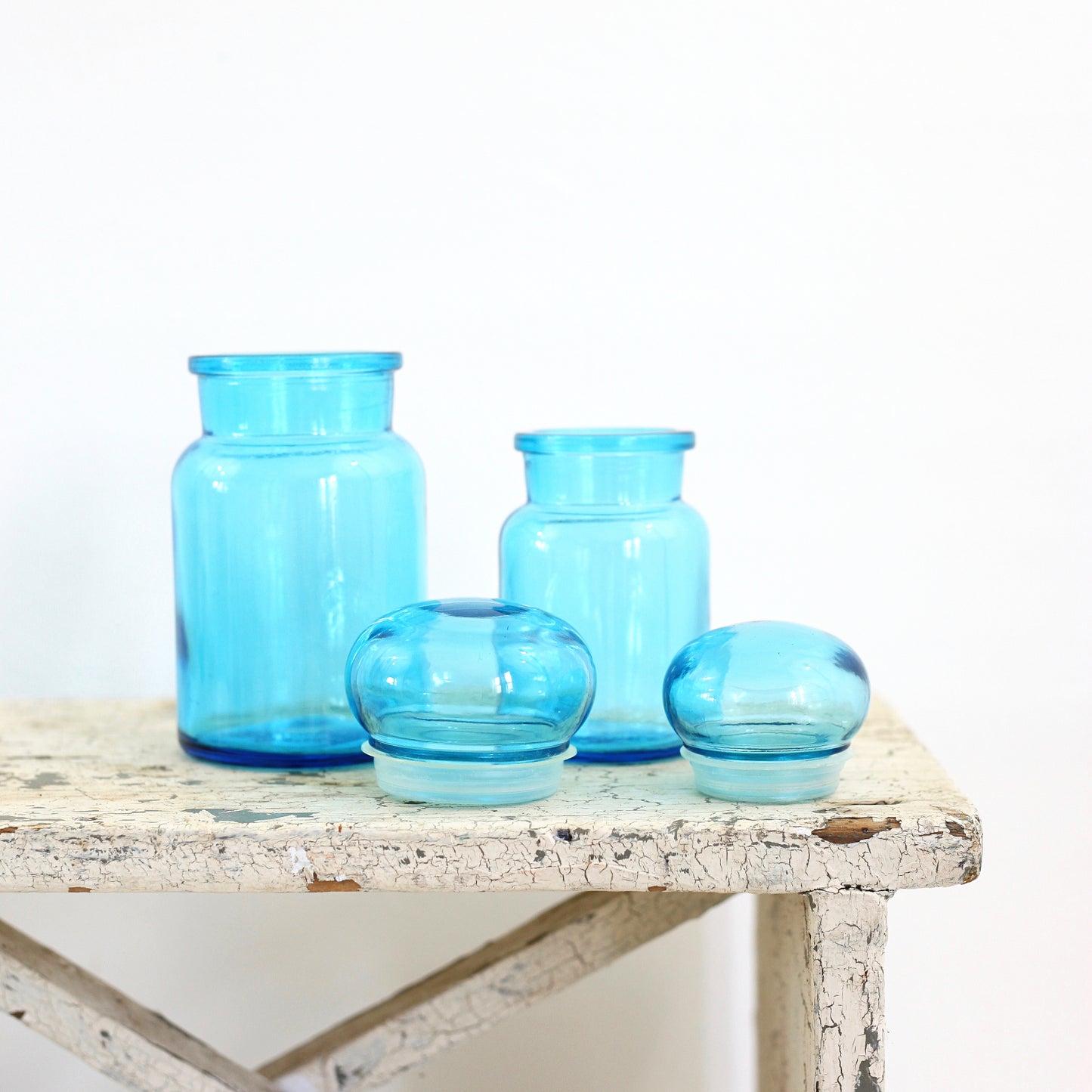 These bright and beautiful vintage glass apothecary jars are so simple and lovely! Made in Belgium in the 1970s, these bubble top jars are made of bright turquoise blue glass. Perfect for stashing snacks in the kitchen, craft supplies on your desk, or whatever you can dream up! As fun as they are functional, you're sure to find plenty of uses for these jars all over the house!
