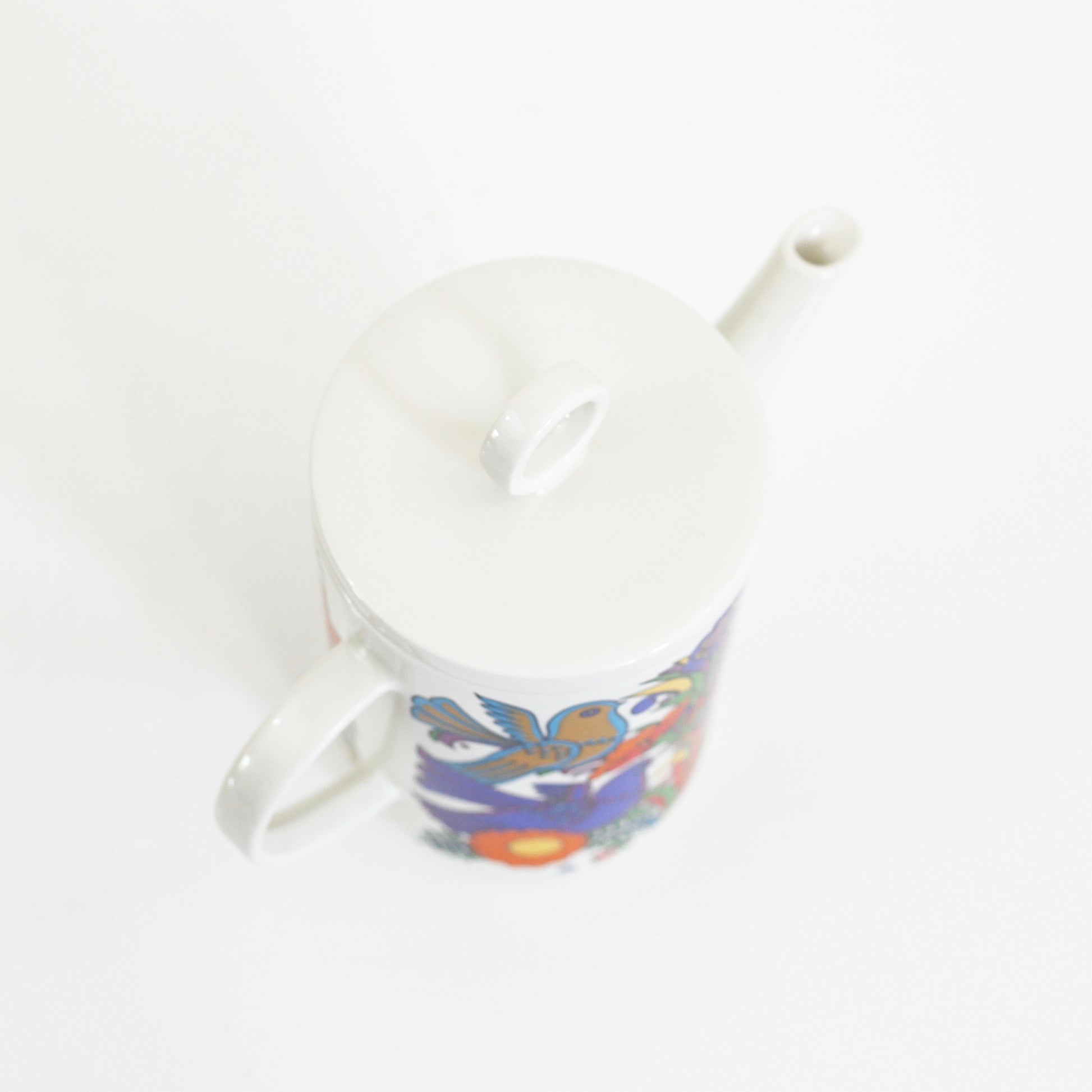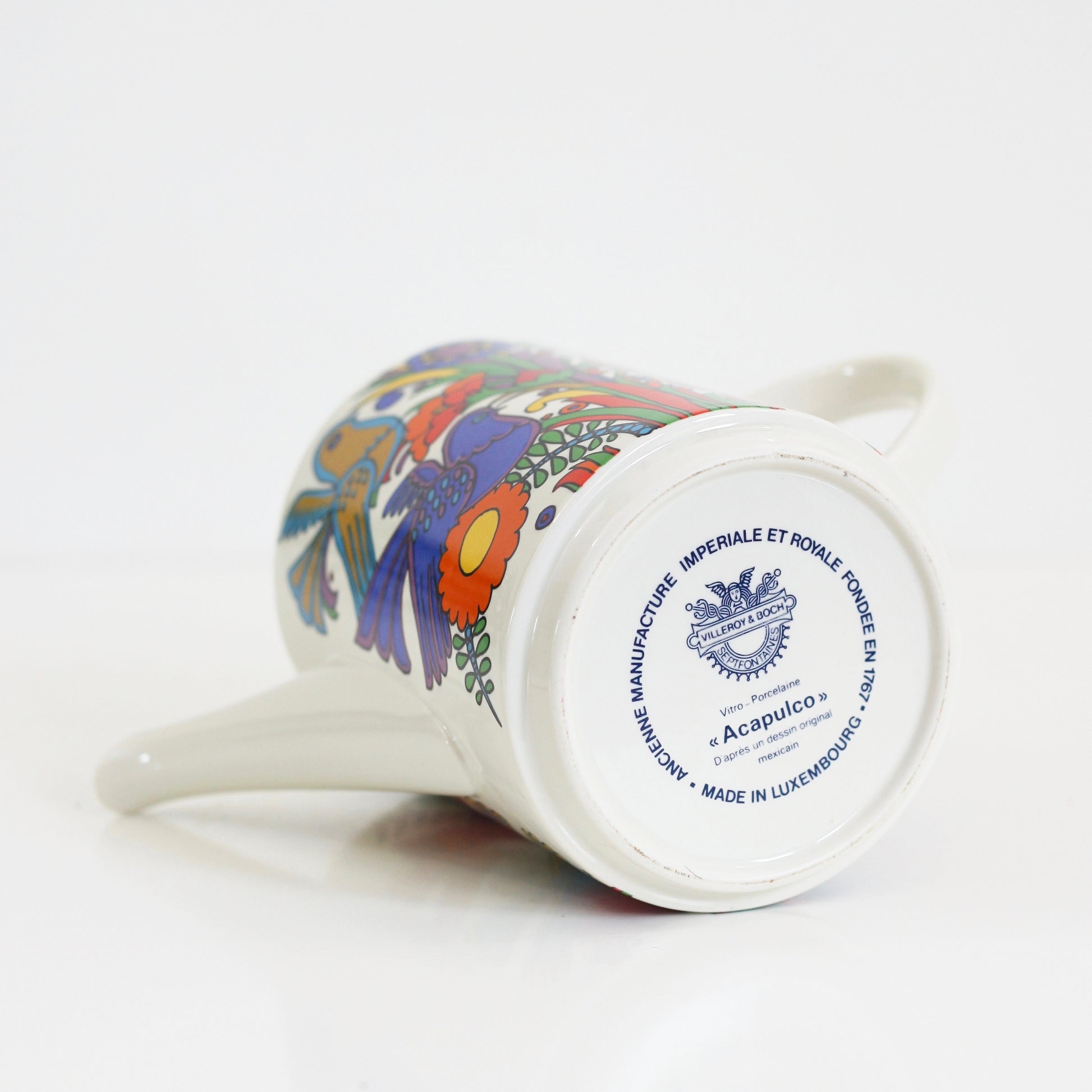 This vintage Villeroy and Boch coffee pot is one of the most beautiful pieces of mid century ceramics I've come across! First produced by Villeroy and Boch of Luxembourg starting in 1967, this coffee pot has a gorgeous mid century shape designed by Ludwig Scherer and the iconic 'Acapulco' pattern designed by Christiane Reuter. With rich, saturated colors and a whimsical flora and fauna design inspired by Mexican folk art, this coffee pot is sure to be the star of your mid century kitchen!