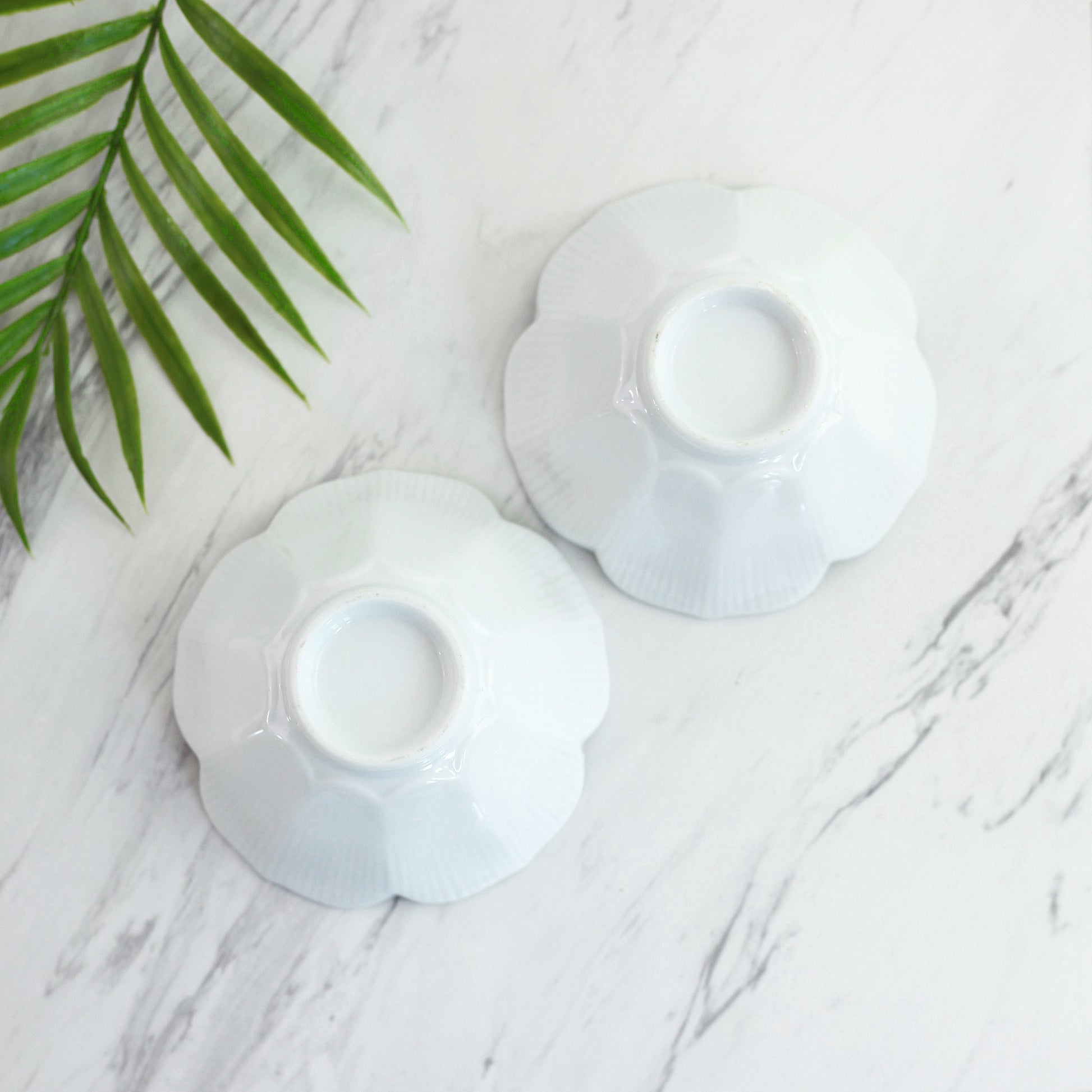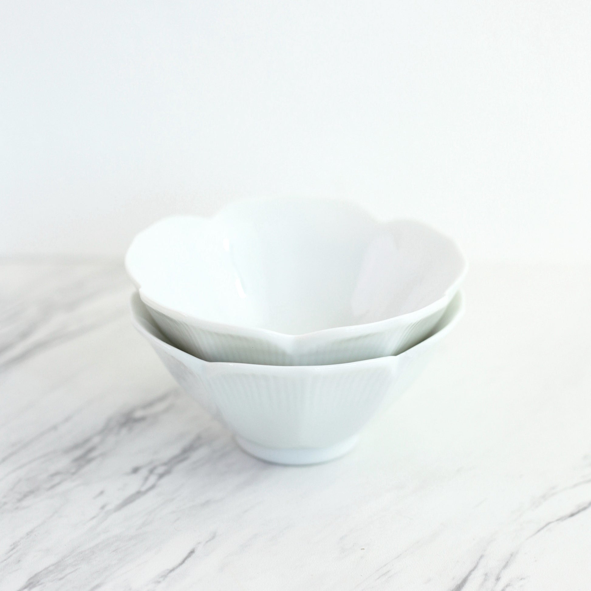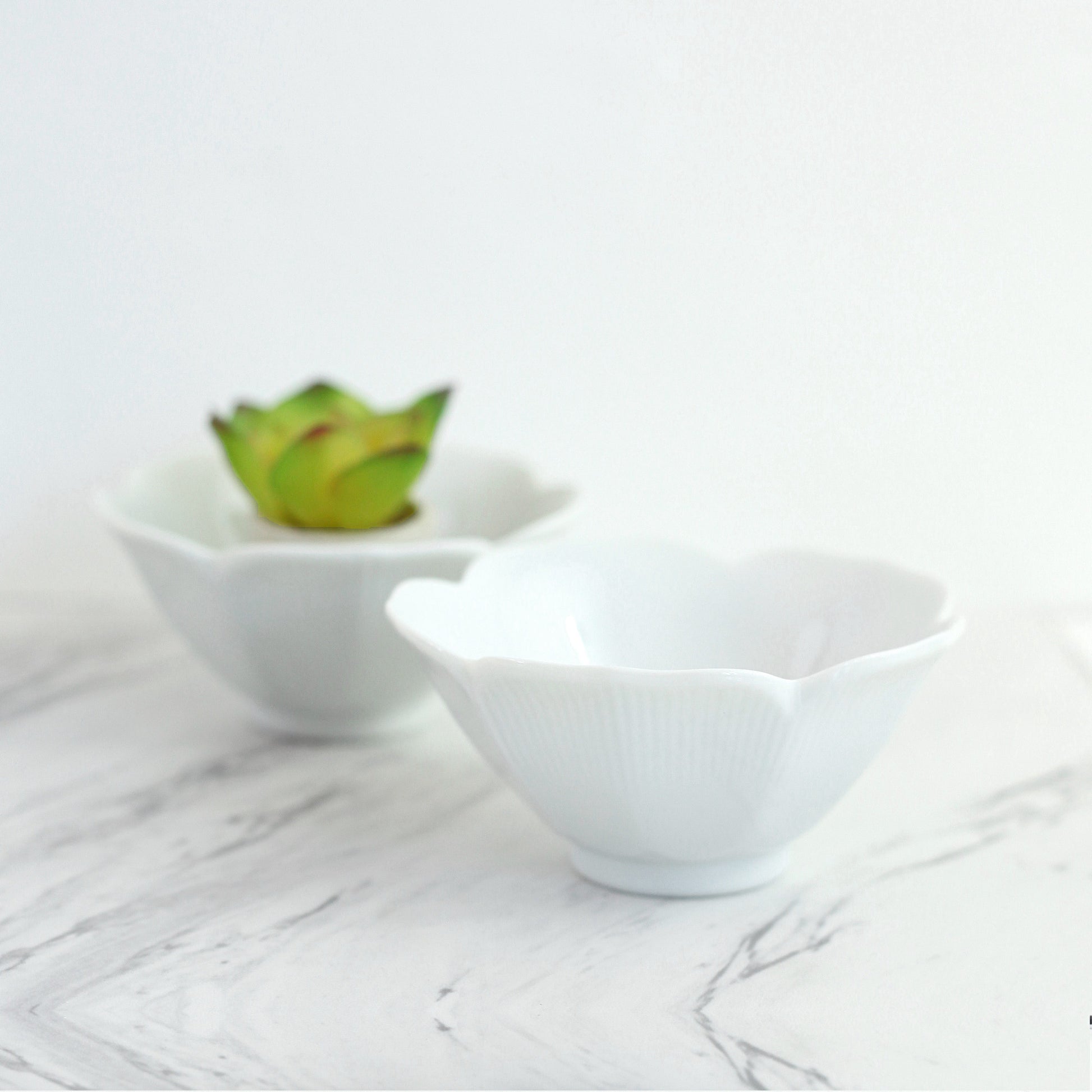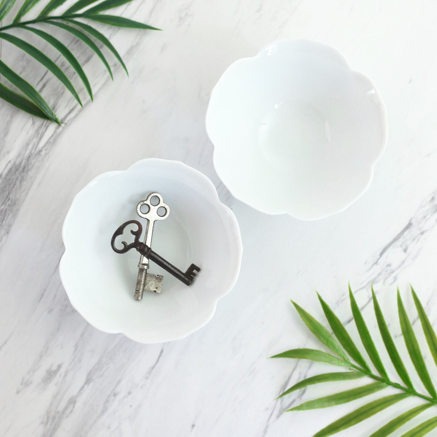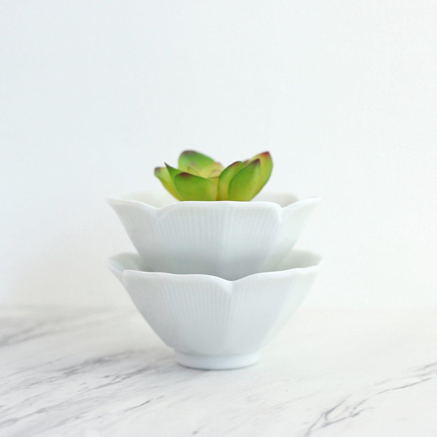 This beautiful pair of vintage nesting lotus bowls is made of lovely, delicate white porcelain. With a subtle texture and scalloped edges, these bowls are so pretty in their simplicity. Perfect for serving snacks, holding candy, storing jewelry on your dresser or office supplies on your desk, you'll find all sorts of reasons to use these little beauties all over your house.