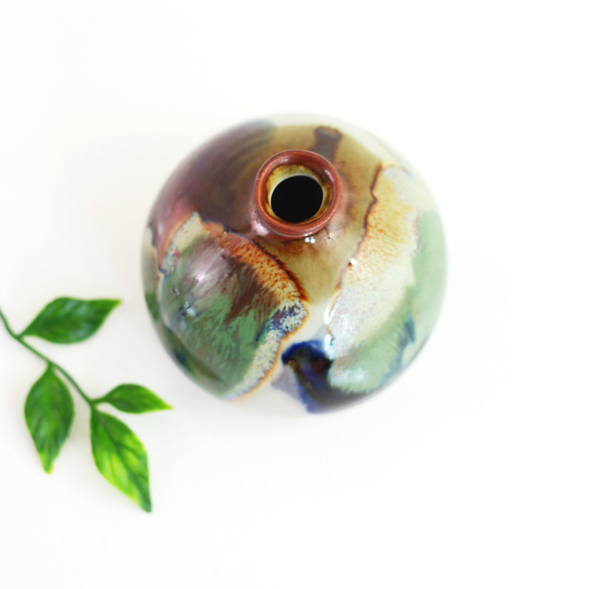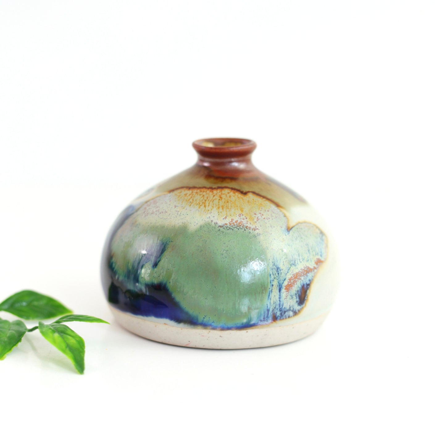 This beautiful vintage ceramic bud vase is a real stunner! Hand made with a gorgeous high-gloss drip glaze finish in muted tones of sage green, cobalt blue, mustard, caramel, and plum. Bottom portion is unglazed, giving this piece an earthy beauty that can't be beat! Perfect for holding a small flower or two, and beautiful enough just to display and admire.