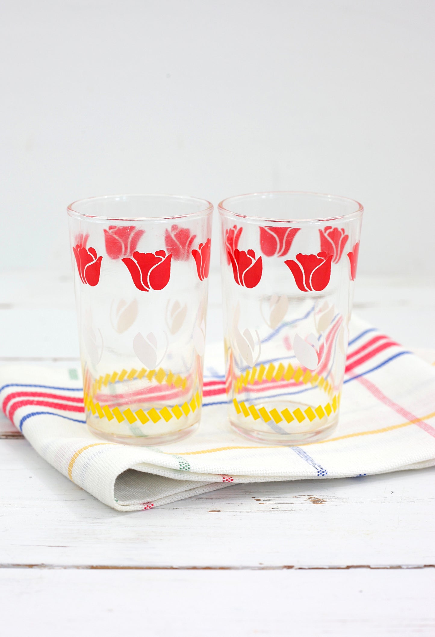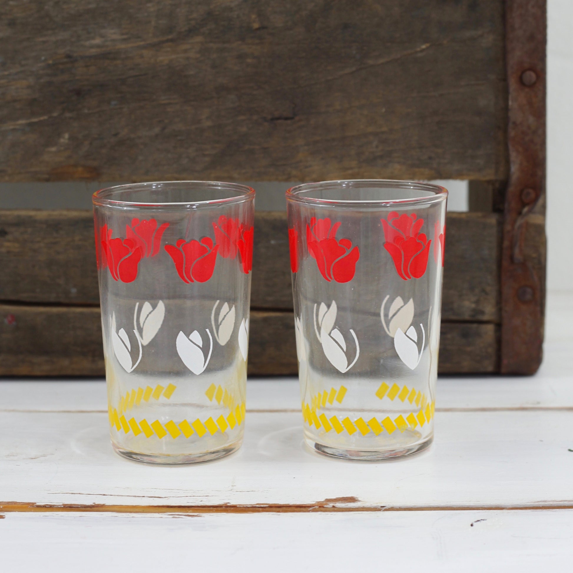 This sweet pair of vintage 1950s Federal Glass juice glasses is just so retro and fun! Each glass is decorated with a tulip motif in bright red, white, and yellow. Perfect for sipping your morning juice in style!