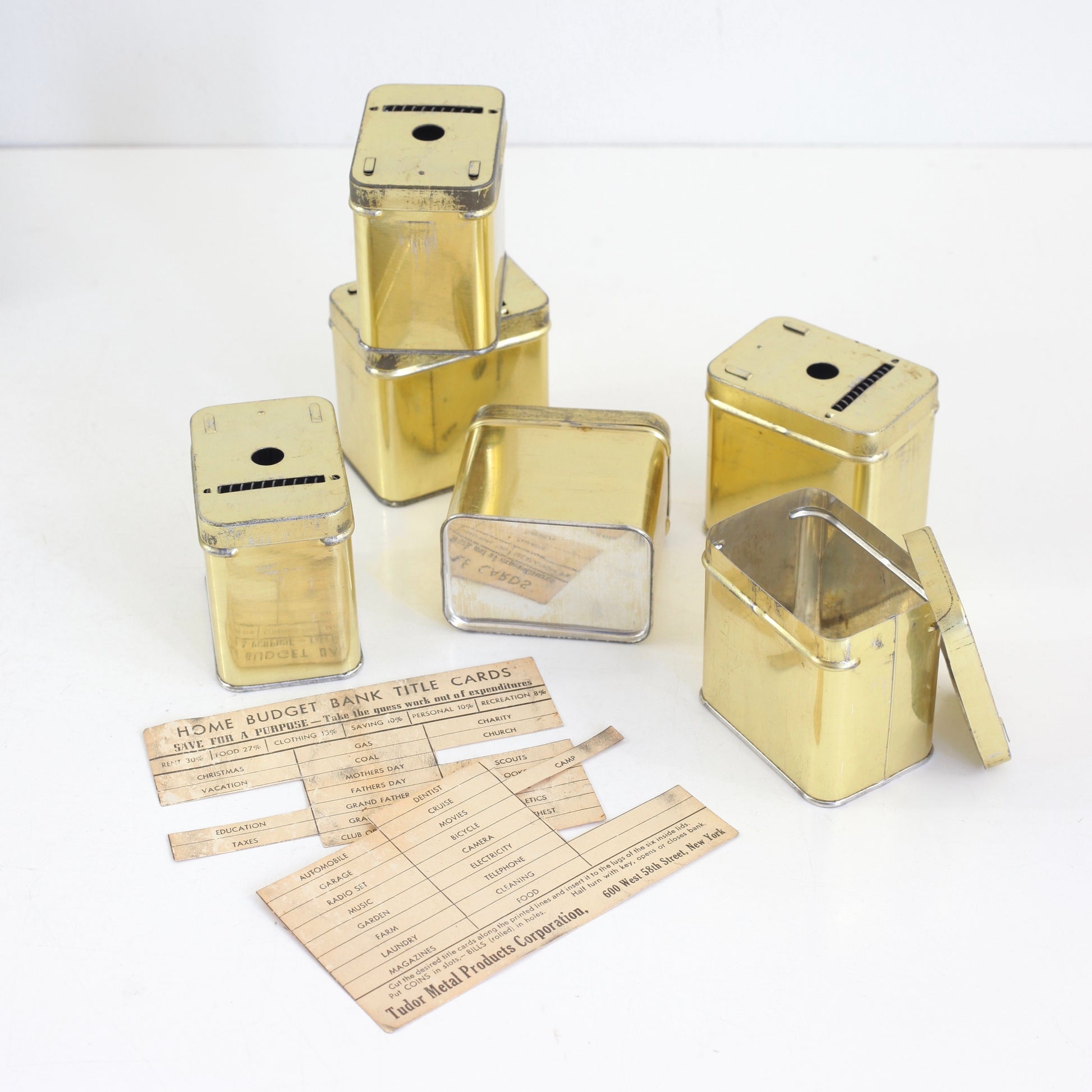 This fun vintage 1950s metal budget bank box is both cute and useful! In a bright and beautiful shade of green with black and silver metal accents, this budget bank features a hinged lid with slots for dropping in coins and bills. This bank includes the outer box and six little golden boxes that fit snugly inside the larger one. Slide labels into the slots on each of the six golden lids to designate what each little box is saving up for. A super fun way to save your pennies, stash your office supplies or jewelry, or whatever else you can dream up!