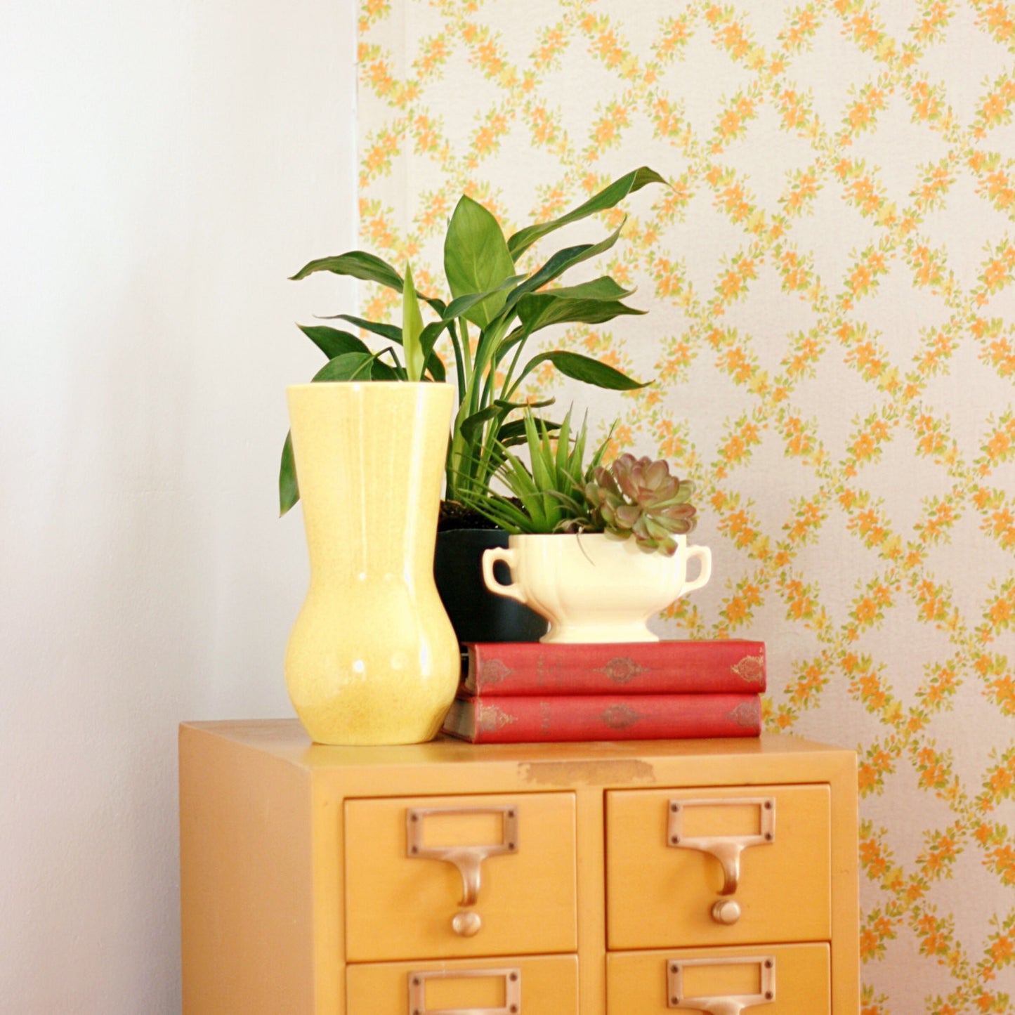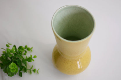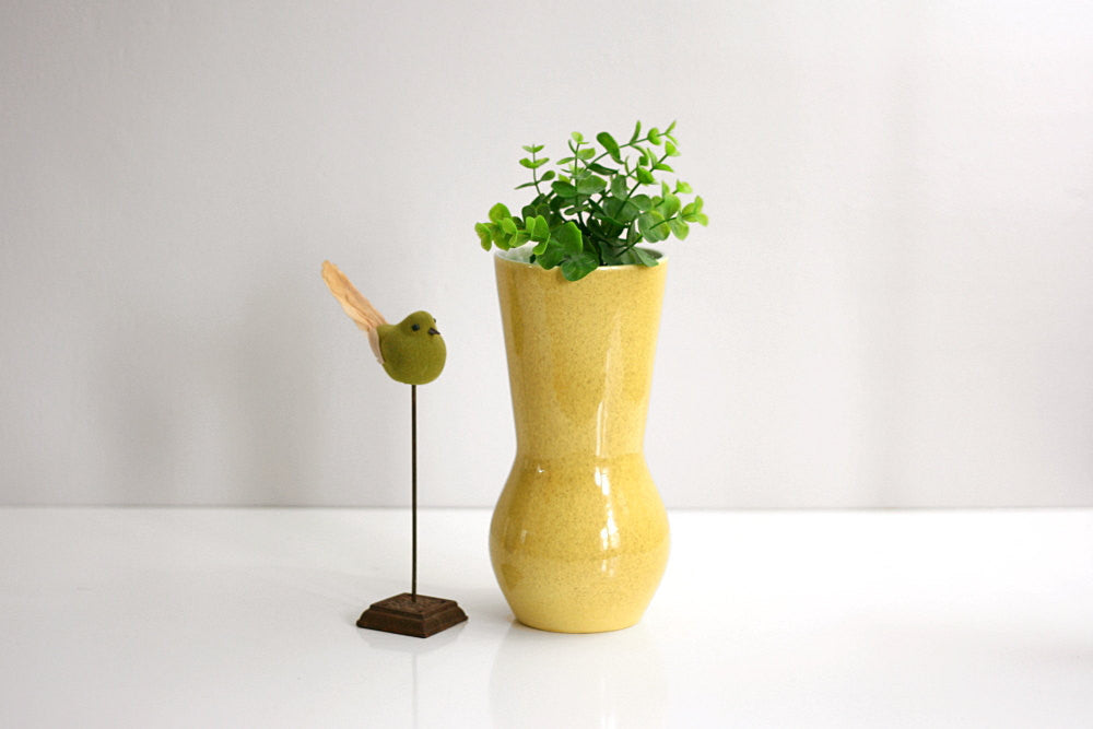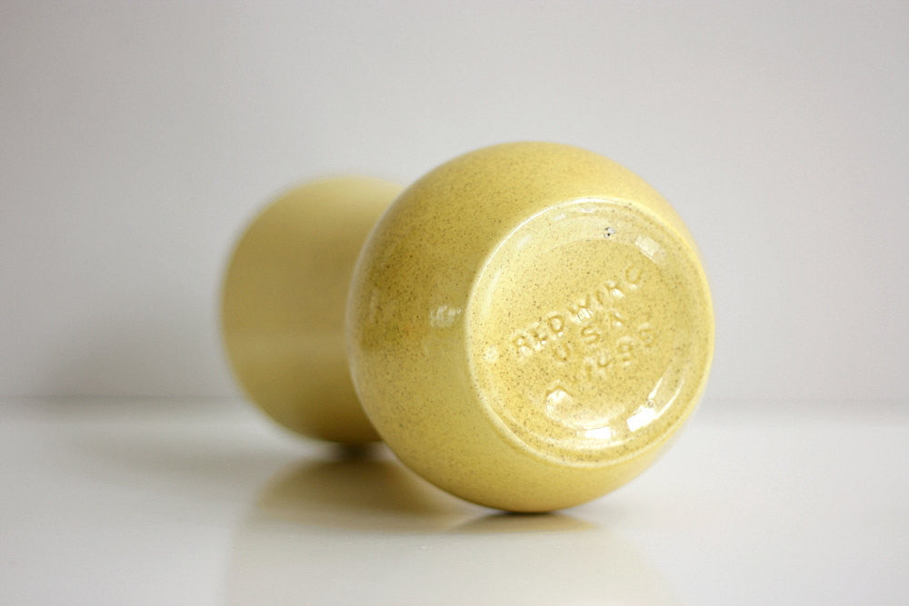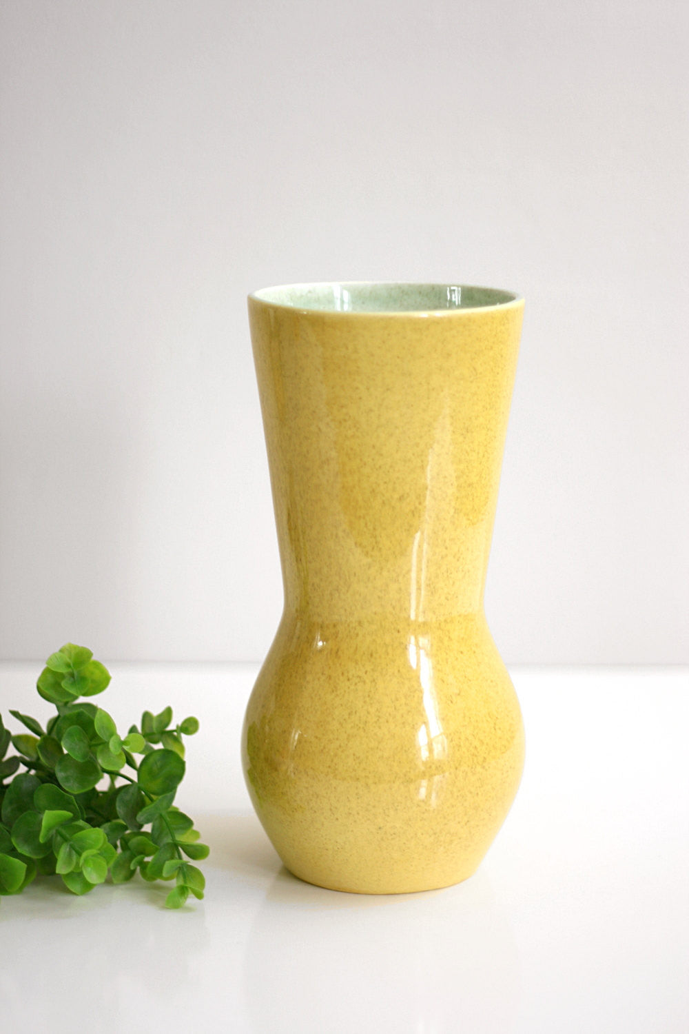 This fabulous vintage 1950s Red Wing Pottery vase is so mid century marvelous! Made of sturdy ceramic with a beautiful yellow-green speckled glaze on the outside, this vase is a soft sage green on the inside. Designed in the mid 1950s by Charles Murphy. Perfect for holding a bunch of blooms, and pretty enough just to display and admire.