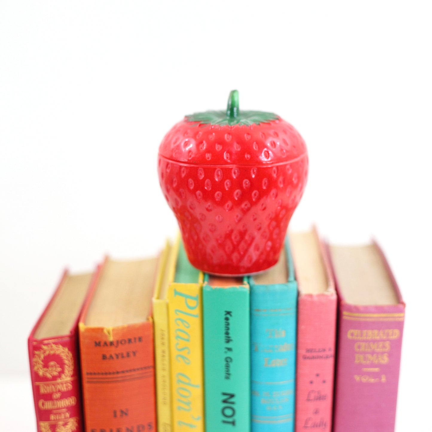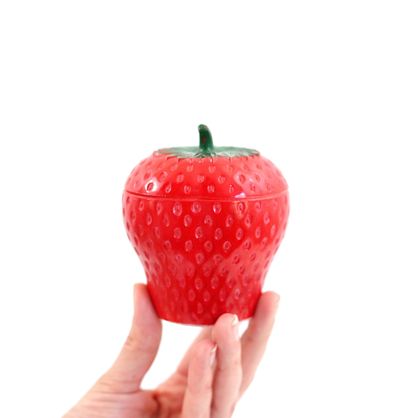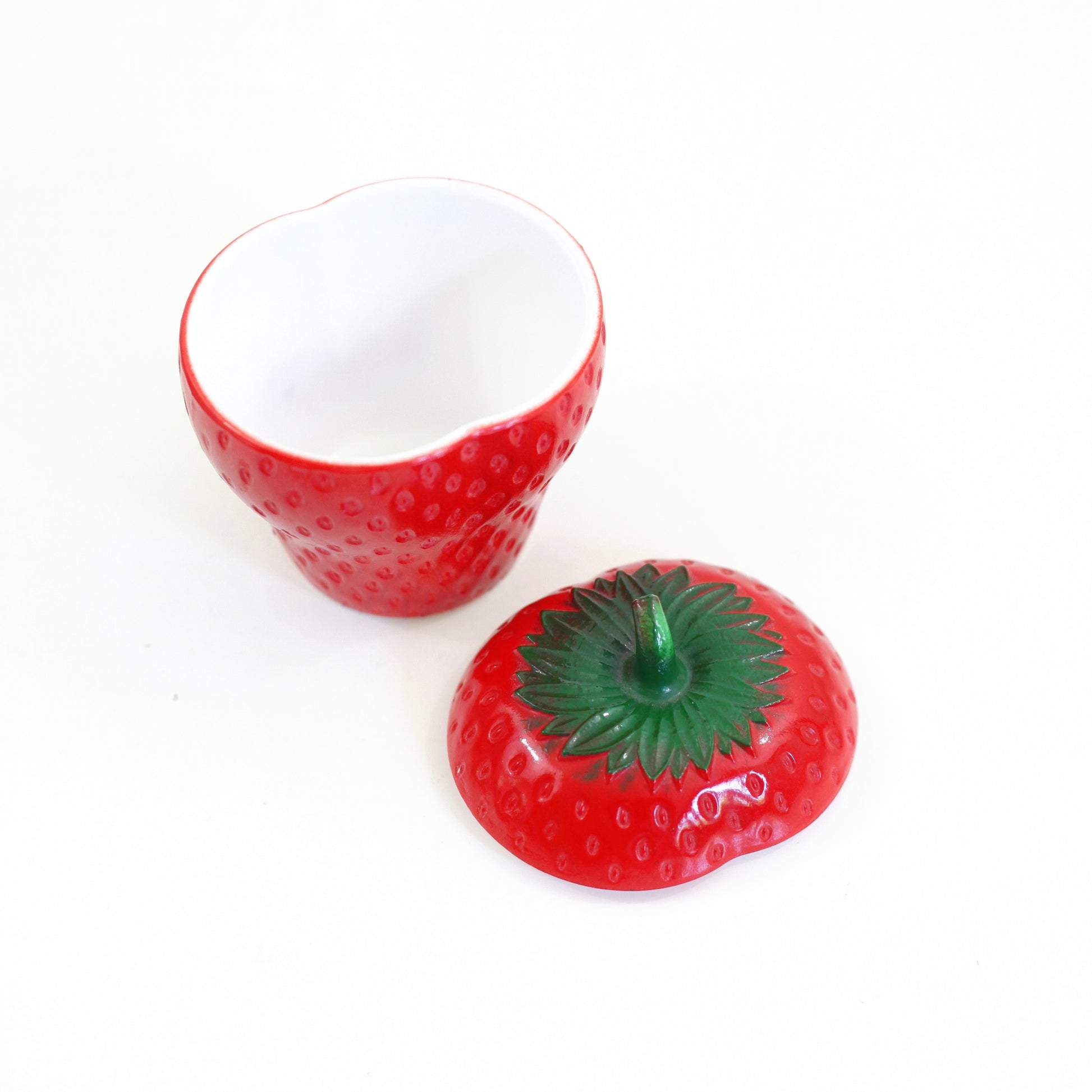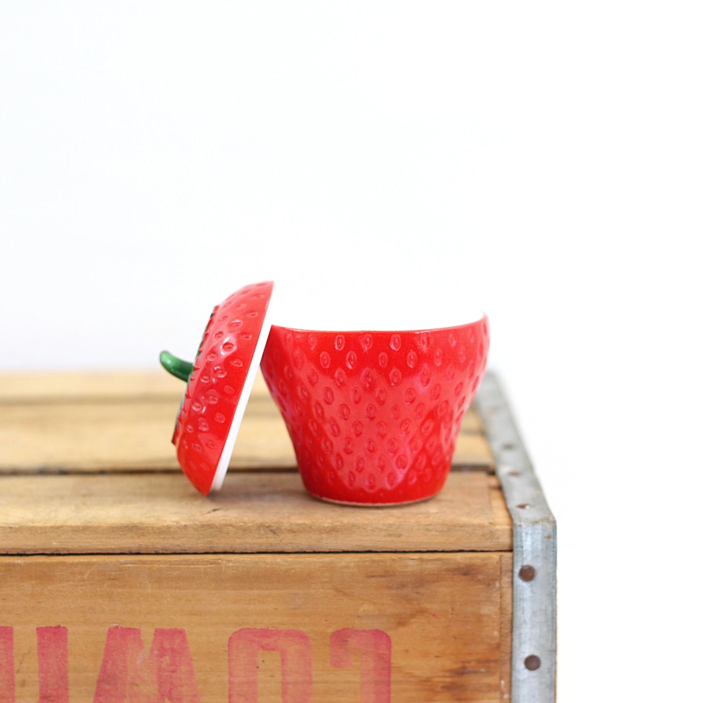 This sweet vintage strawberry jam jar is just too cute! Made in the 1950s by Hazel Atlas, this white milk glass container is painted in bright, shiny red and green. As fun as it is functional, this little jar is perfect for keeping jam, but also great for corralling office supplies on your desk or jewelry on your dresser! Berry cute indeed!