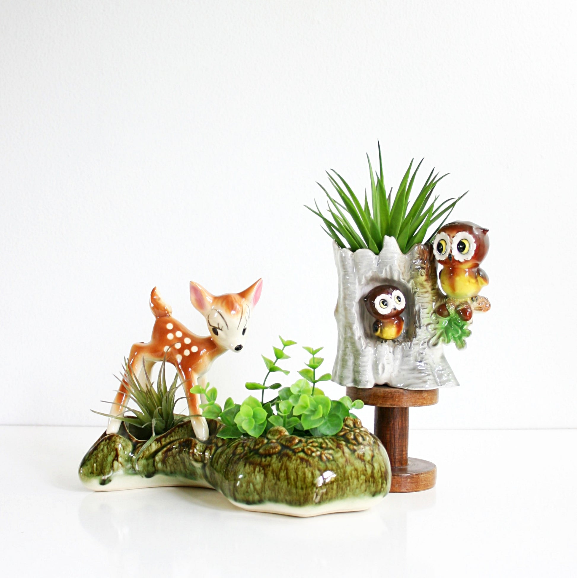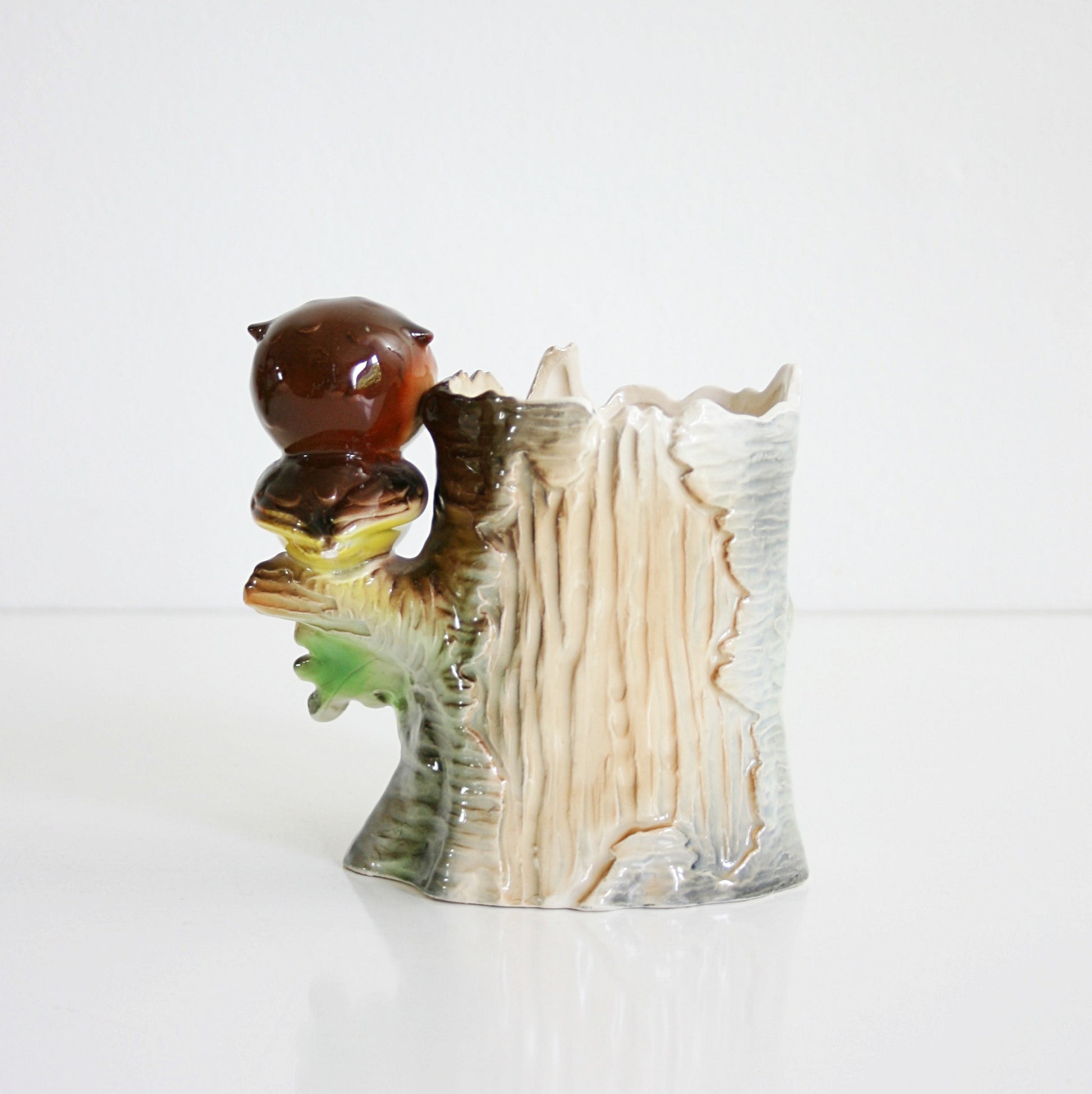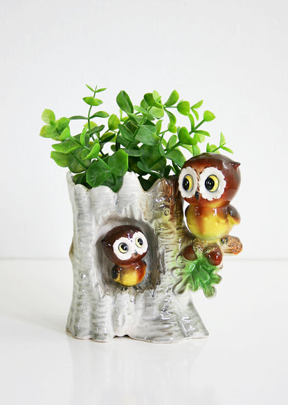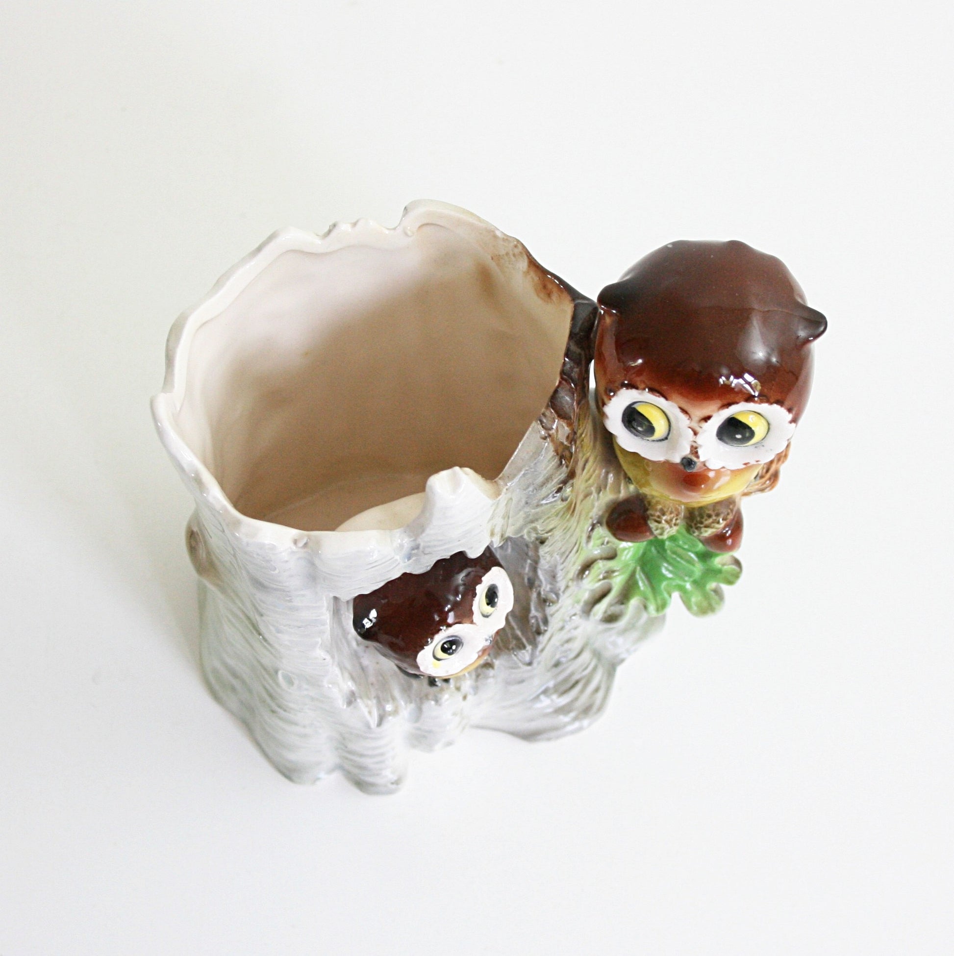 This absolutely adorable vintage 1960s ceramic owl planter is a real hoot! Made by Norcrest, this cute planter or vase has such great details - from the branch full of acorns to the sweet expression on each owl's face. Perfect for holding your favorite plant or a small bunch of blooms, these little owls are sure to make you smile!