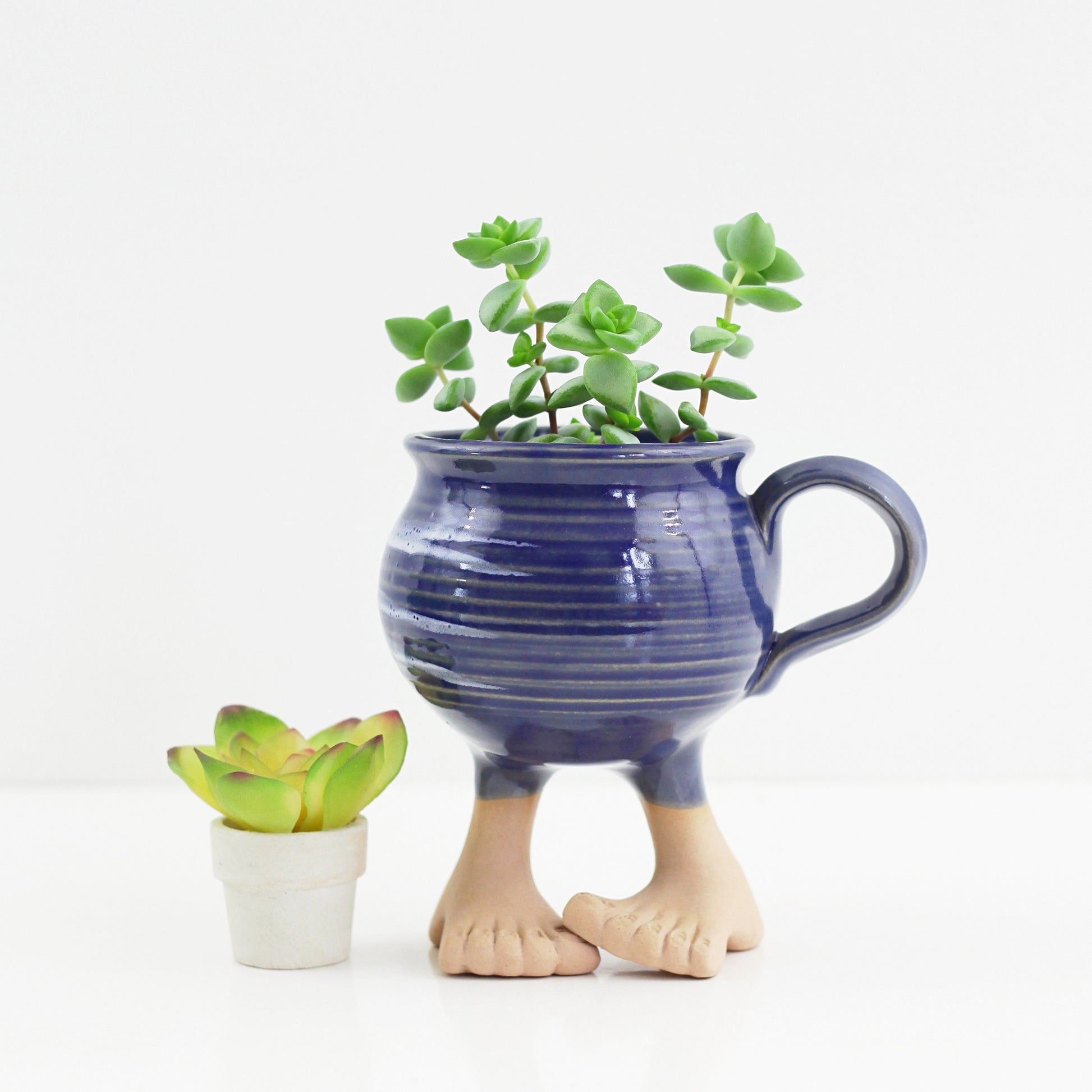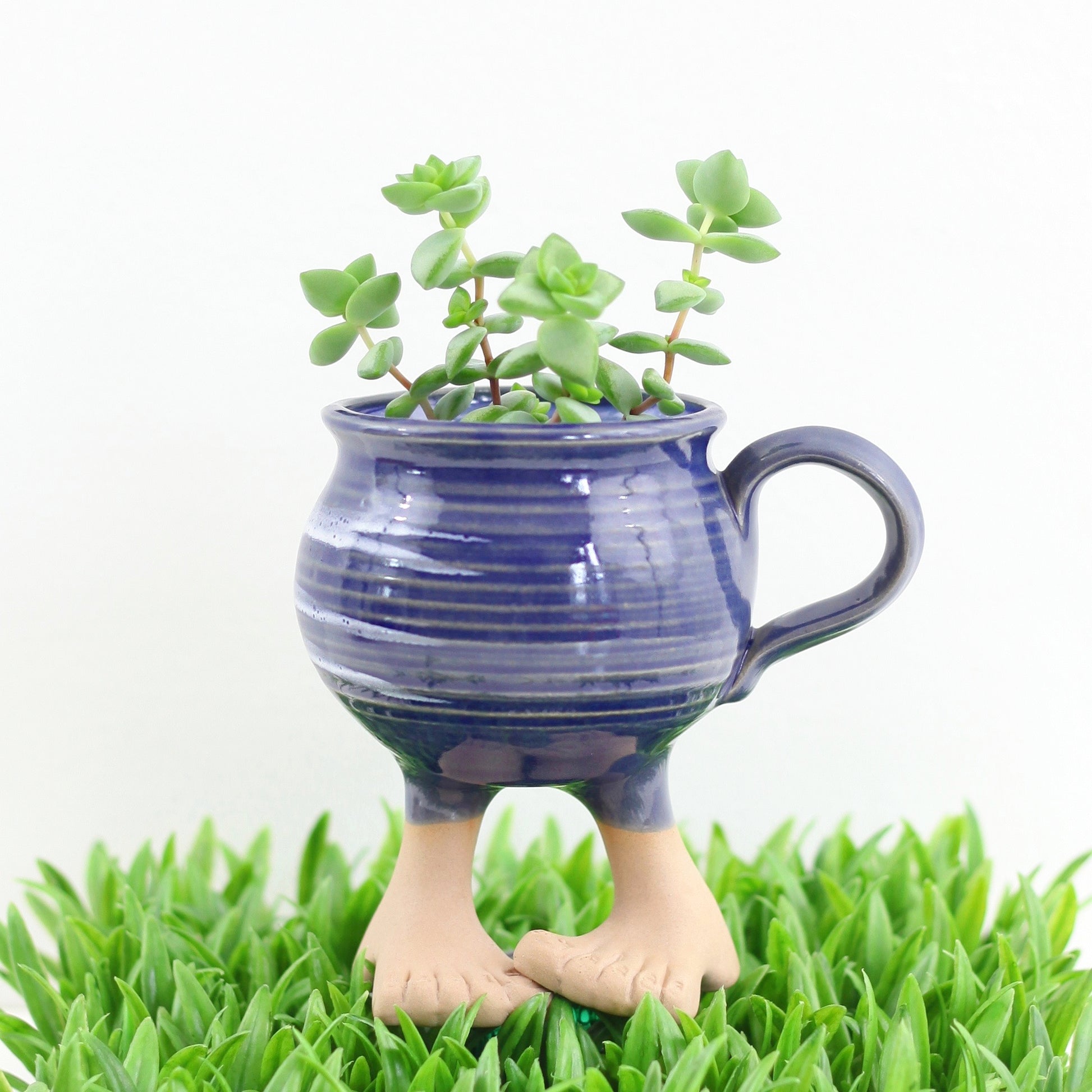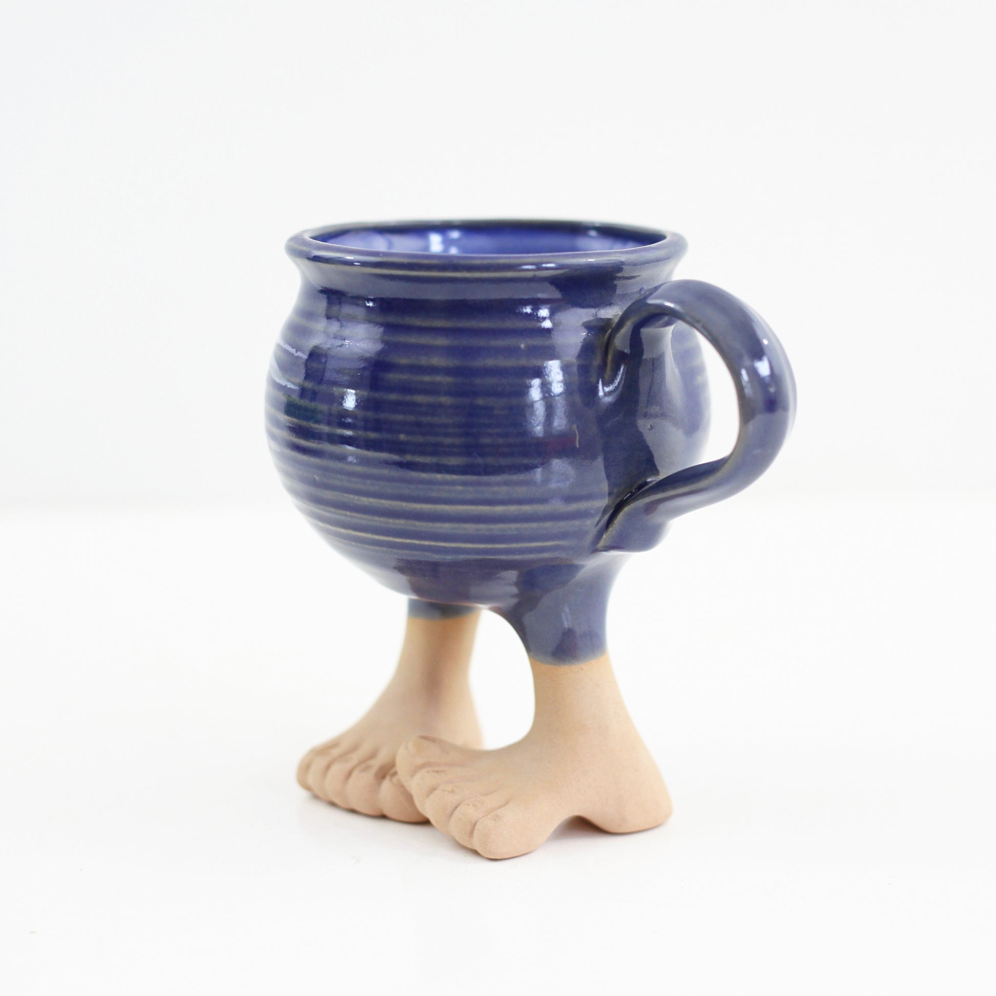 This vintage 1984 Muddy Waters feet mug is just so fun! Made by the Muddy Waters pottery company, this stoneware mug features a swirled blue stoneware mug sitting atop of a pair of stoneware legs with bare feet. Perfect for sipping your morning cup of coffee, or just as fun for holding your favorite little house plant!