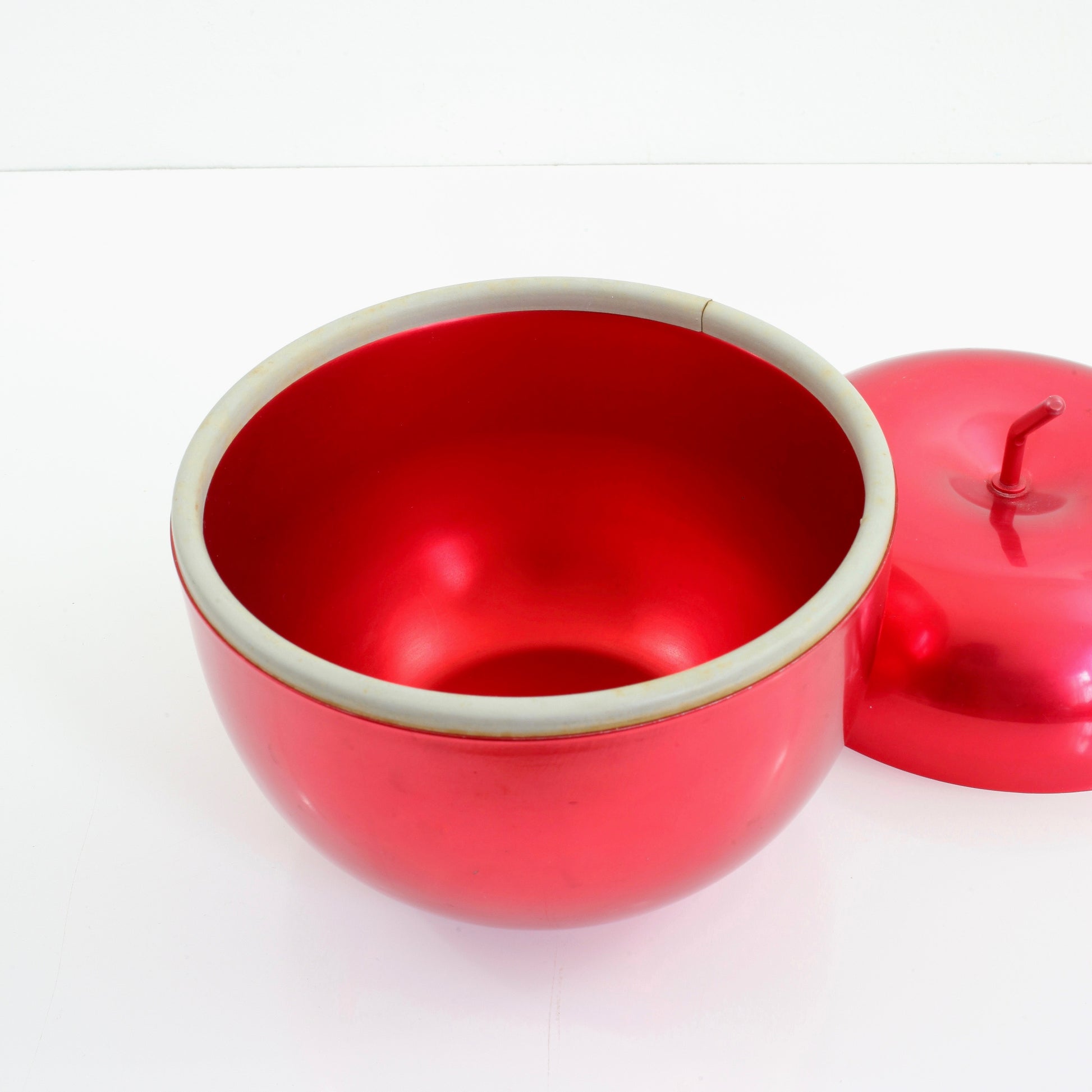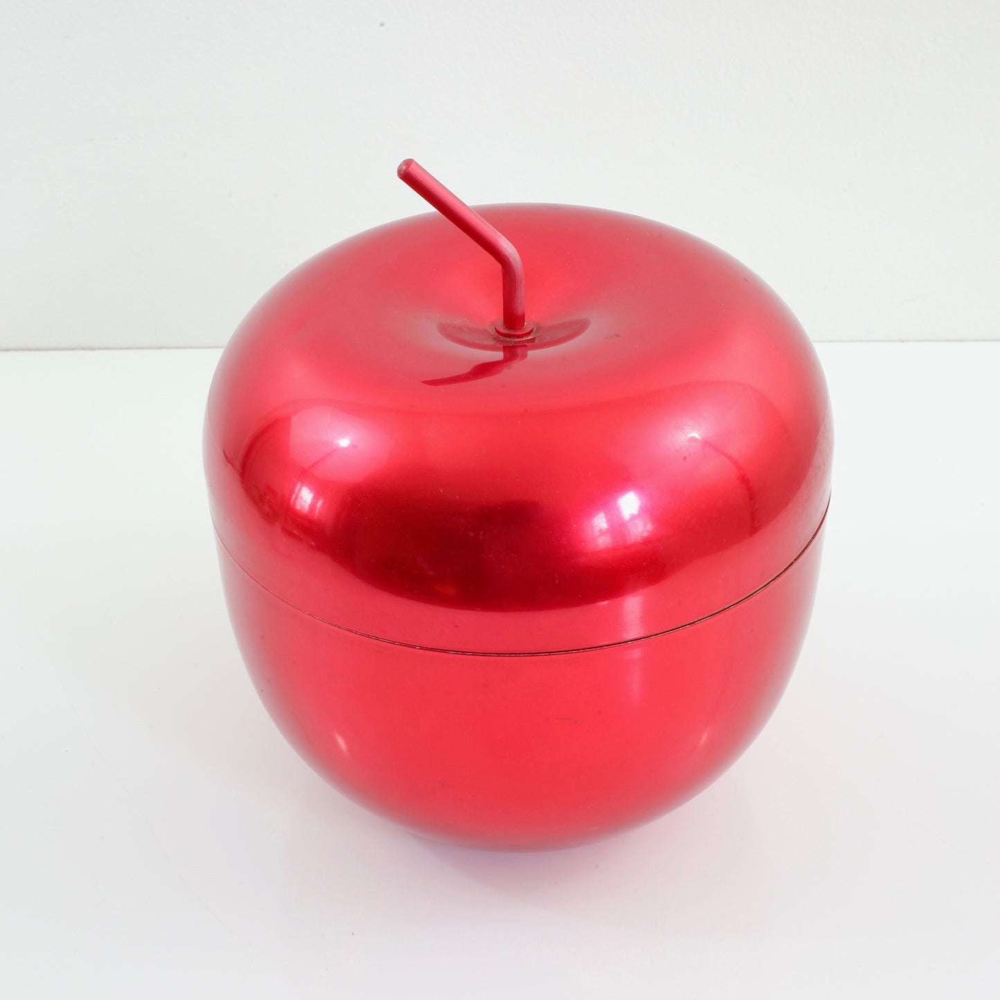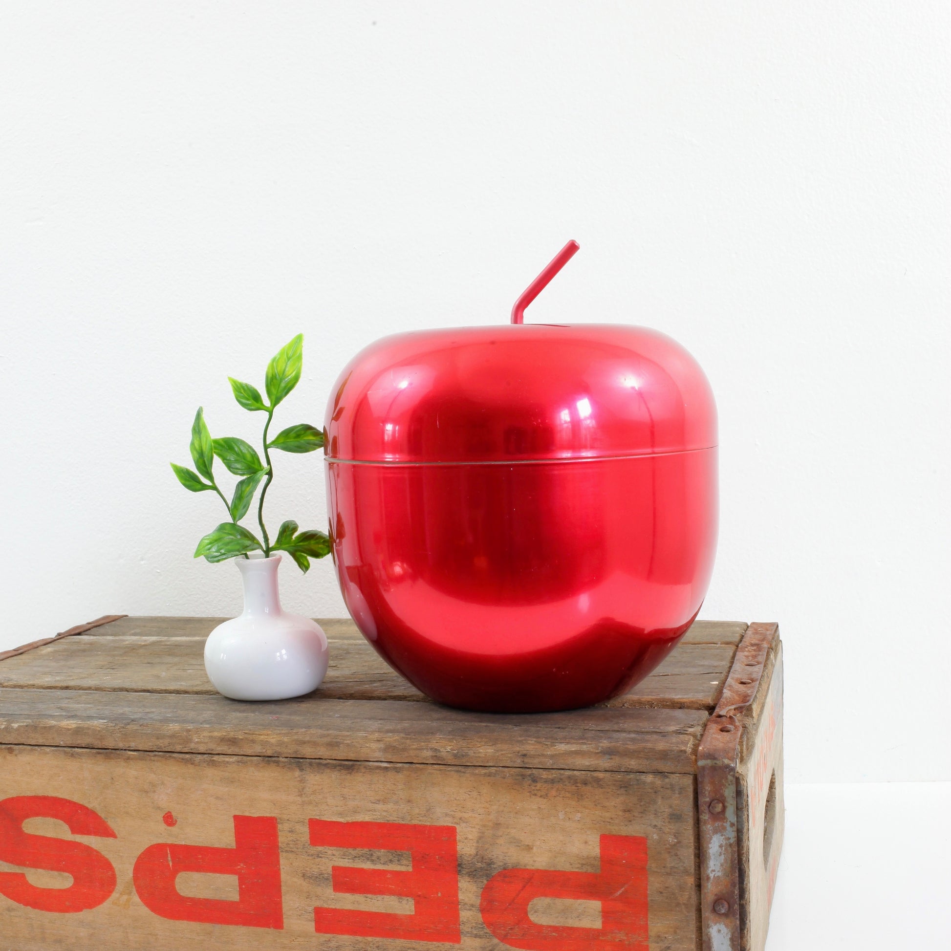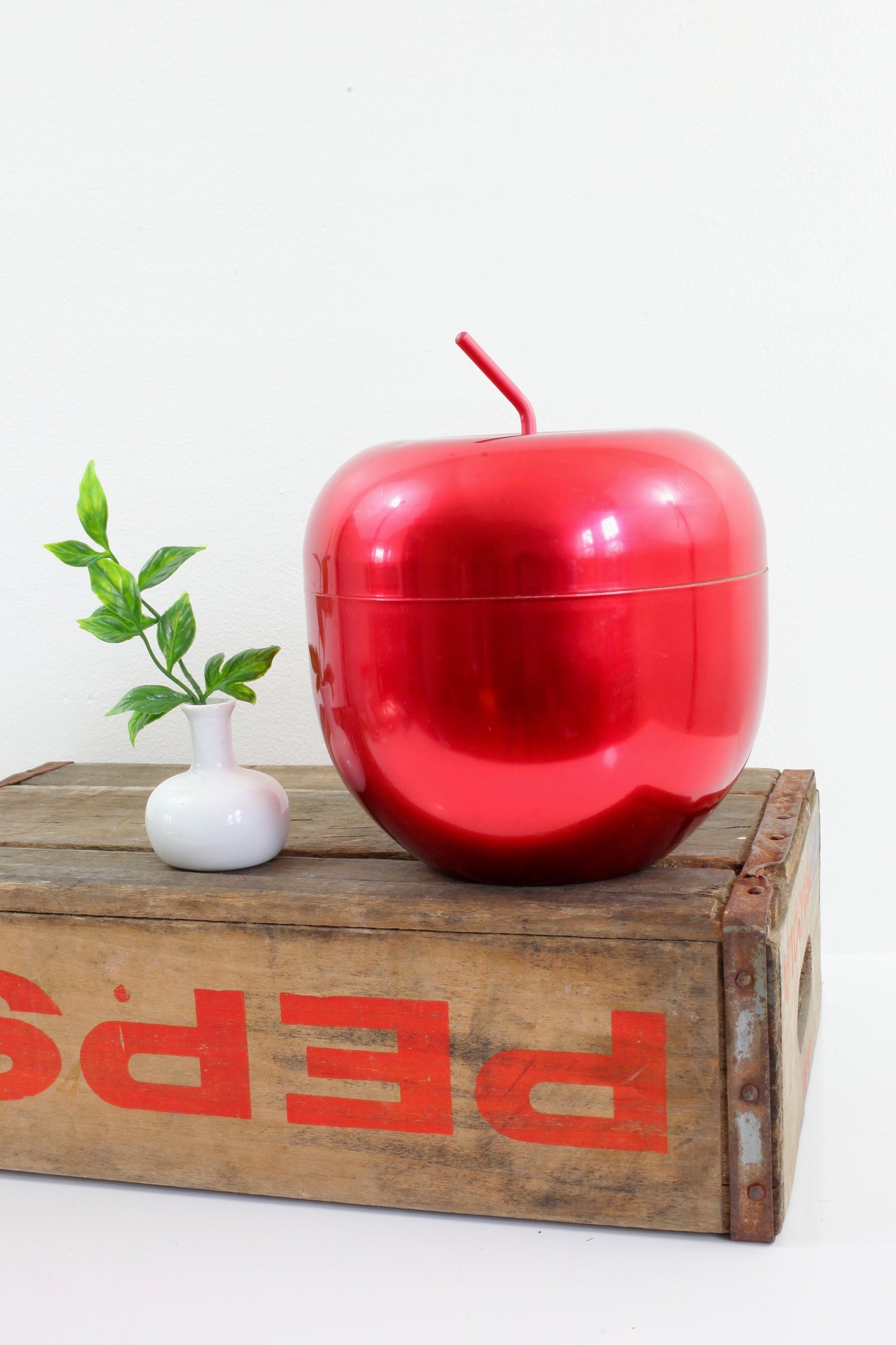 This bright and beautiful vintage apple ice bucket is so unique and fun! Made of anodized aluminum in a rich, gorgeous red color, this beautiful bucket is both fun and functional! Rimmed with hard rubber to help keep the seal extra tight and the ice extra cool! Great for ice cubes, but also makes a fun cookie jar, craft supply canister, or whatever you can dream up! This hard-to-find vintage ice bucket is sure to be the apple of your eye no matter how you use it!