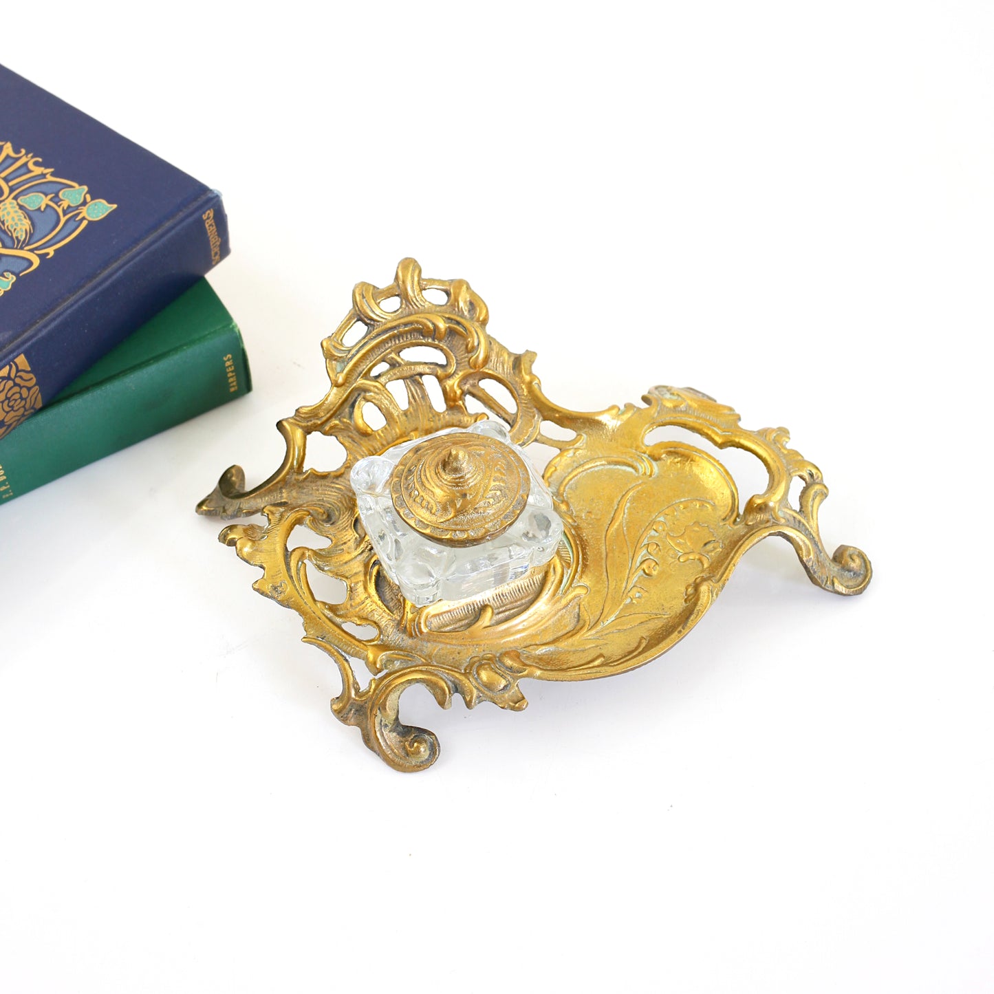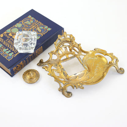 SOLD - Vintage Art Nouveau Style Brass & Glass Inkwell