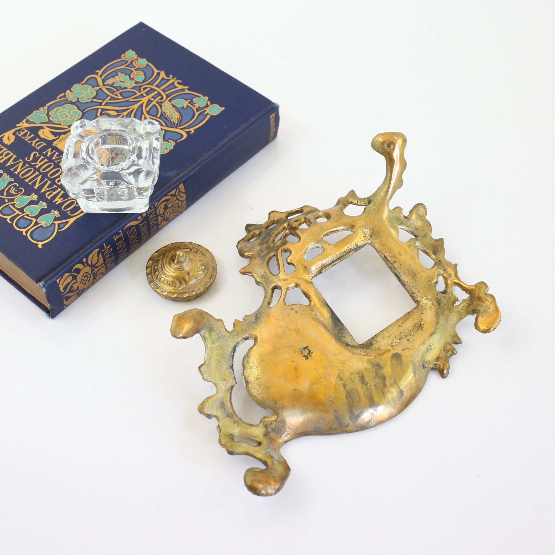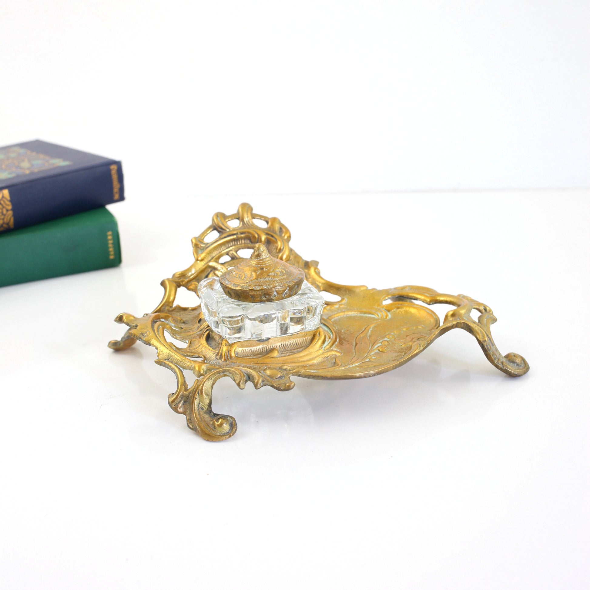 This stunning vintage brass and glass inkwell is just so lovely! The Art Nouveau-style stand is made of golden brass with an absolutely gorgeous patina, and the glass inkwell rests in the stand (complete with its little brass lid). Perfect for adding a bit of vintage charm to your desk or shelf!
