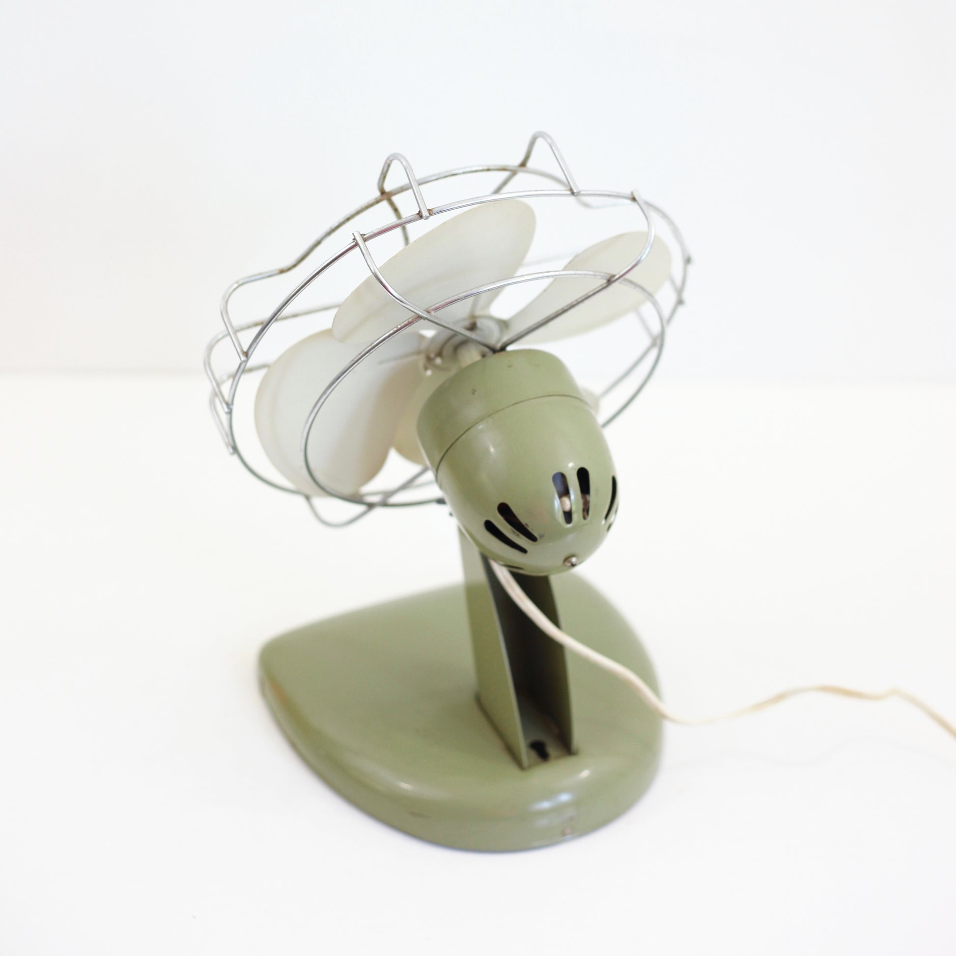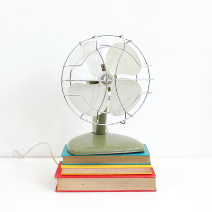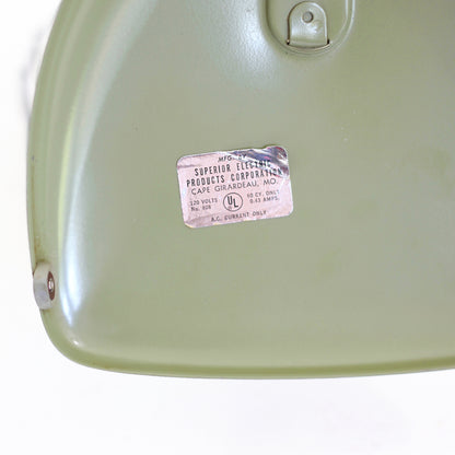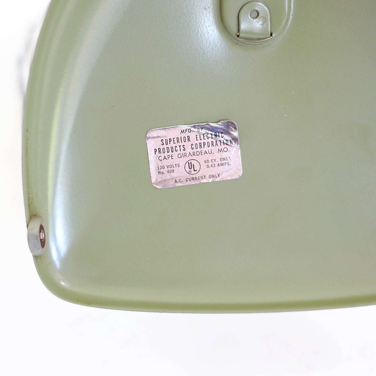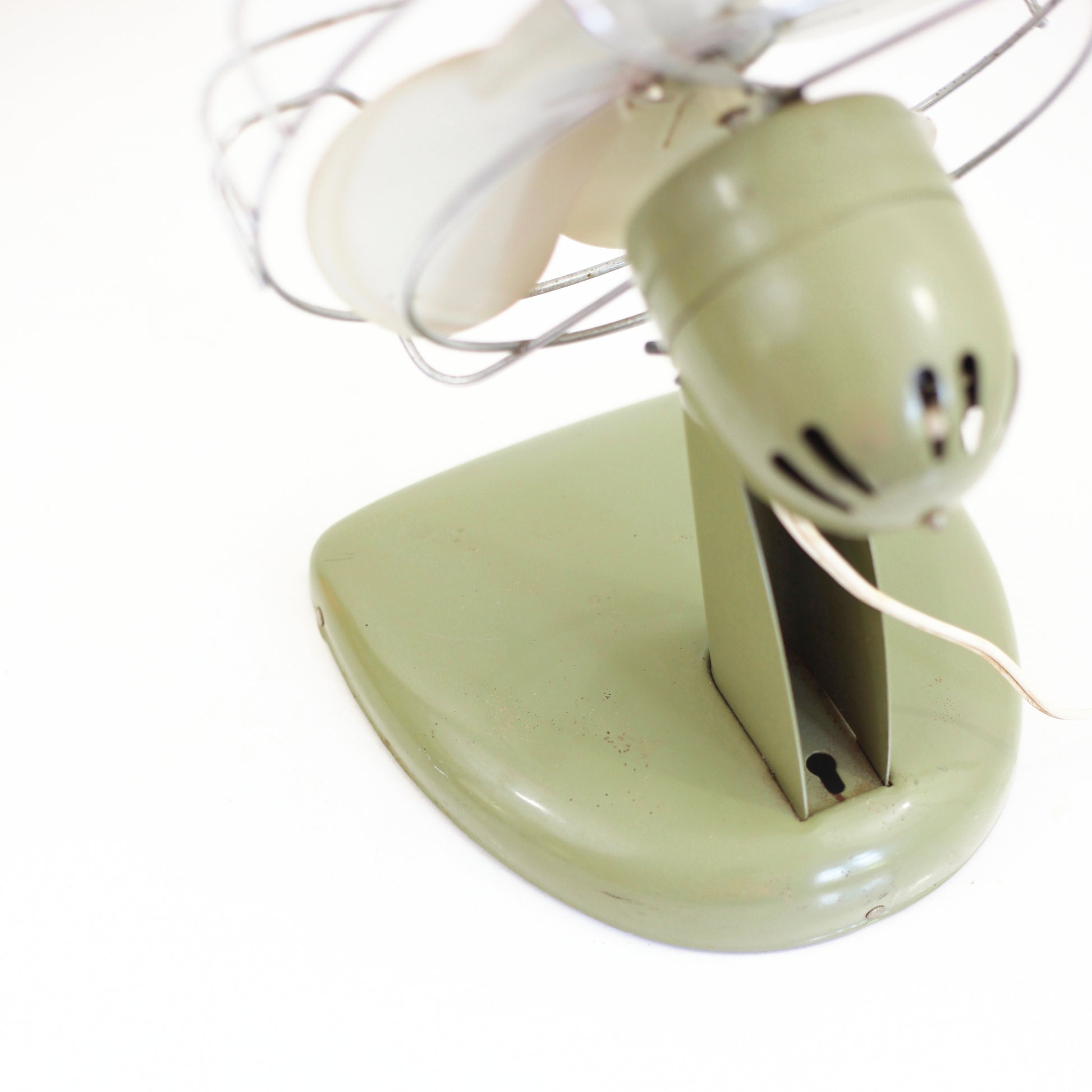 This gorgeous mid century electric fan is absolutely FAN-tastic! Made in the 1960s by Superior Electric Co. With a solid metal body in a lovely shade of avocado green, a shiny silver metal protector, and creamy white metal fan blades, this little beauty is ready to cool you off and look good doing it. Works perfectly!