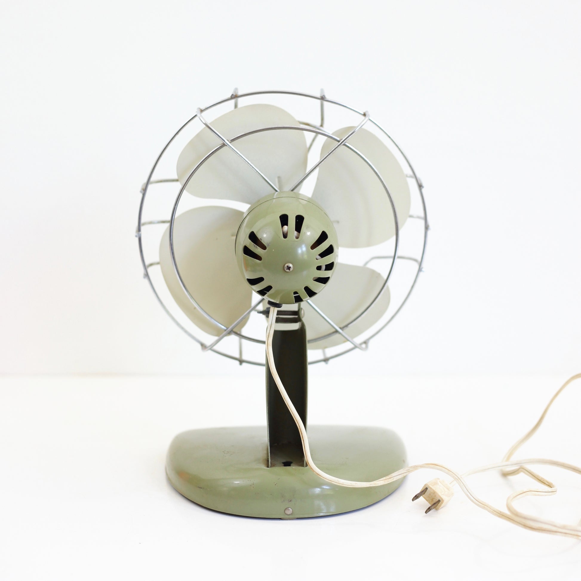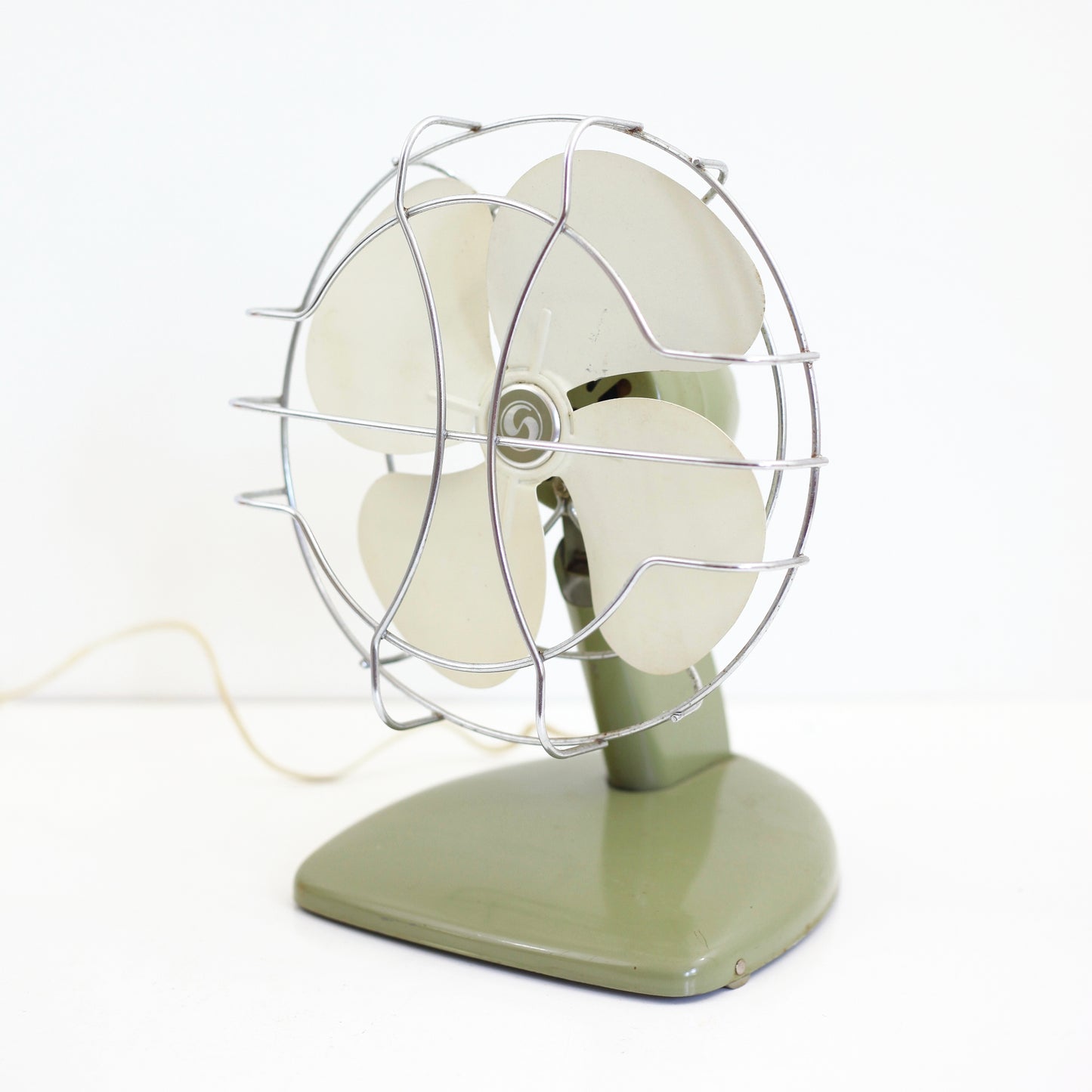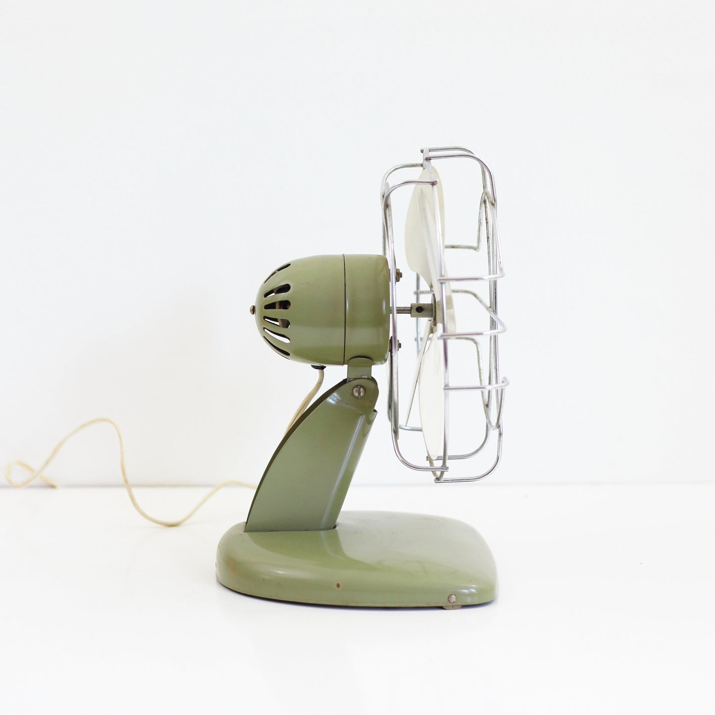This gorgeous mid century electric fan is absolutely FAN-tastic! Made in the 1960s by Superior Electric Co. With a solid metal body in a lovely shade of avocado green, a shiny silver metal protector, and creamy white metal fan blades, this little beauty is ready to cool you off and look good doing it. Works perfectly!