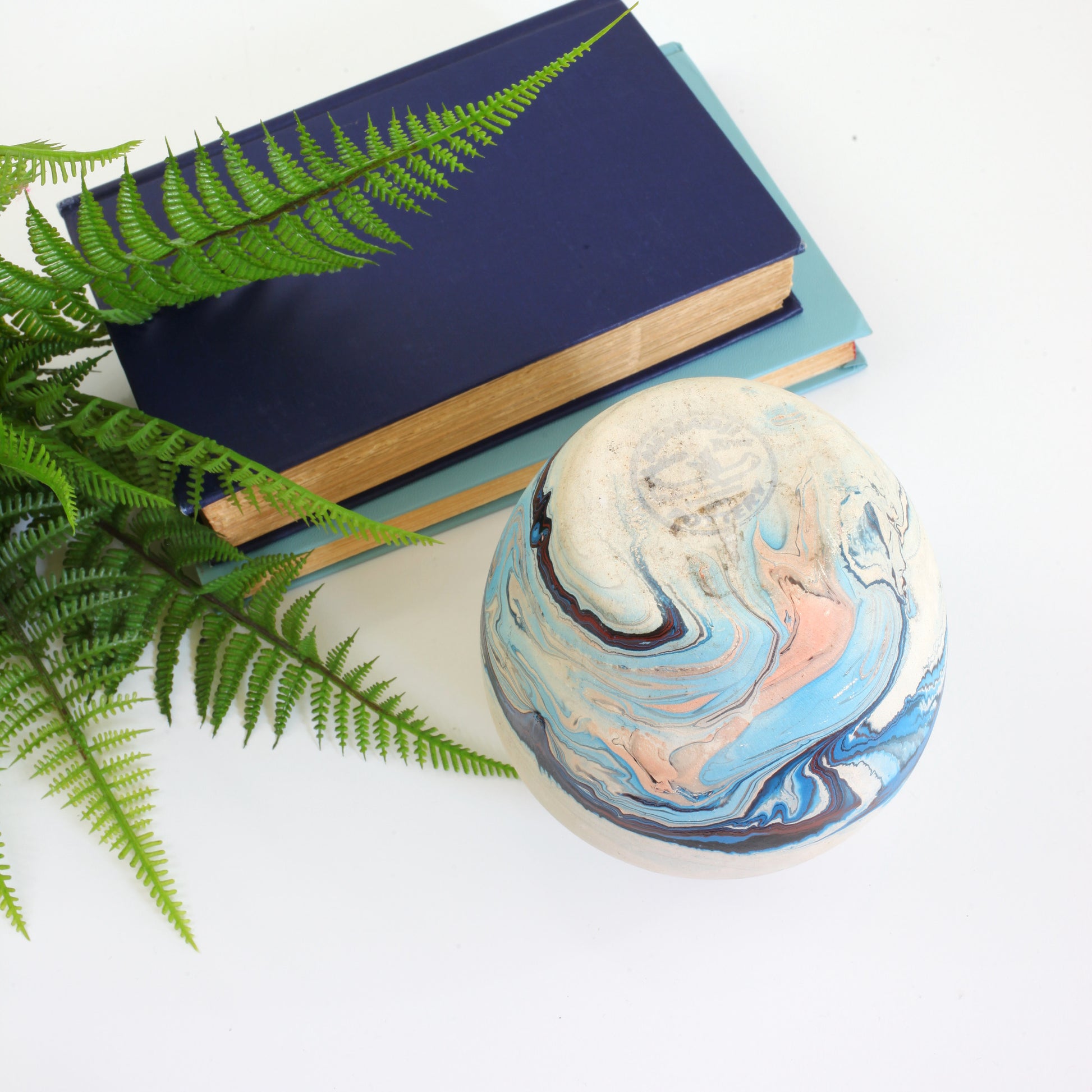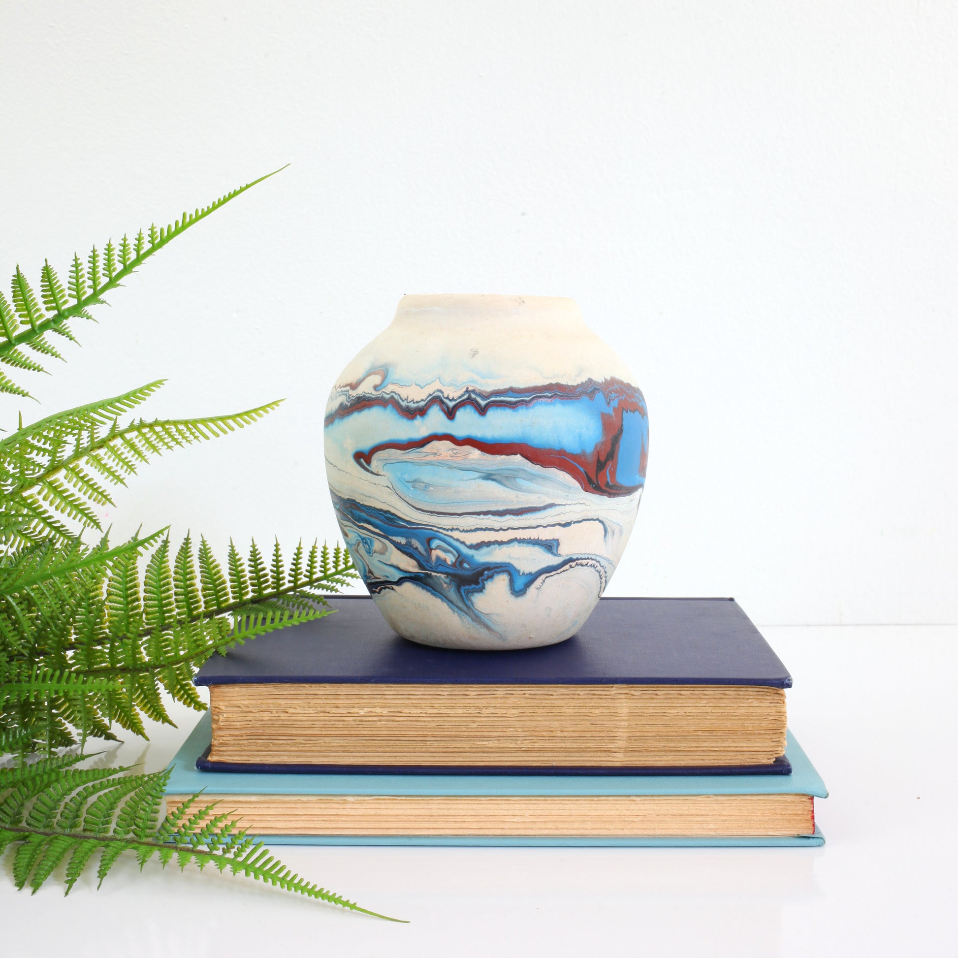 This absolutely gorgeous hand made Nemadji pottery vase is a real stunner! Made of off-white clay with a striking marbleized swirl pattern in rich, saturated hues of blue with pops of deep maroon. The matte finish gives this piece such a warm, earthy feel, and really helps those swirling colors pop. A truly beautiful one-of-a-kind piece!