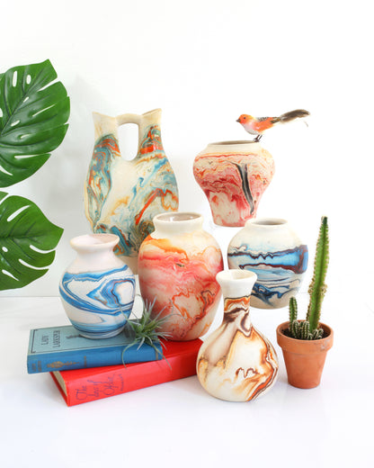 This absolutely gorgeous hand made Nemadji pottery vase is a real stunner! Made of off-white clay with a striking marbleized swirl pattern in rich, saturated hues of blue with a few small pops of rust orange. The matte finish gives this piece such a warm, earthy feel, and really helps those swirling colors pop. A truly beautiful one-of-a-kind piece!