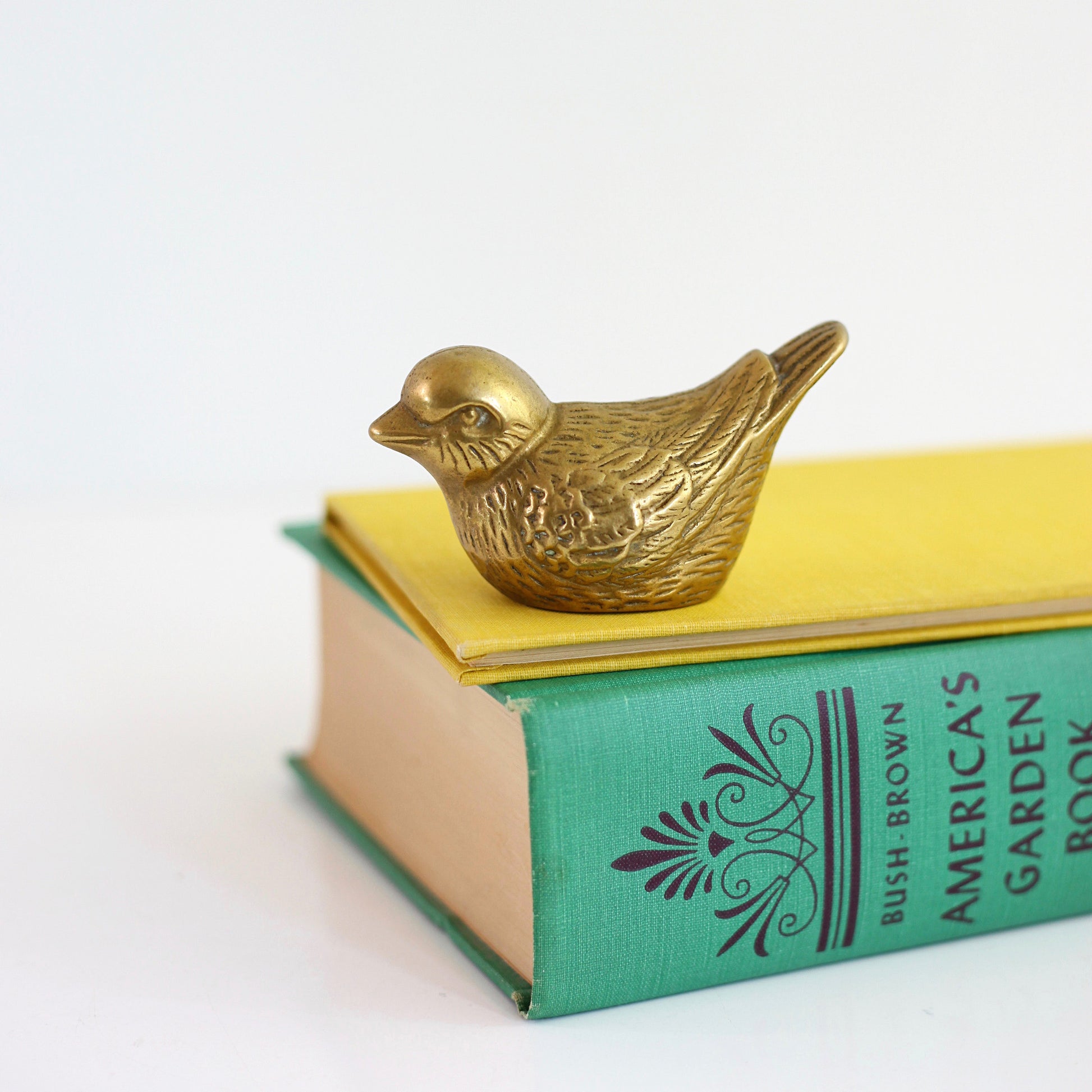 This sweet vintage brass bird figurine is just so cute! With great details and a gorgeous golden patina, this little feathered friend is ready to perch upon your desk or bookshelf. The perfect way to add a bit of vintage woodland charm to your decor!