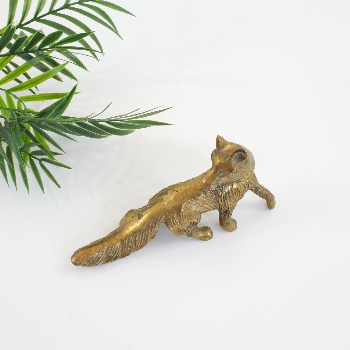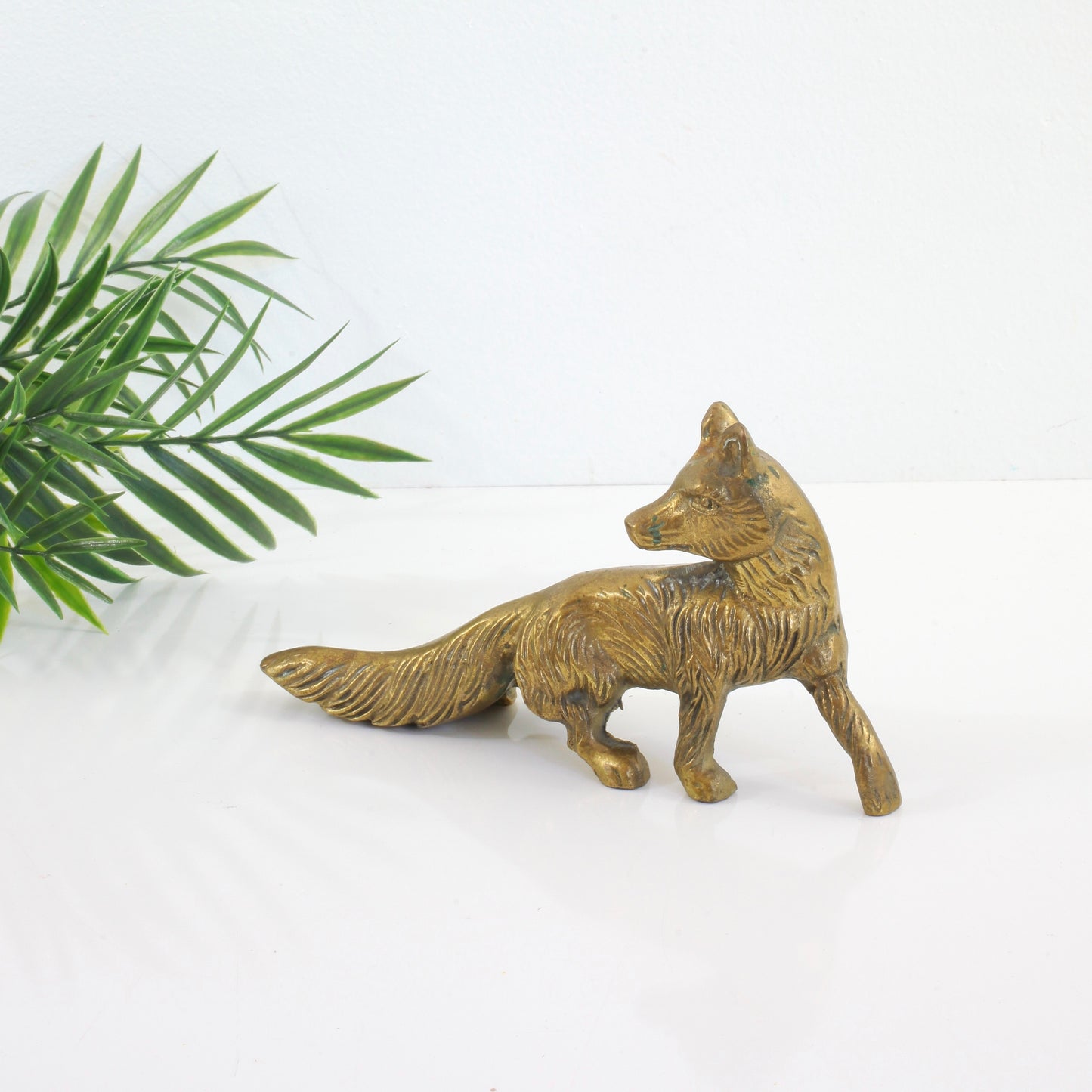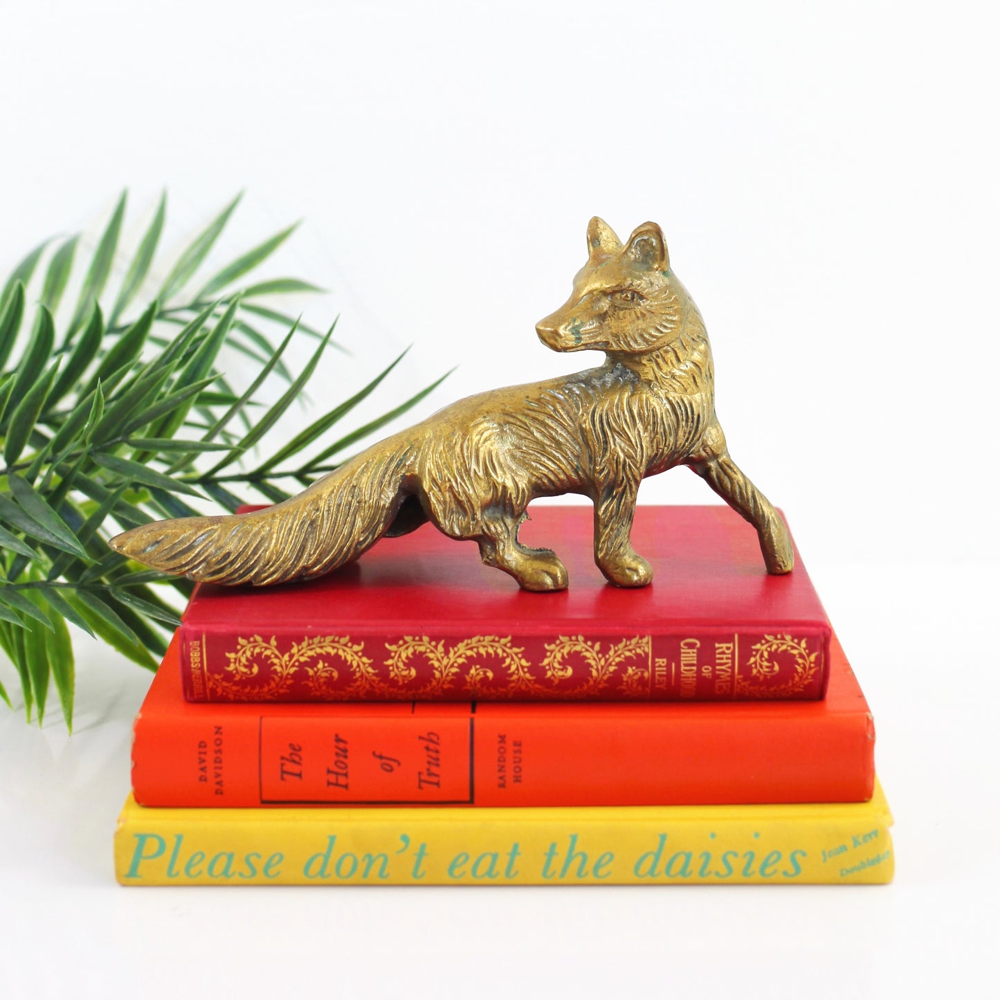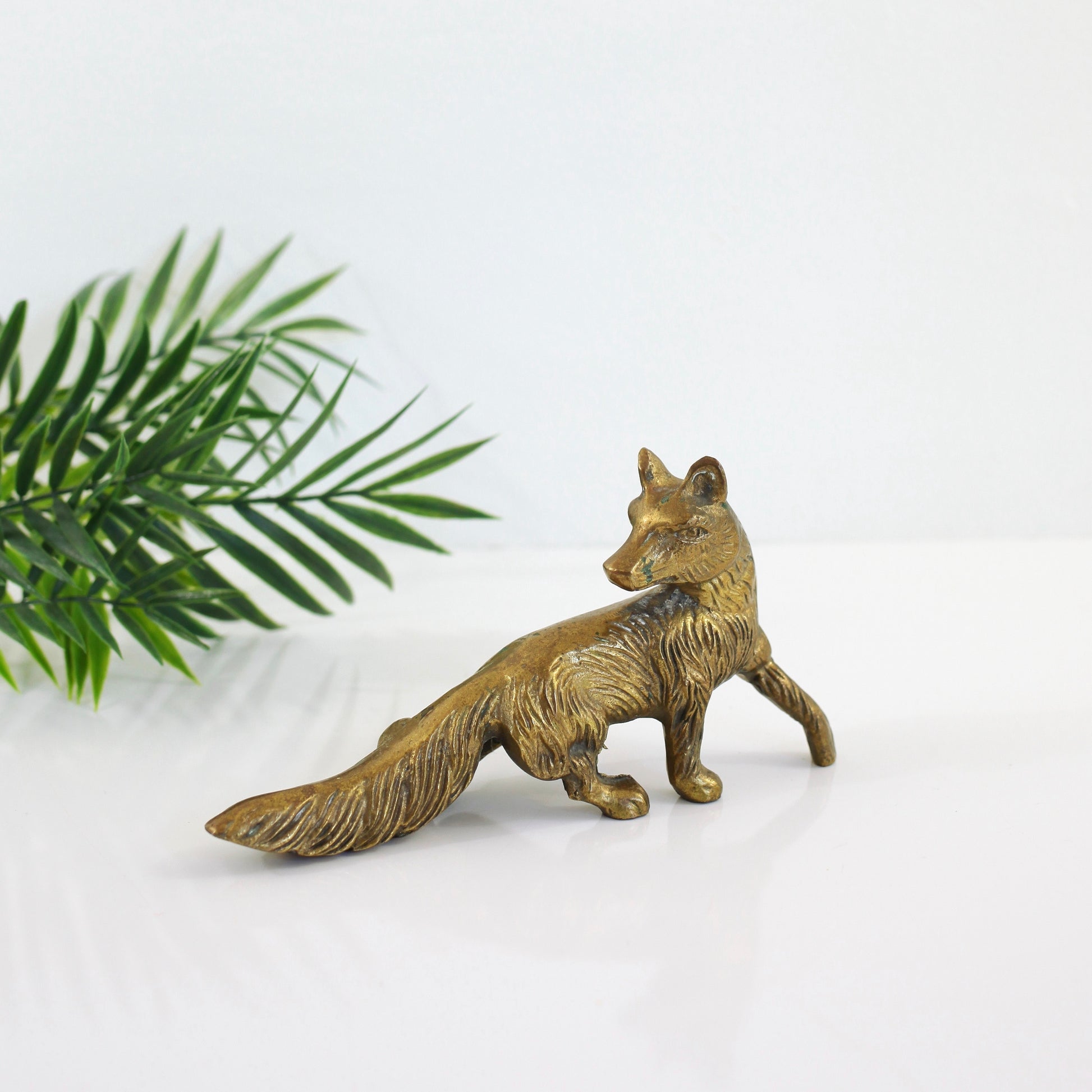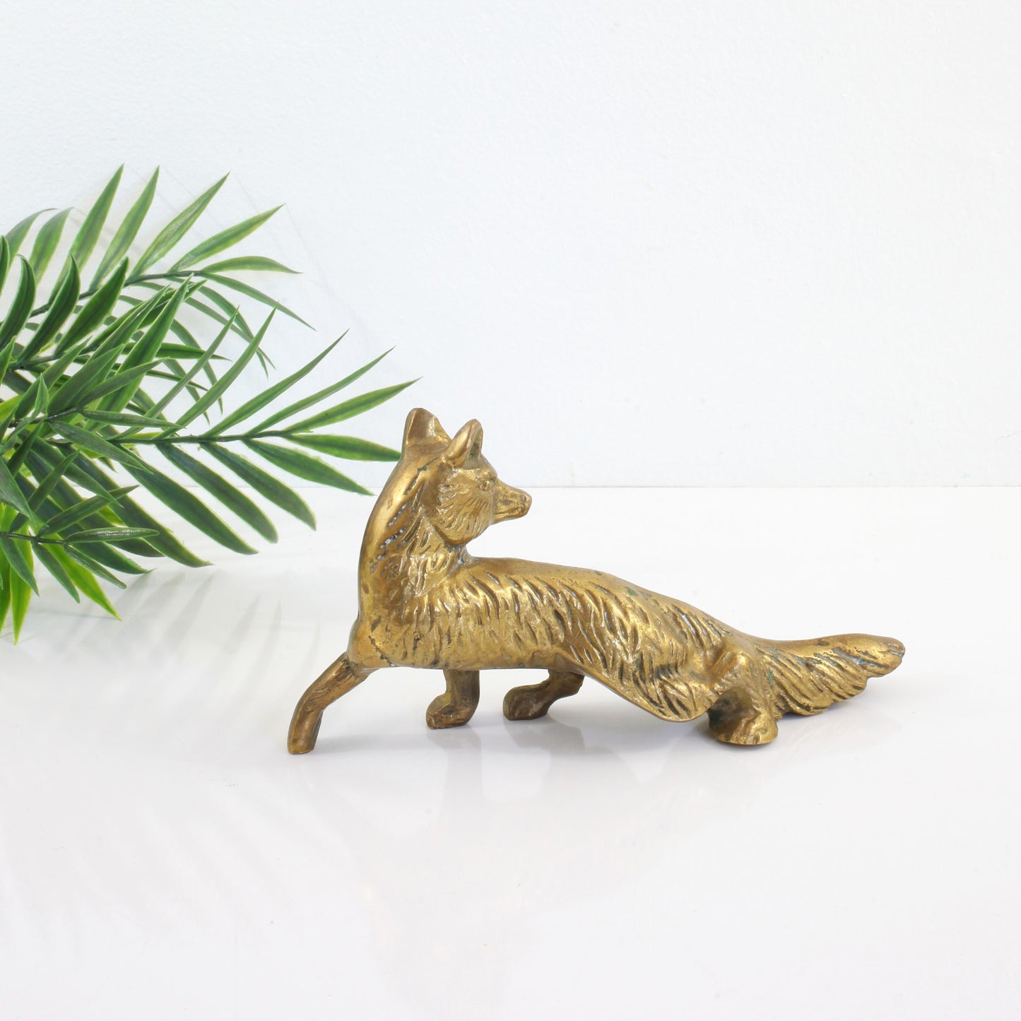This gorgeous vintage brass fox figurine is so unique and beautiful! With a dreamy golden patina and lovely details, this handsome solid brass fox makes a perfect paperweight on your desk or a fun pop of vintage charm for your dresser or bookshelf.