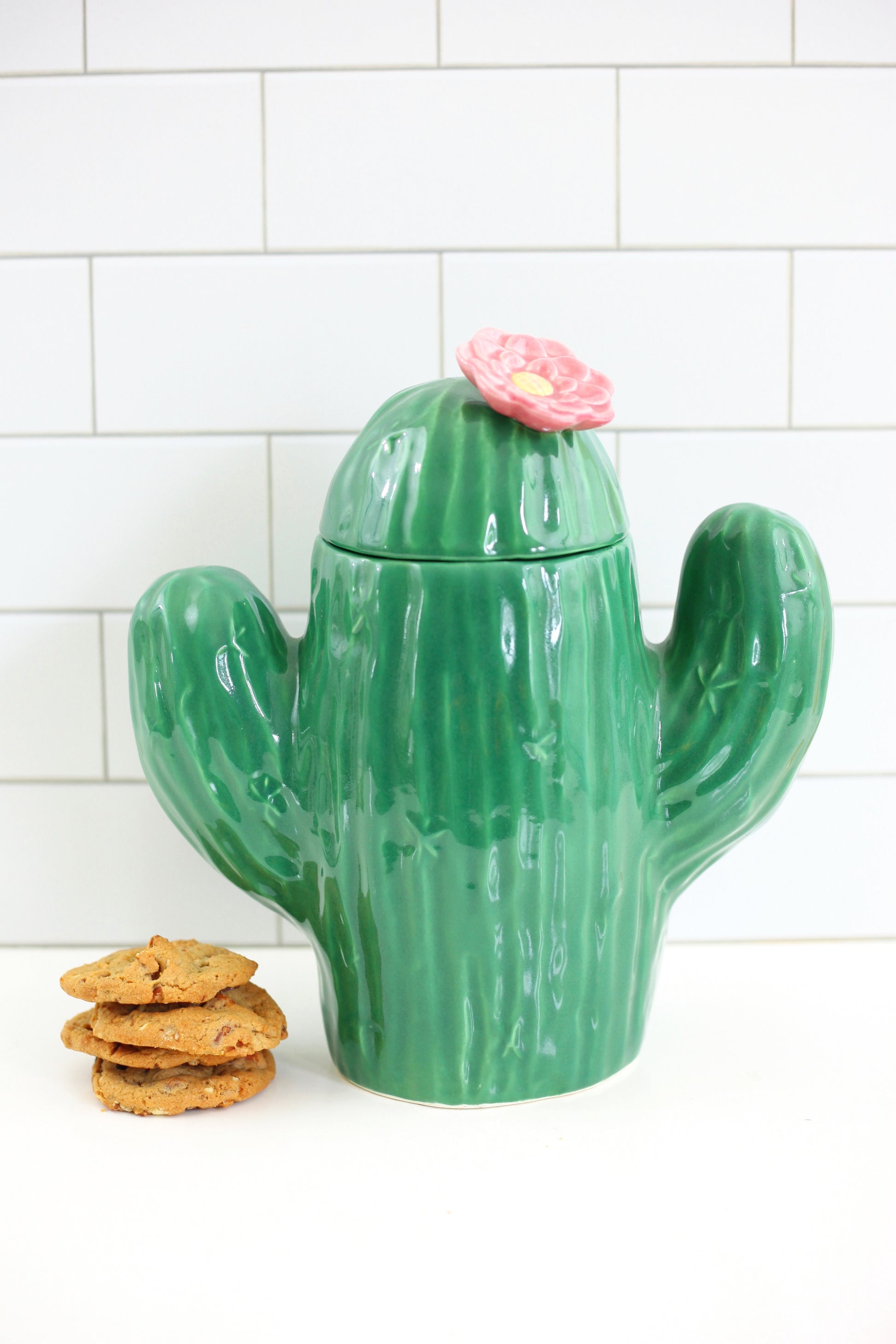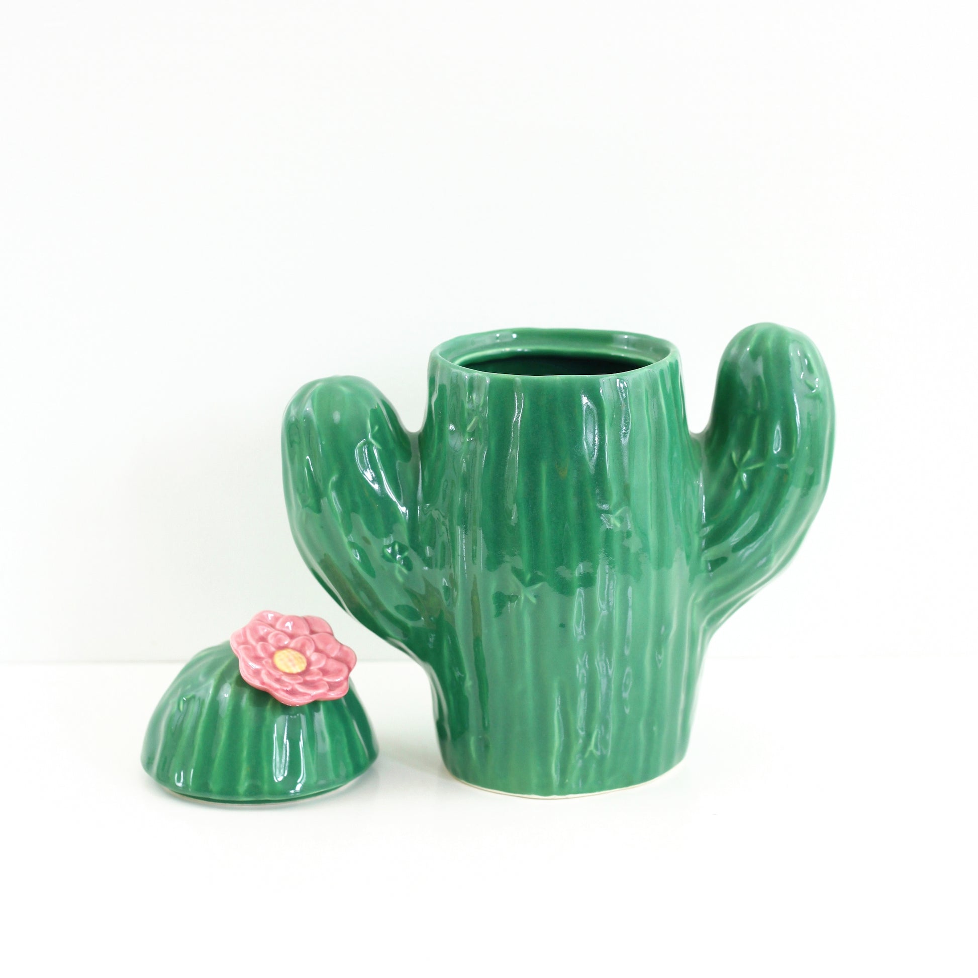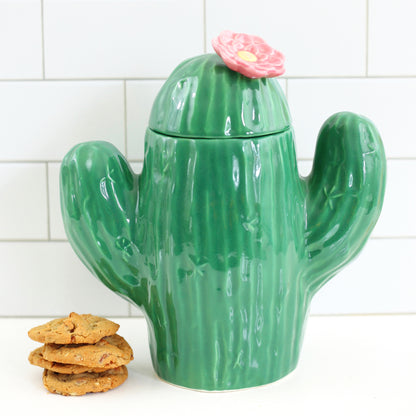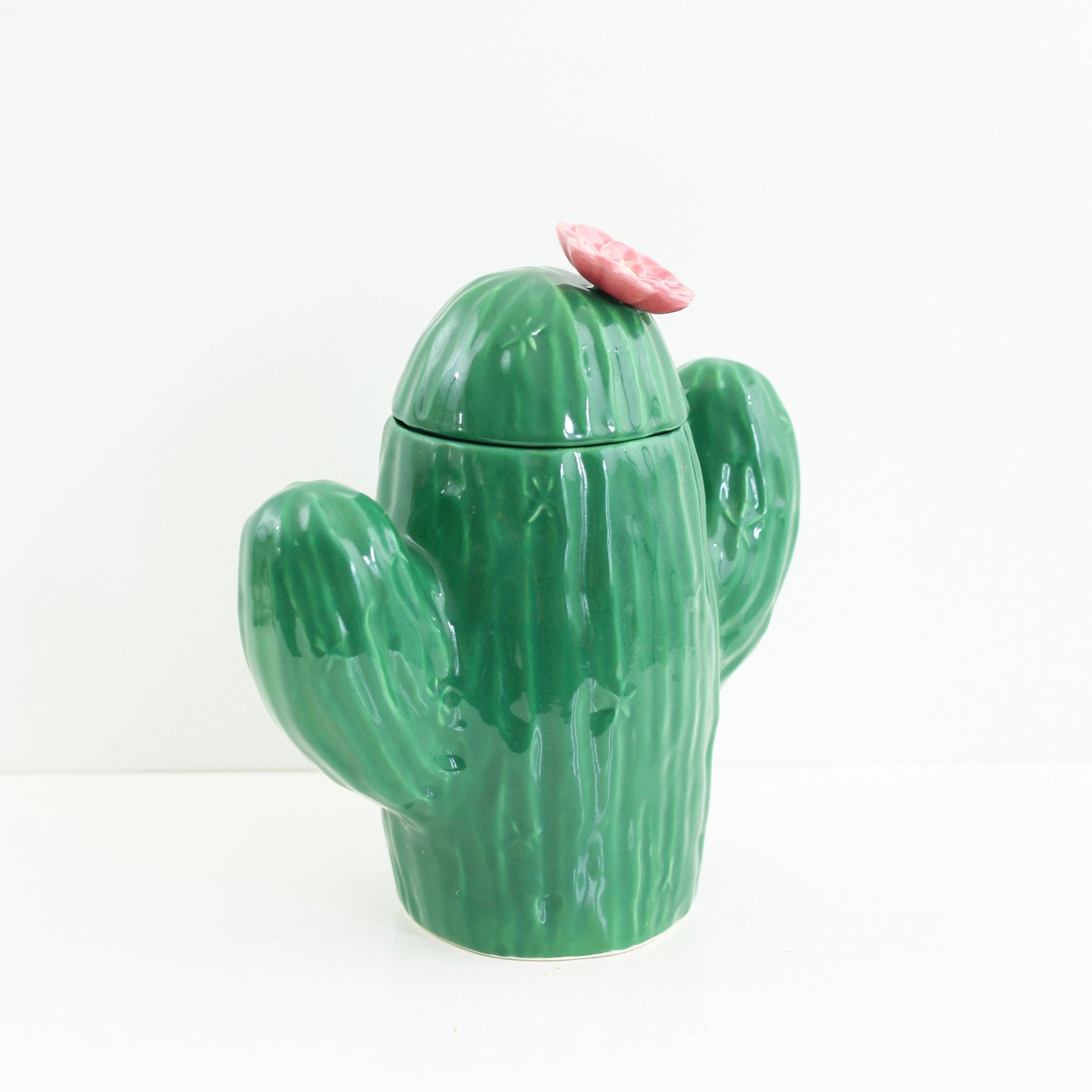 Feeling a little prickly? Then why not grab a cookie from this adorable vintage cactus cookie jar! Made in the USA by Treasure Craft, this sweet saguaro cactus features a rich emerald green body and a pretty pink blossom on the lid. Perfect for keeping cookies, and just as fun stashing craft supplies, or whatever you can dream up!