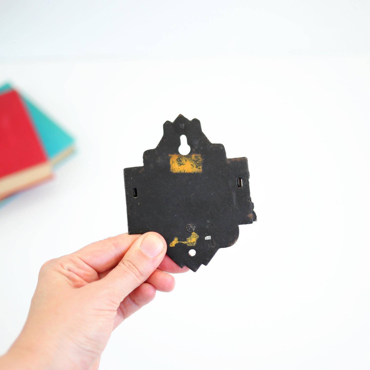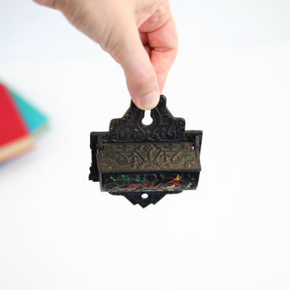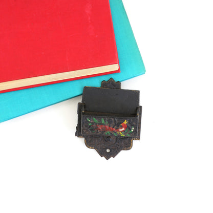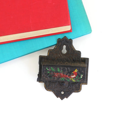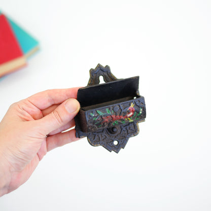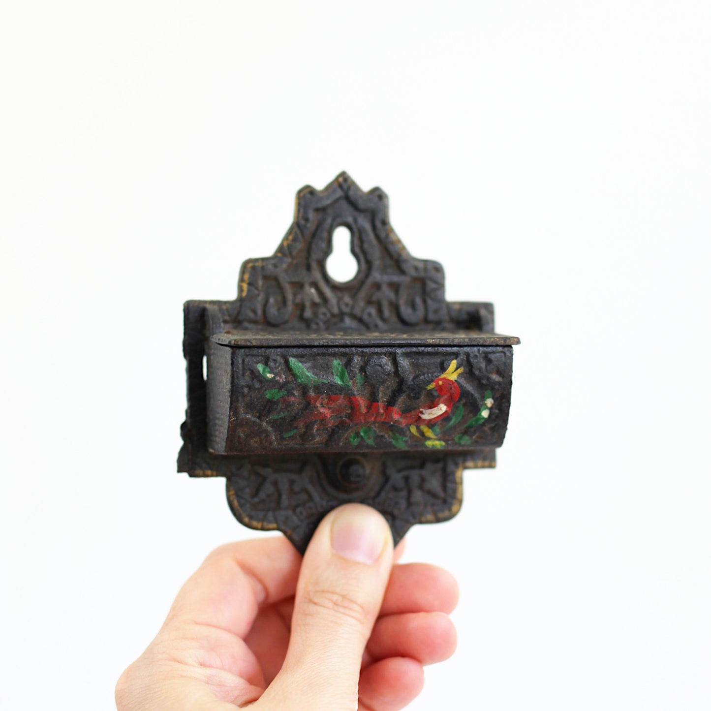 This fun vintage cast iron match holder is so sweet! Made of sturdy cast iron with a lovely hand painted folk art bird, this lidded match safe can be mounted to your wall and would make a wonderful addition to your vintage kitchen!