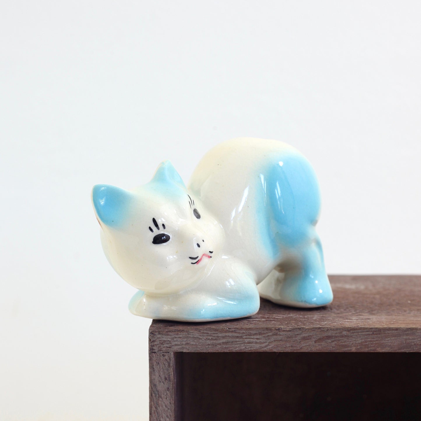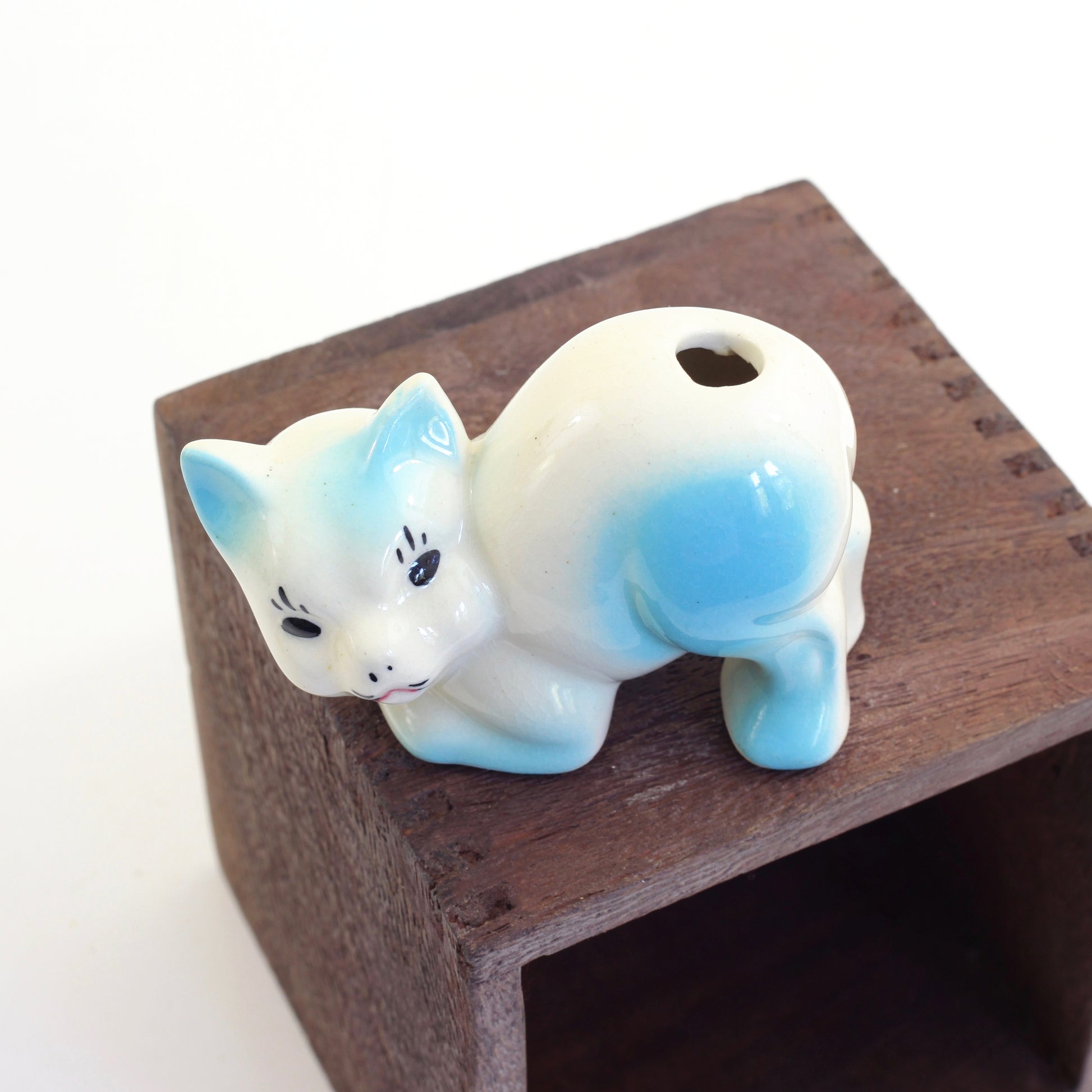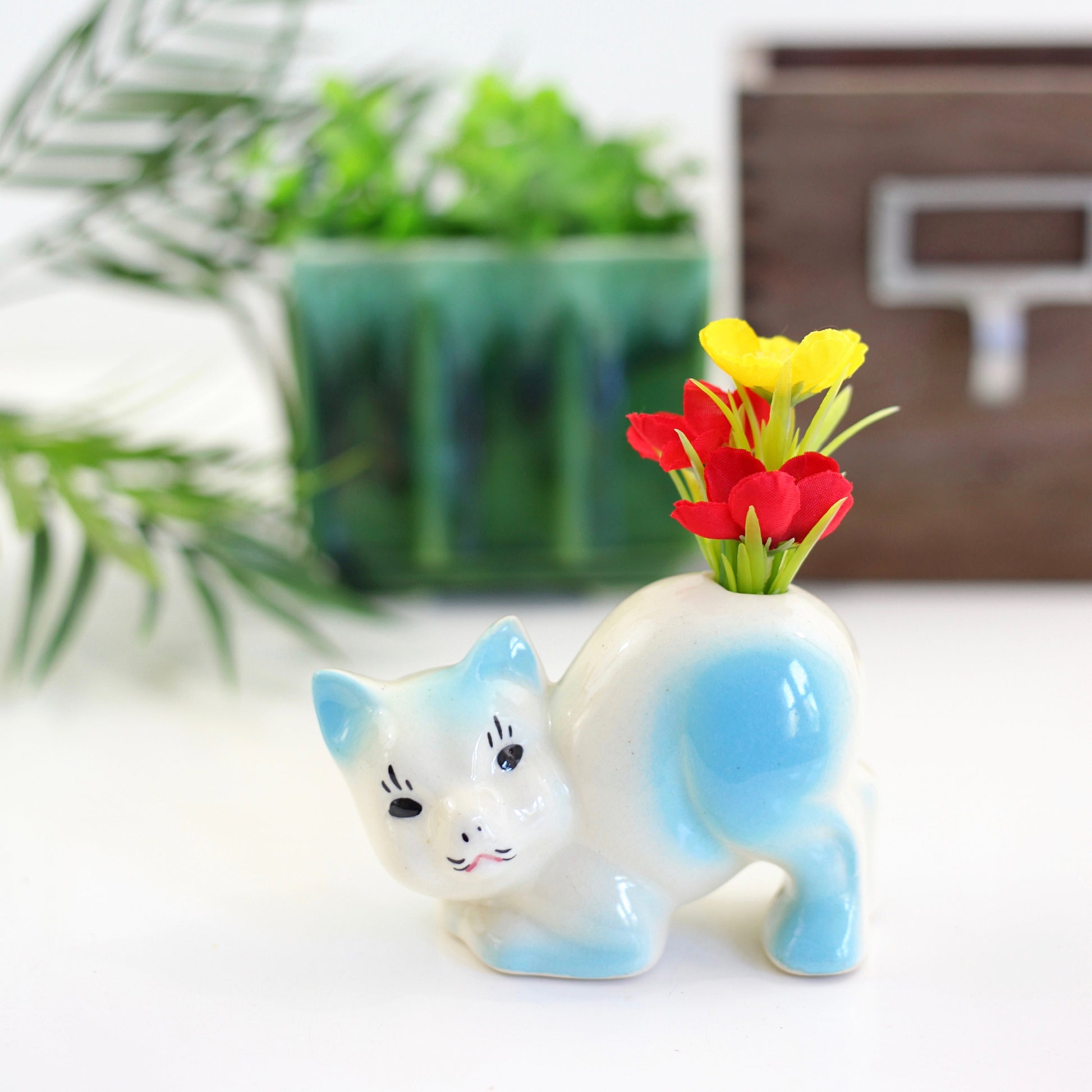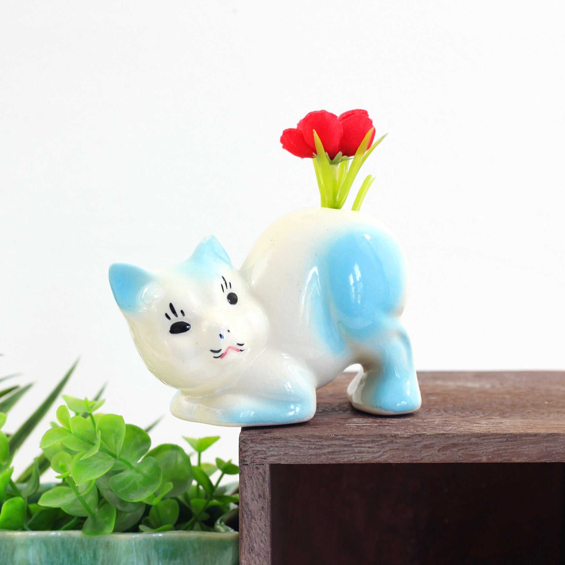 This absolutely adorable vintage kitty is just so sweet! Made in the 1950s, this planter is as fun as it is useful! The placement of the opening on this cat means whatever you put inside magically turn into kitty's tail! Looks cute-as-can-be with flowers, pens and pencils, air plants, or whatever you please! No matter what you do with it, you're sure to love this cat for many years to come - and I'm not 'kitten'!