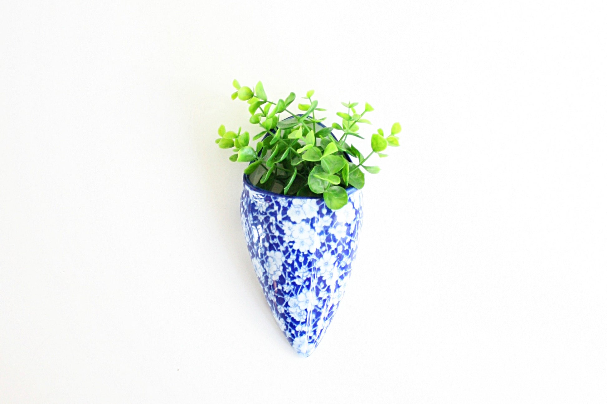 This gorgeous vintage calico wall pocket is so bright and lovely! Made of sturdy ceramic with a beautiful calico or chinoiserie floral print in rich cobalt blue against bright white, this pocket is timelessly charming. Perfect for holding plants, odds and ends, kitchen tools, or whatever you can dream up!