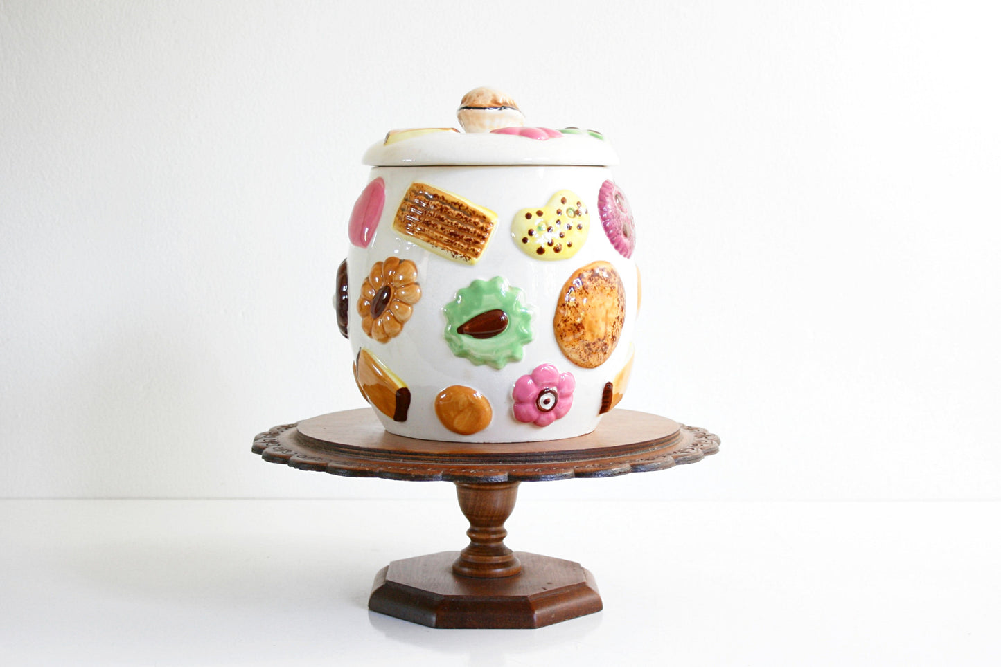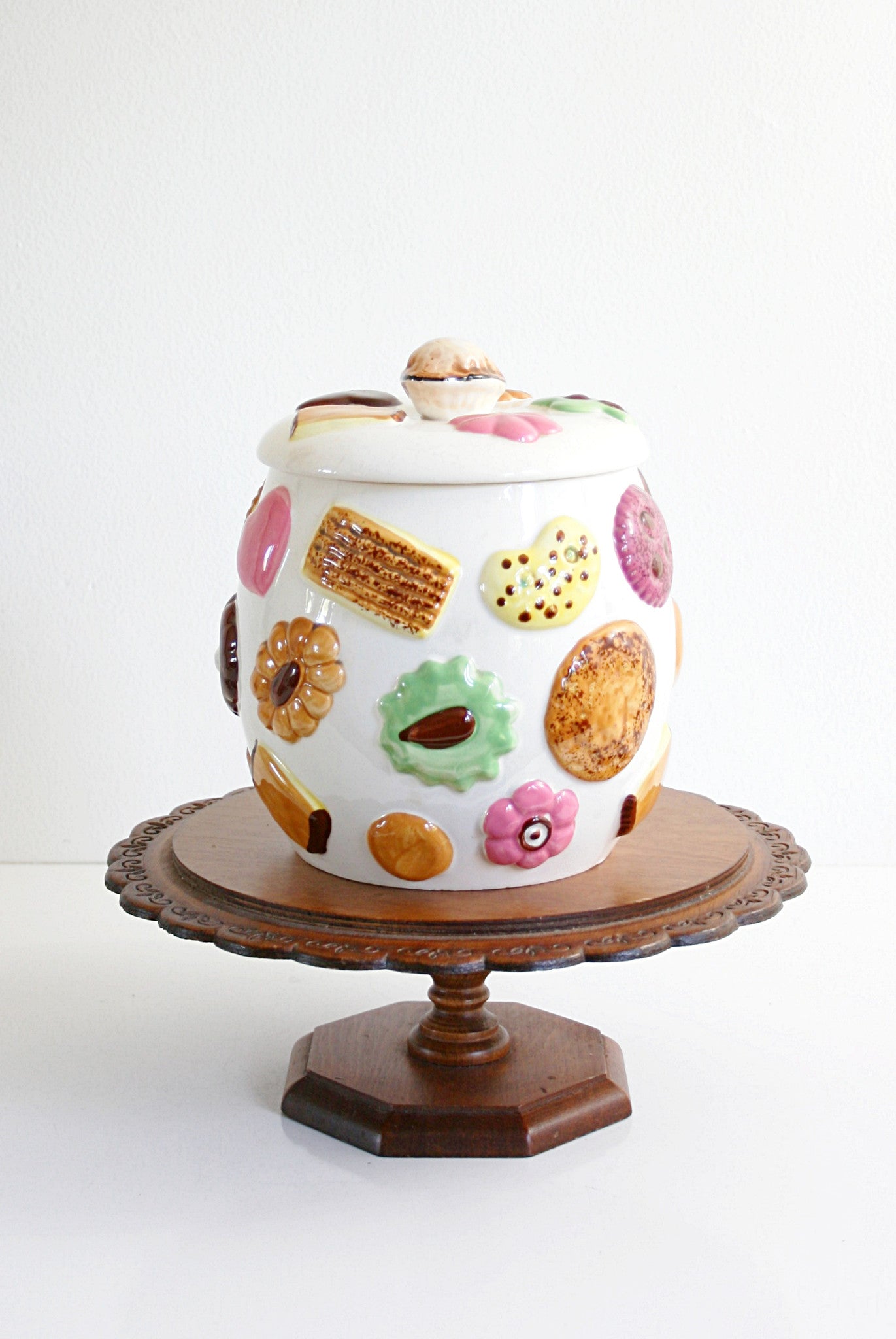 This bright and beautiful vintage ceramic cookie jar is so colorful and fun! Made of sturdy ceramic with a sprinkling of colorful cookies all over, this cookie jar was made by Napco in the 1950s and is in the aptly named 'Cookies All Over' pattern. A mainstay of many, many mid century kitchens, this pattern was even in Betty Draper's kitchen on Mad Men. As fun as it is functional, this canister is perfect for keeping cookies or snacks, but would also be great for storing craft supplies - or just displaying and admiring!
