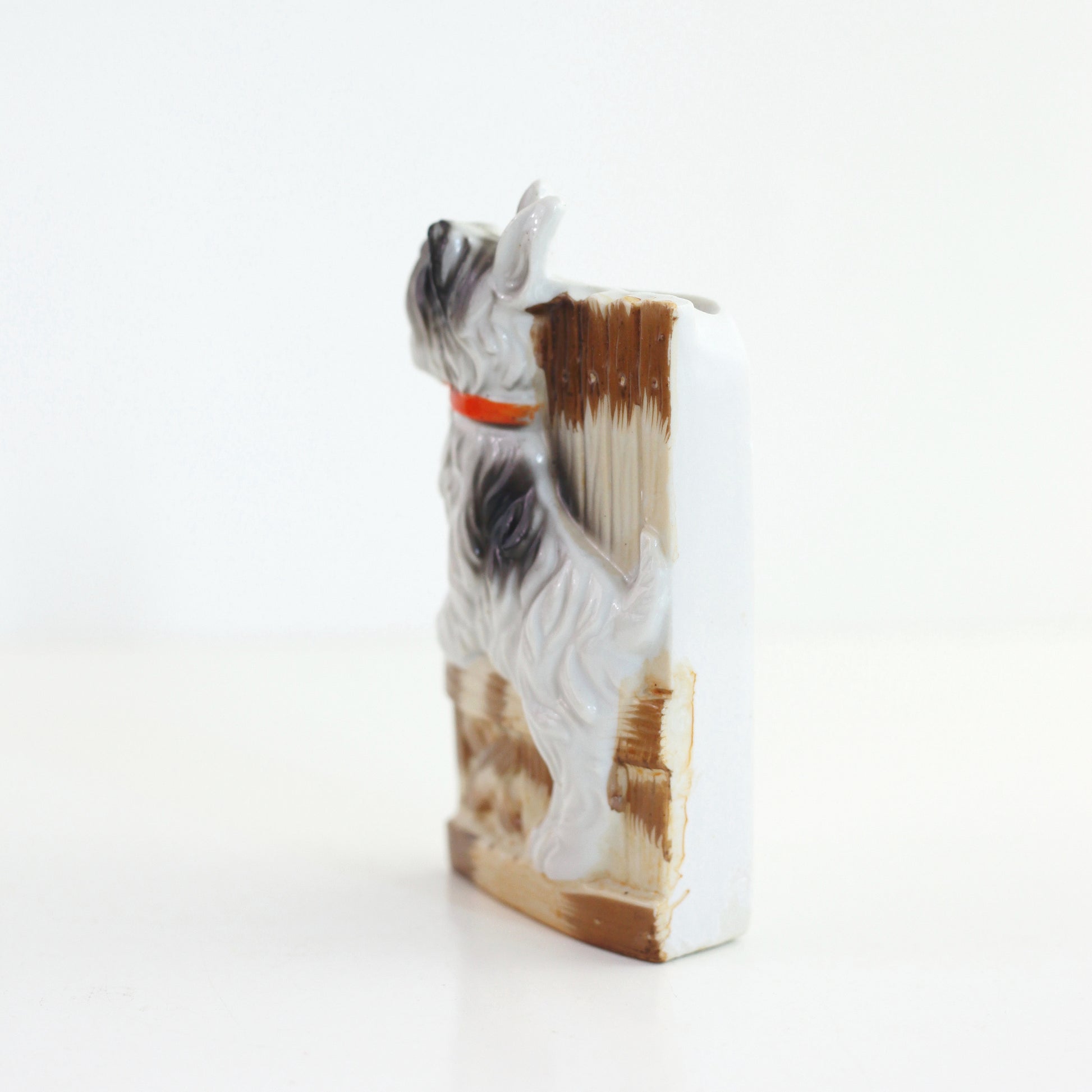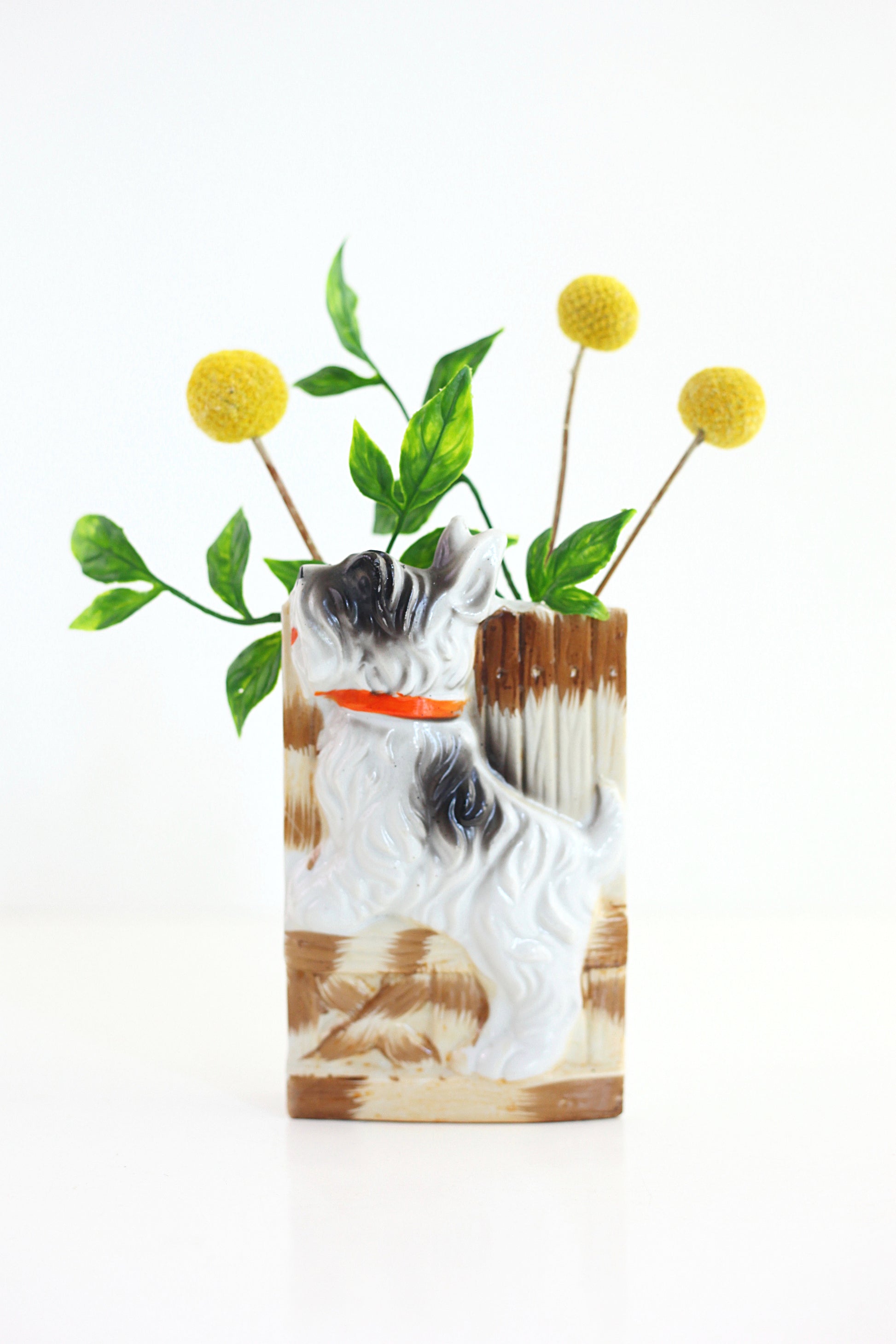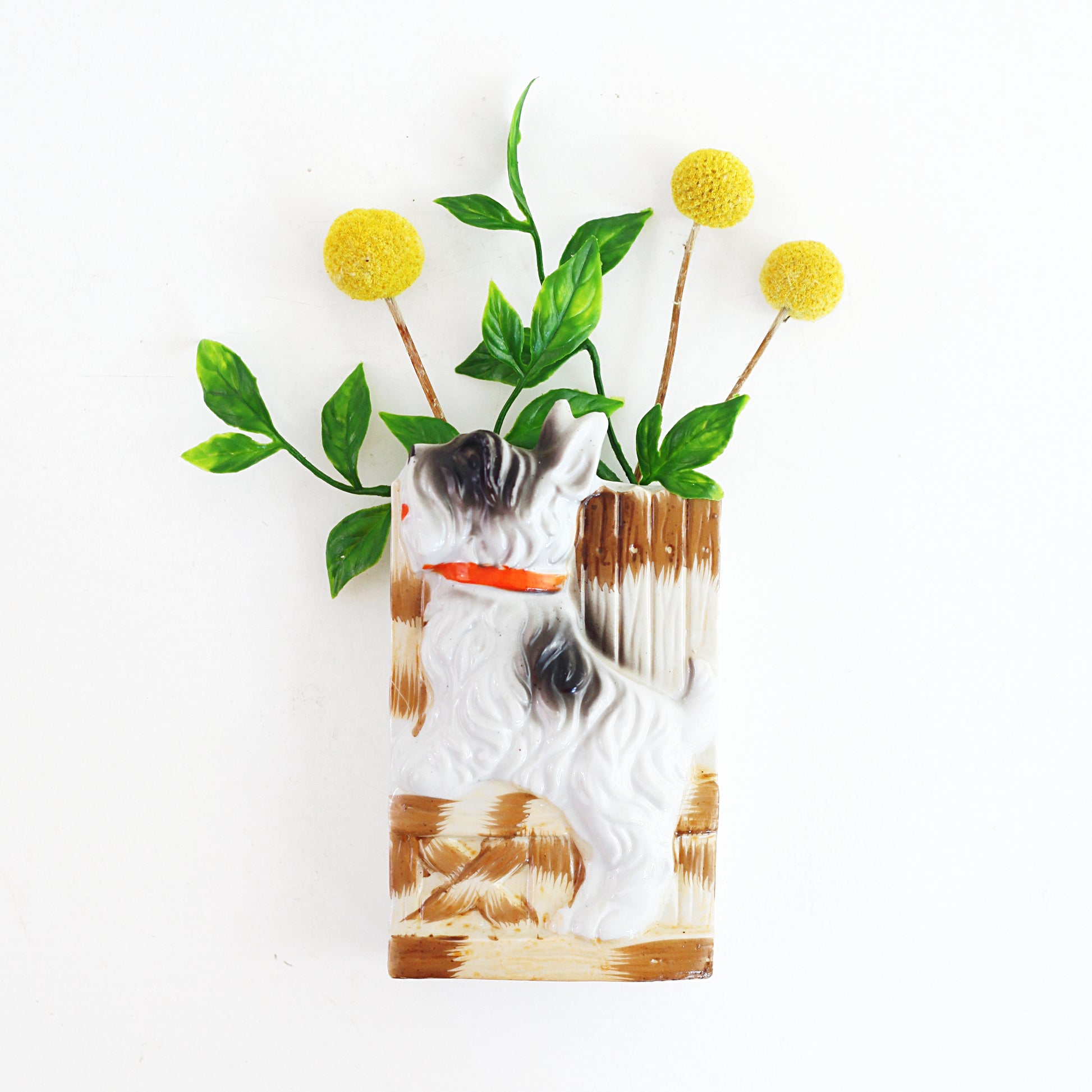 This sweet vintage dog wall pocket from Japan is just so delightful! An adorable hand-painted pooch is happily hopping in front of a fence - you can practically see his little tail wagging! A flat base means you can pop this pup on your wall or set him on your tabletop. Perfect for holding plants, flowers, odds and ends, kitchen tools, or whatever you can dream up - this pocket is so doggone cute, it's sure to make you smile no matter what you use it for!