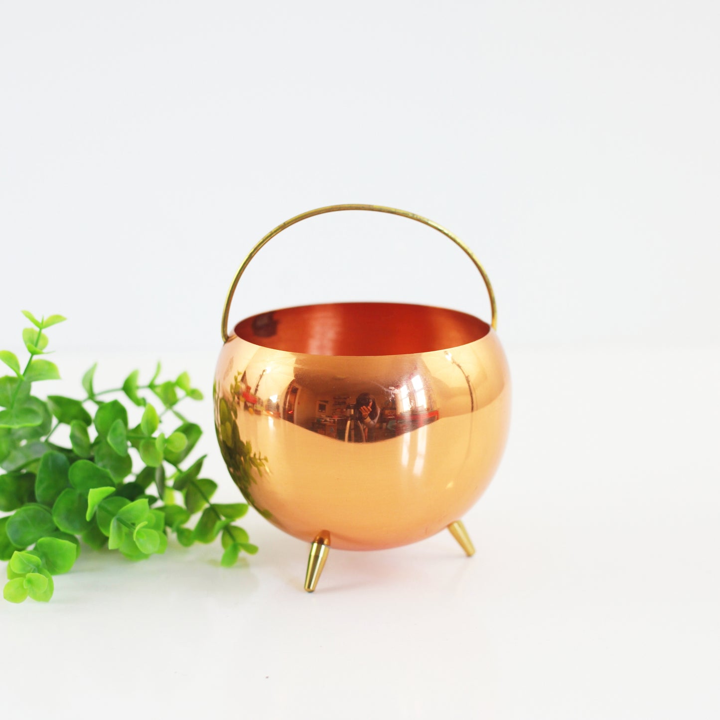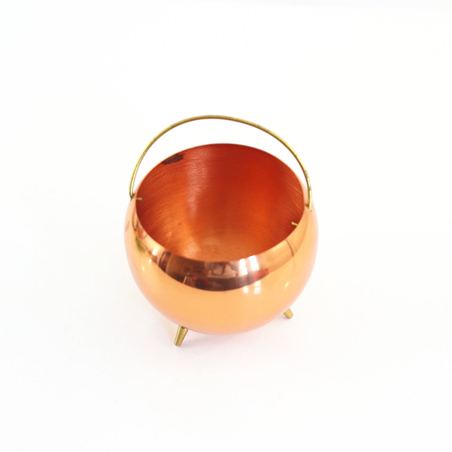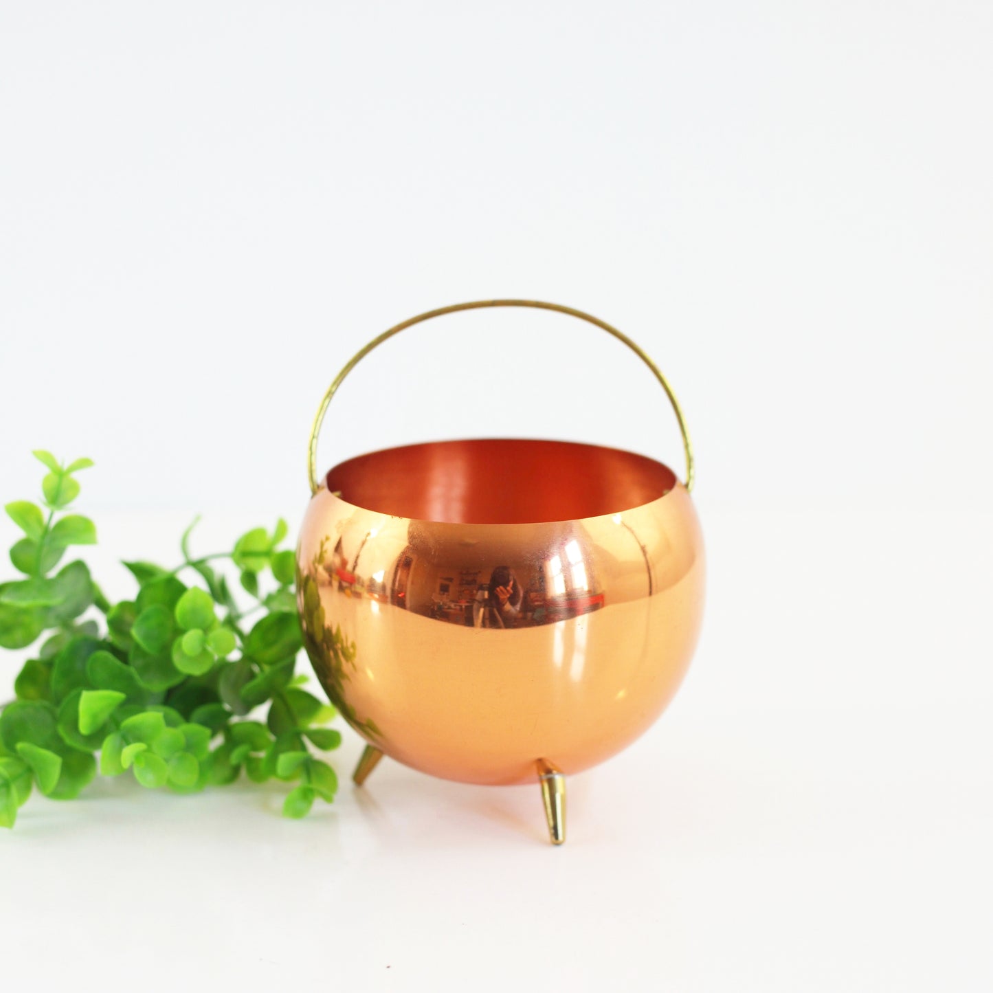 This beautiful mid century copper and brass footed planter pot by Coppercraft Guild is just so sweet! With a beautiful copper body, a brass handle, and three little brass feet, this handsome pot is ready to hold an extra special plant - or whatever else you can dream up! Hard to find this larger size in such great condition!