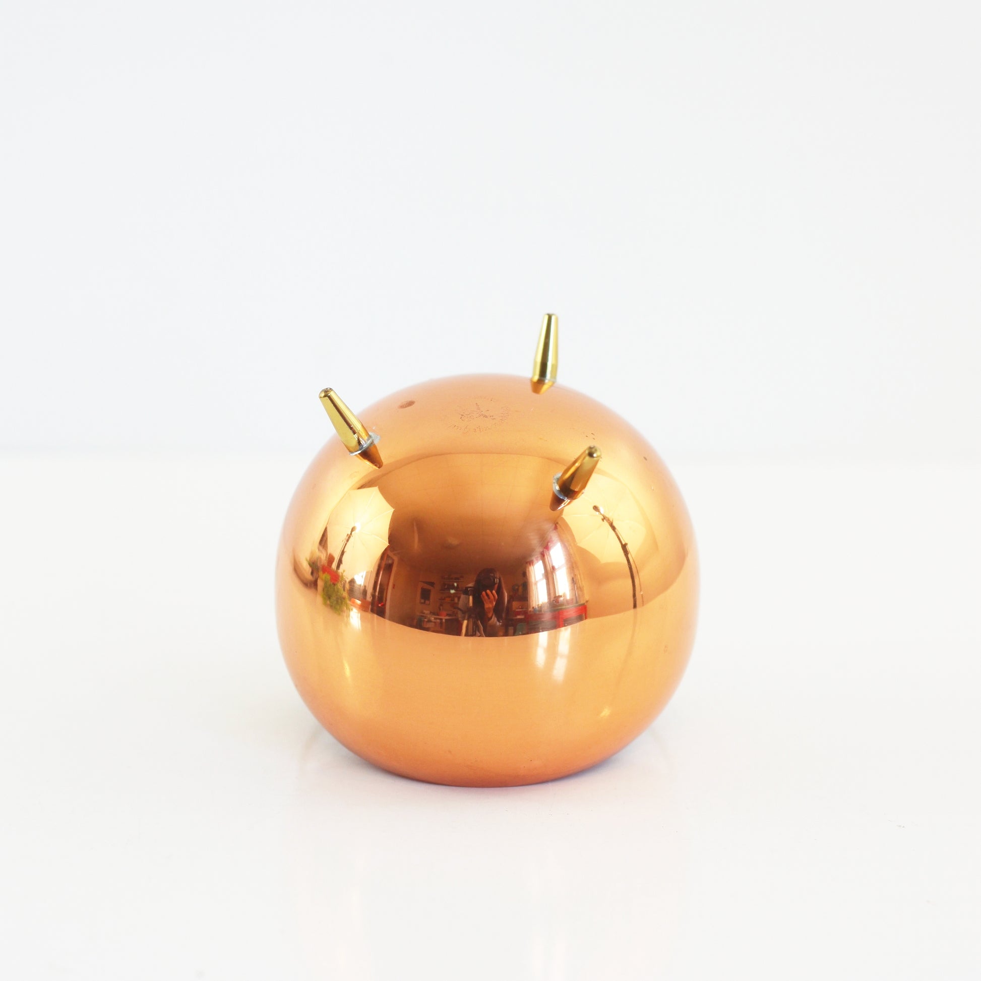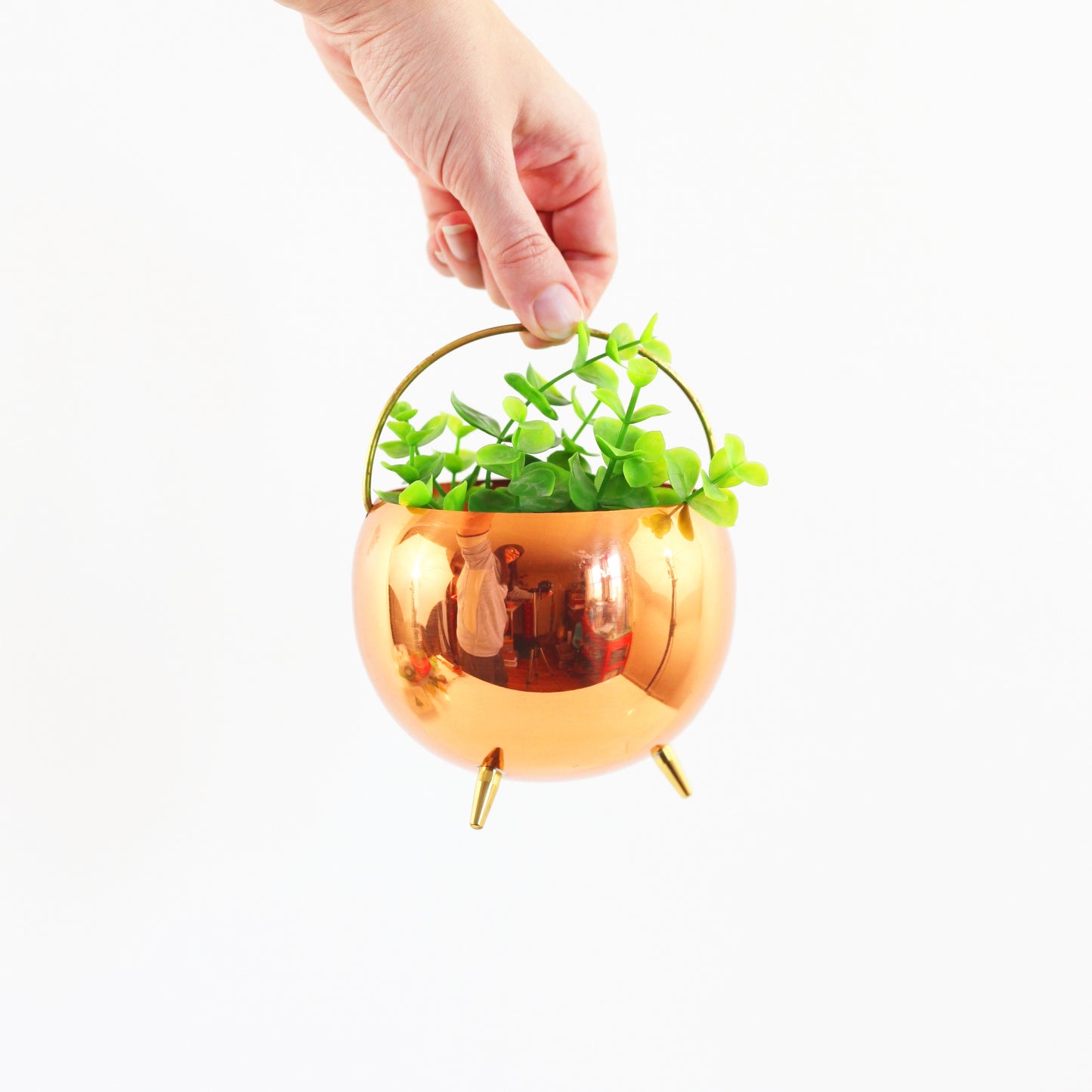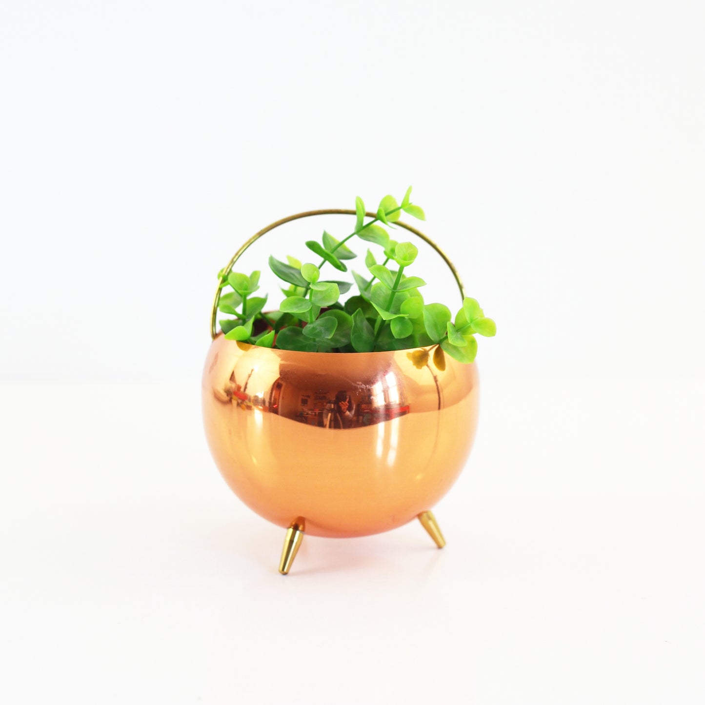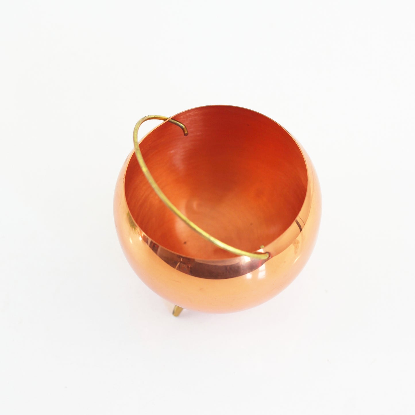 This beautiful mid century copper and brass footed planter pot by Coppercraft Guild is just so sweet! With a beautiful copper body, a brass handle, and three little brass feet, this handsome pot is ready to hold an extra special plant - or whatever else you can dream up! Hard to find this larger size in such great condition!