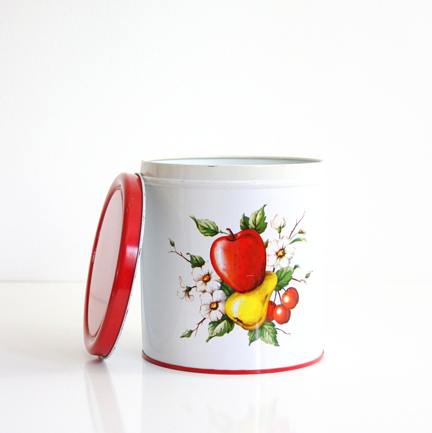 SOLD - Vintage Decoware Fruit Kitchen Canister / Vintage Red and White Kitchen Tin