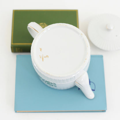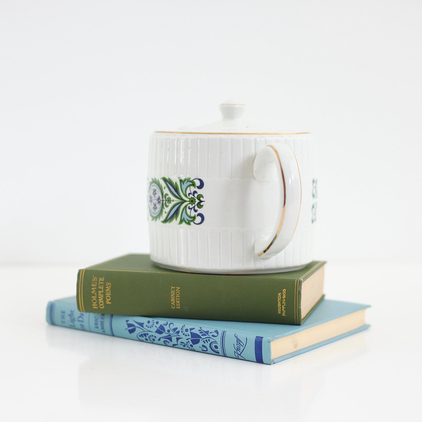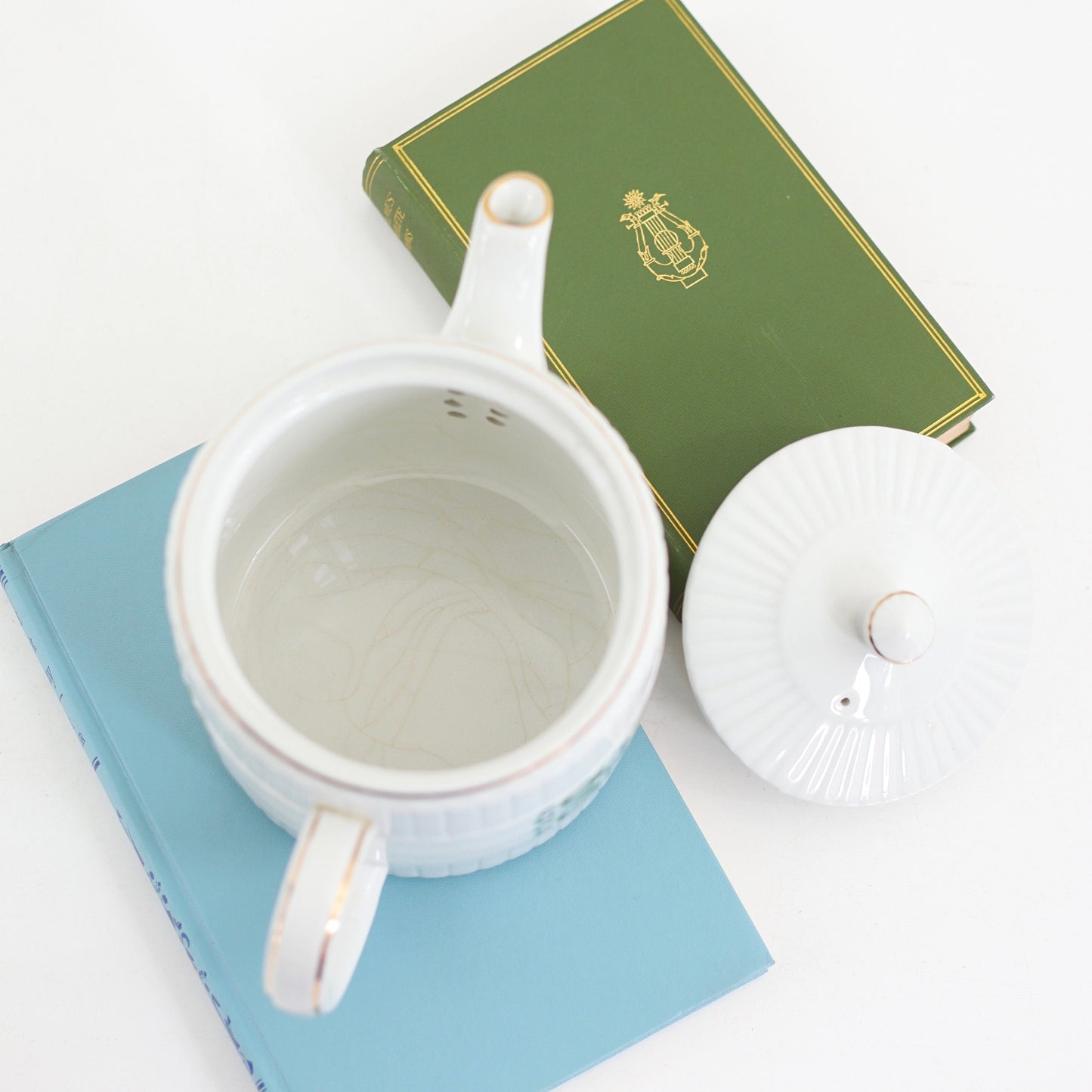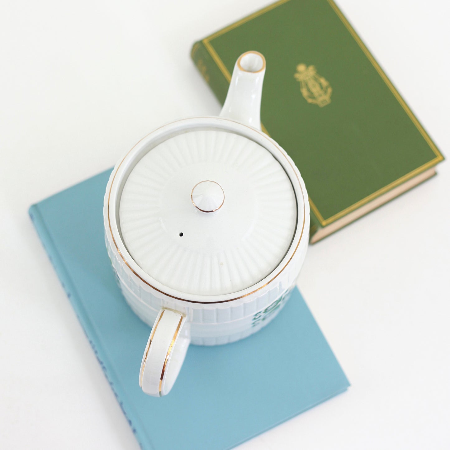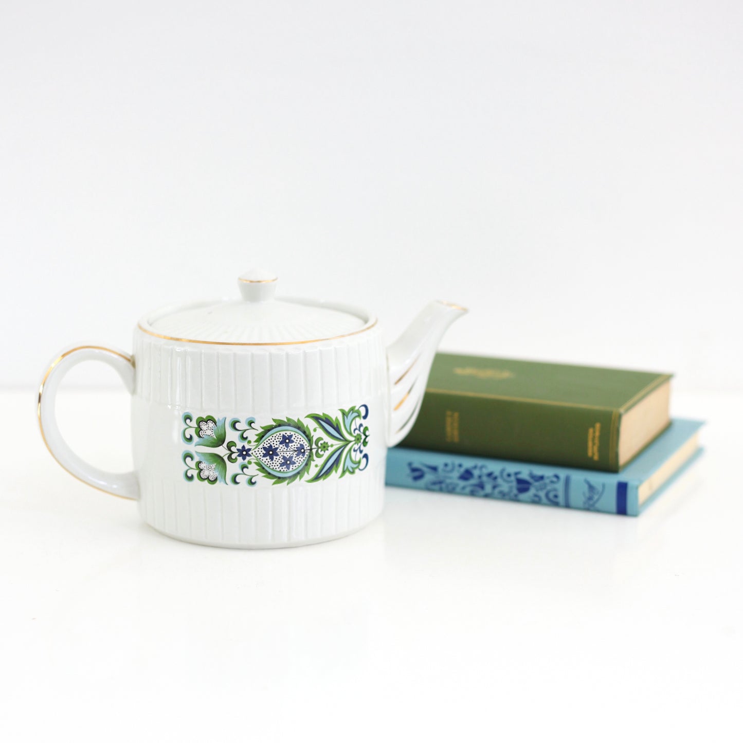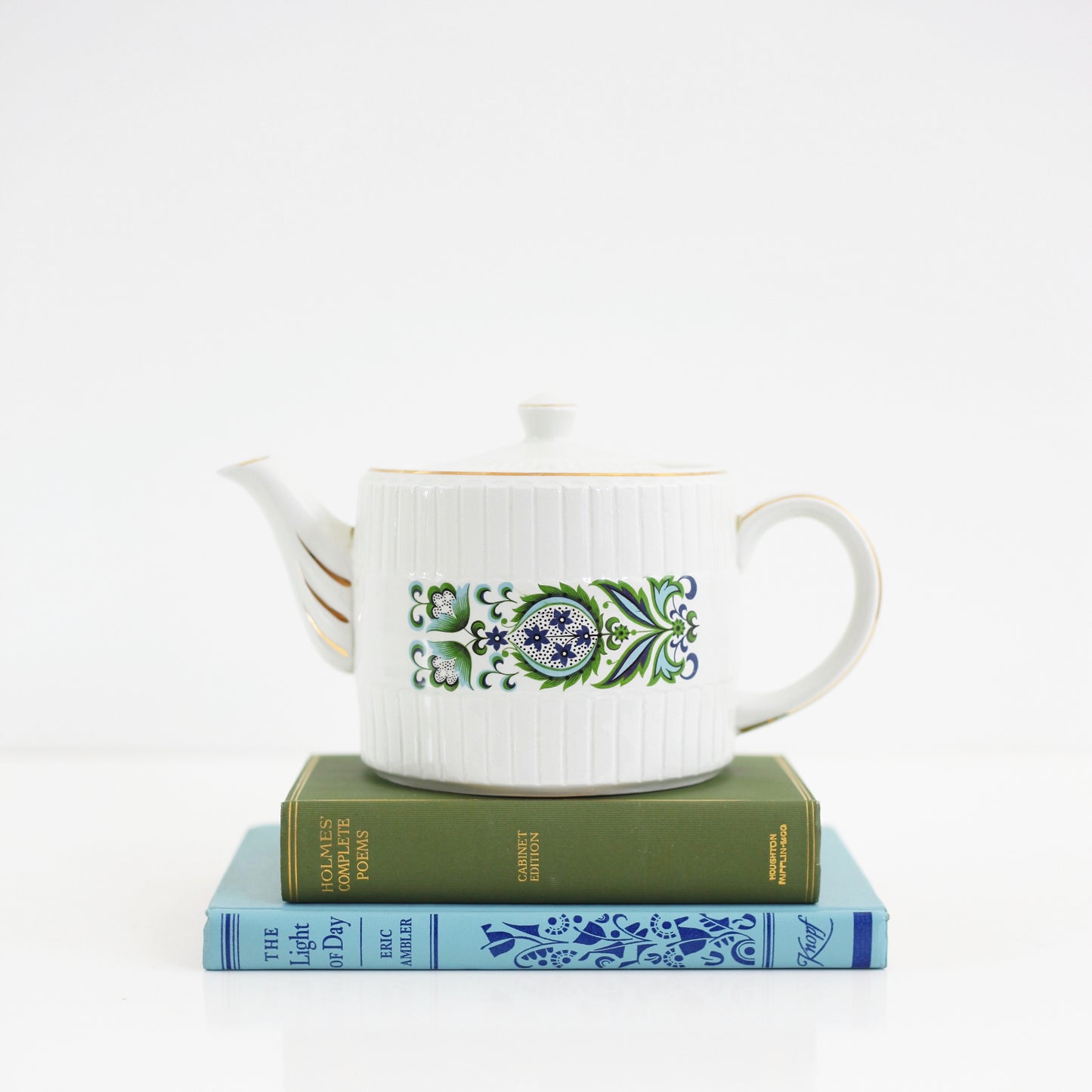 The only thing better than a piping hot cup of your favorite tea is one poured from this elegant mid century teapot! This beautiful floral teapot was made in the 1950s by Ellgreave, a subdivision of Wood and Sons pottery based in England. Made of bright white ironstone, this pretty pot has a fabulous floral design on each side (much more mid century mod than many of their floral designs!) in gorgeous shades of aqua, green, and inky blue with hand-painted metallic gold details on the rim, finial, handle, and spout. Perfect for serving up a hot cup of tea or coffee, and pretty enough just to display and admire! A hard-to-find piece that's sure to make you smile!