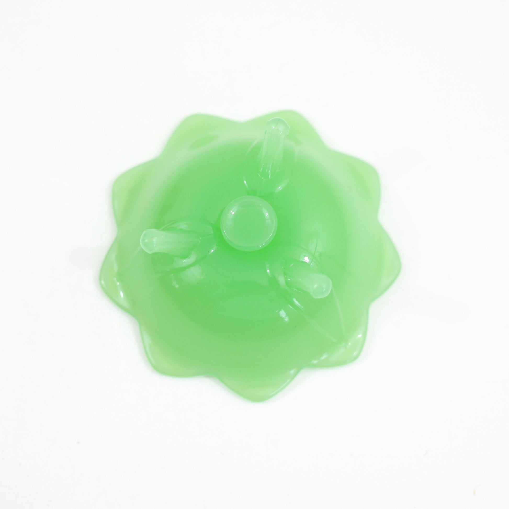 This absolutely gorgeous vintage jadeite candlestick holder was made by Fenton in the 1930s. With a simple but lovely flower shape and three little pedestal 'feet' this candle holder is made of a beautiful, glossy, slightly translucent glass that is often referred to as 'Clambroth' jadeite. A beautiful piece that's sure to be the star of your tabletop or shelf!