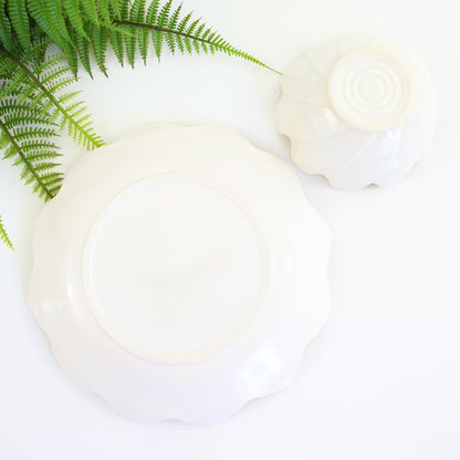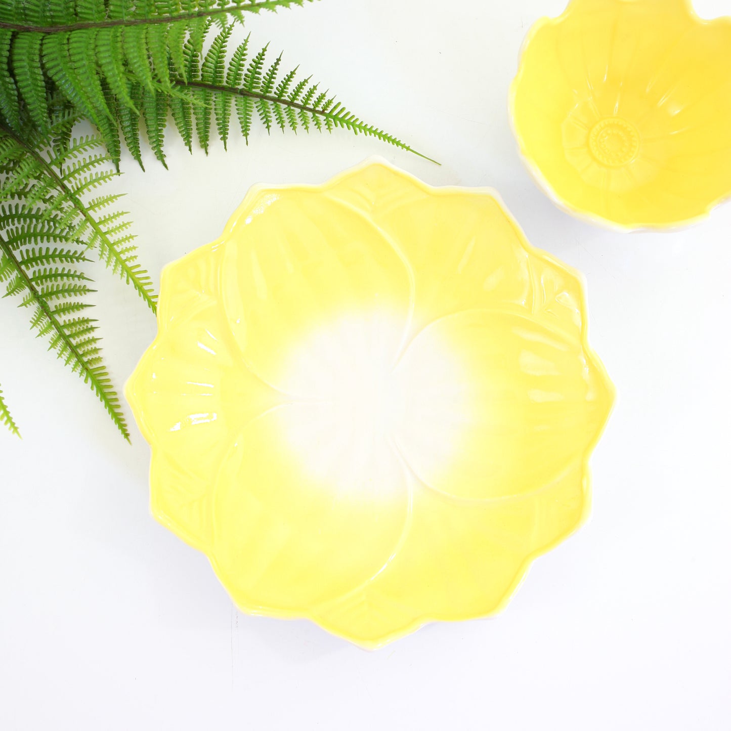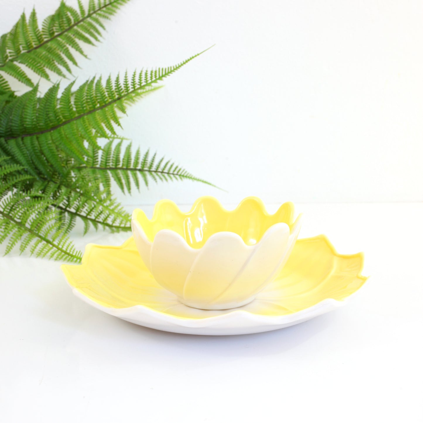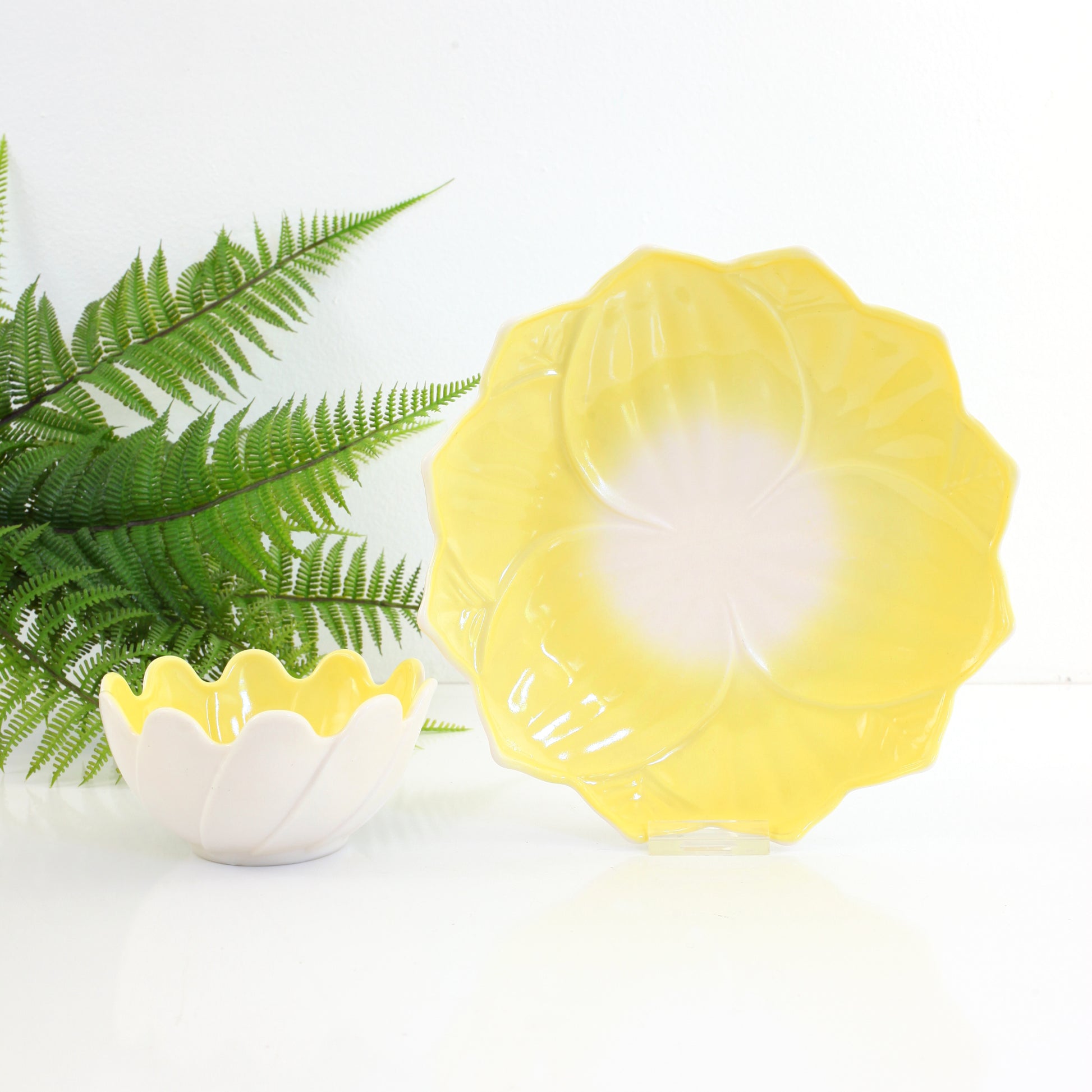 This stunning vintage Fire King lotus blossom set is so colorful and fun! Made by Fire King/Anchor Hocking in the 1950s, this pretty set includes a yellow ombre lotus blossom plate and a matching pastel lotus leaf bowl. Made of vitrock glass, this set is sure to make any meal extra special!