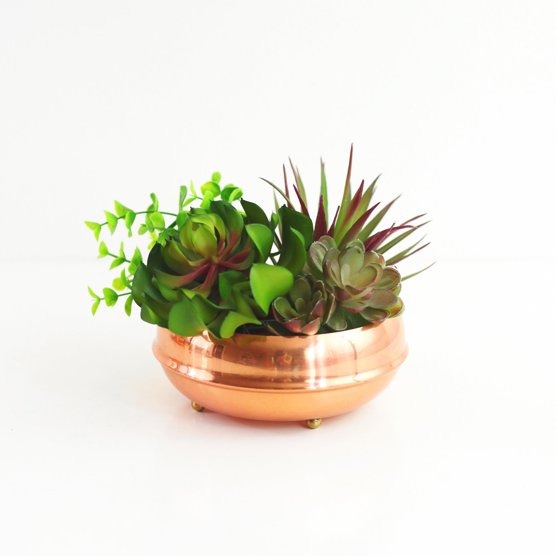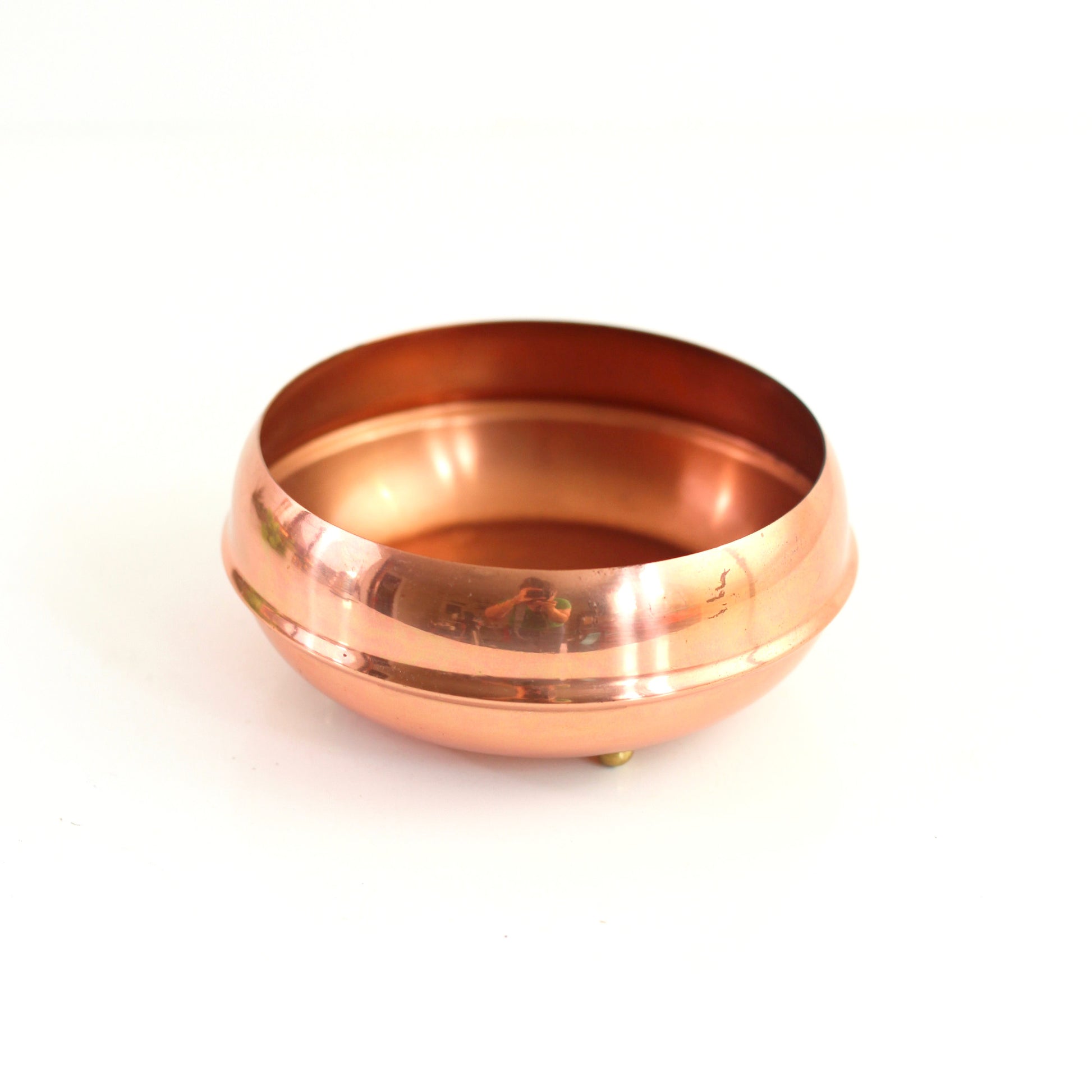 This gorgeous footed copper bowl by Coppercraft Guild is just so lovely! Made of solid copper with four little brass ball-shaped feet, this bowl has a beautiful patina and is perfect for holding fruit on your counter, plants and succulents on the windowsill, jewelry on your dresser, or whatever else you can dream up!