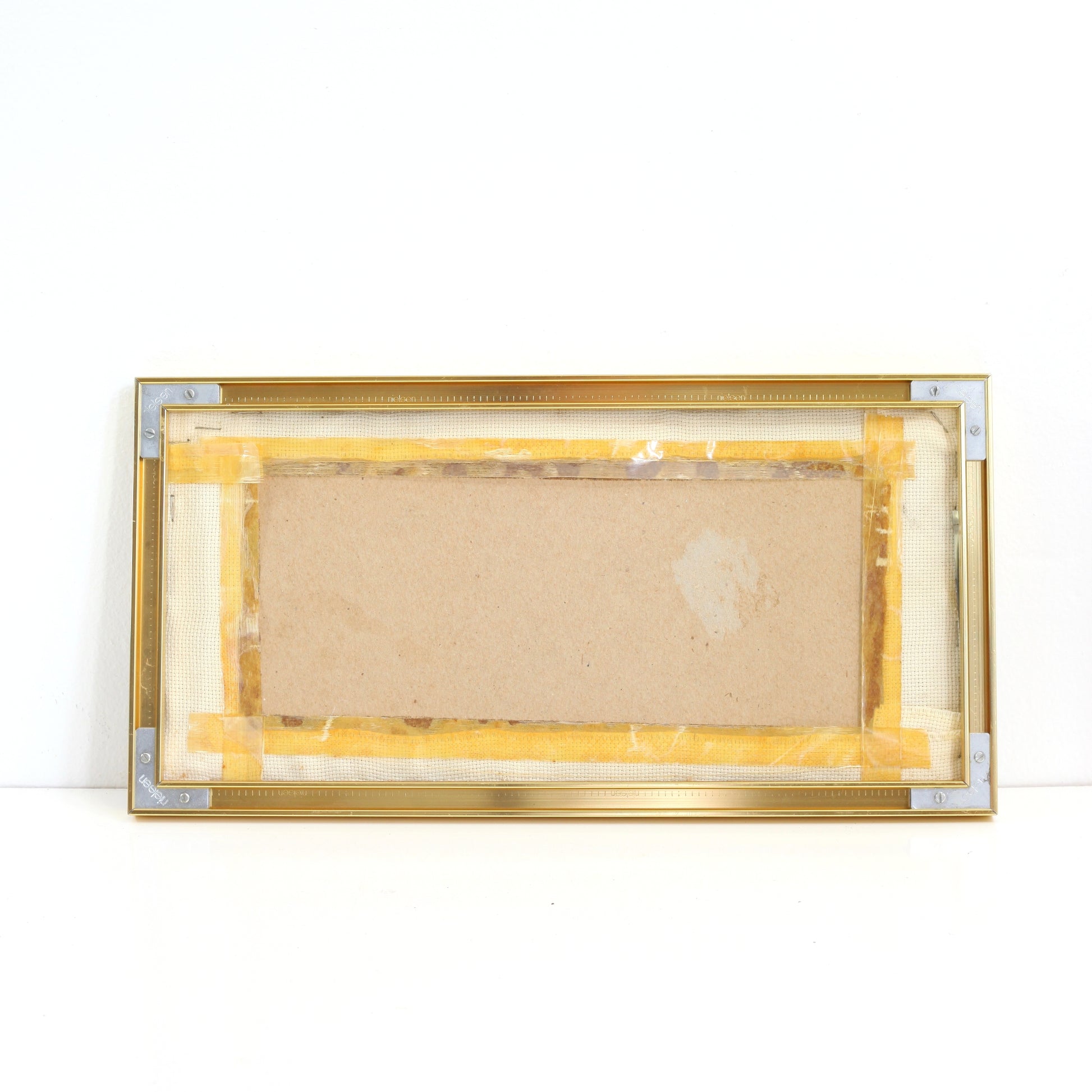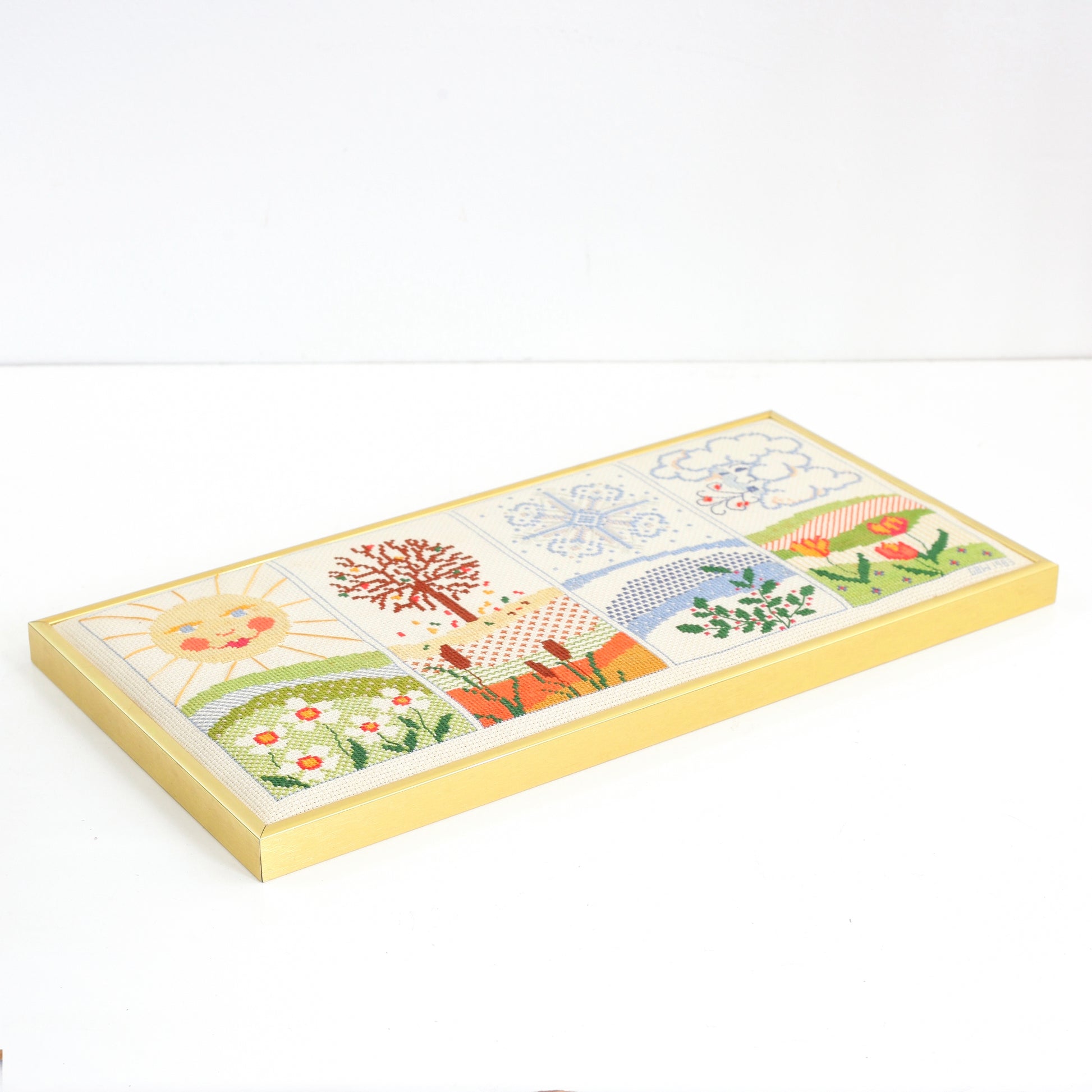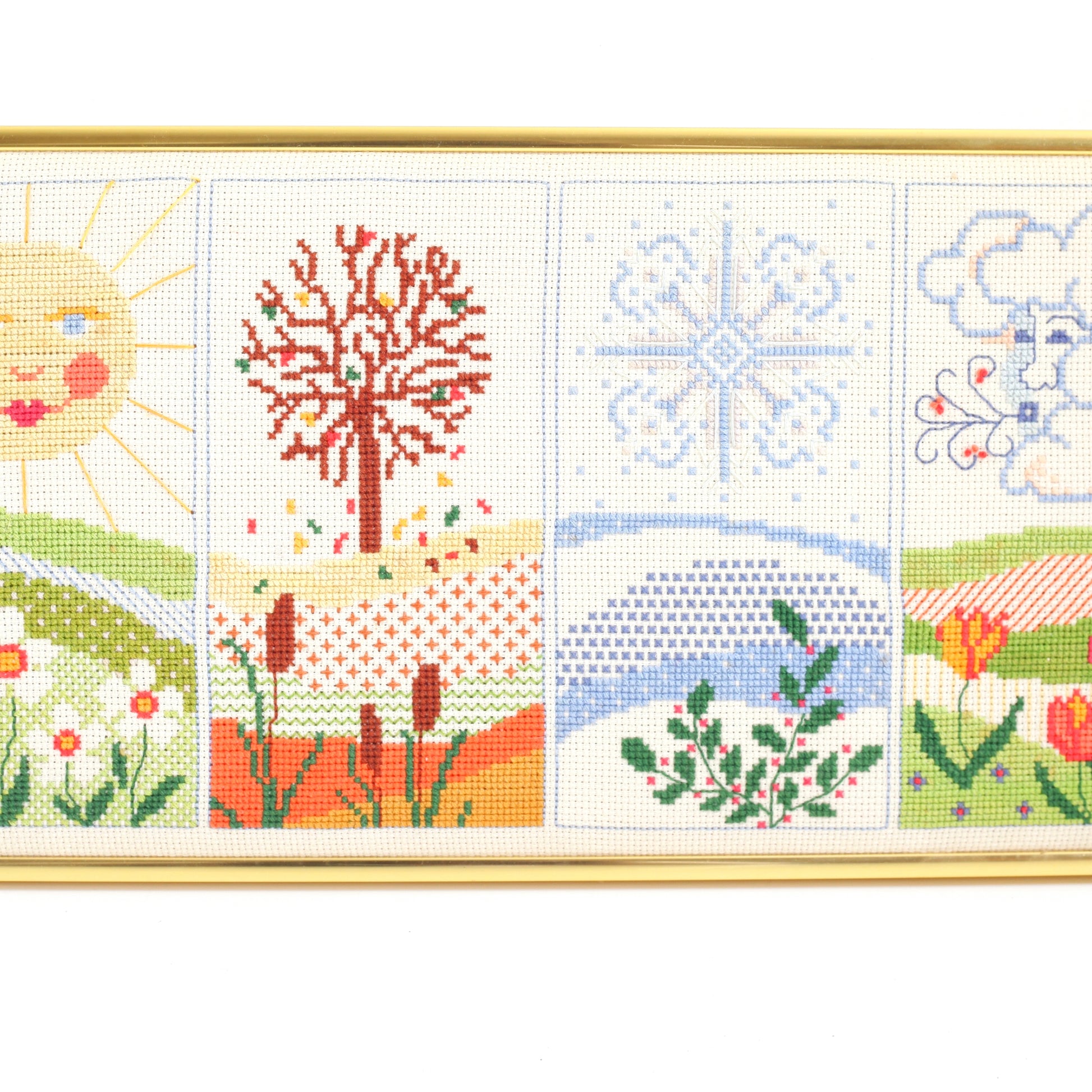 This colorful vintage cross stitch is so sweet! Hand stitched with four colorful scenes, each depicting one of the four seasons. Piece is framed in a beautiful gold-tone metal frame. A beautiful piece that will add a bit of vintage fun to your home -- all year long!