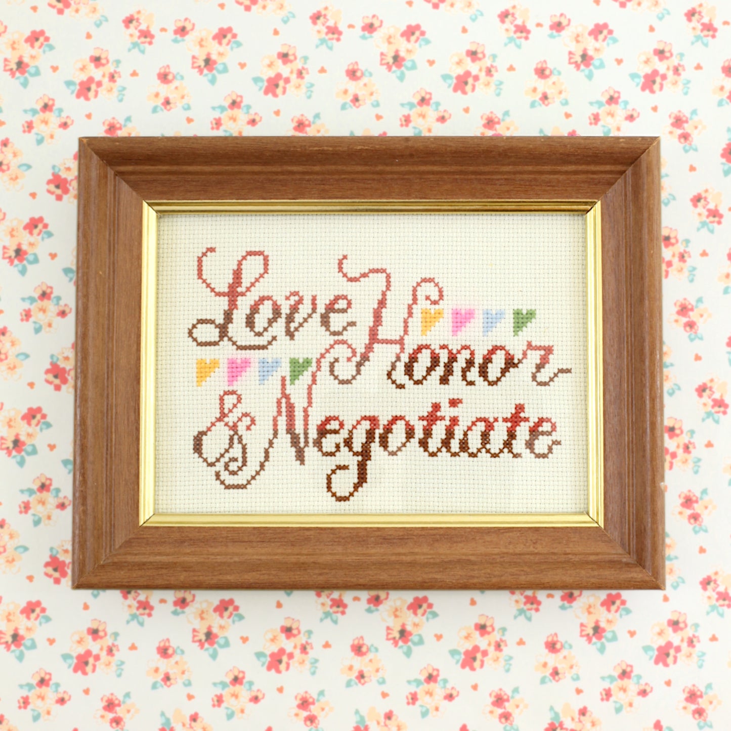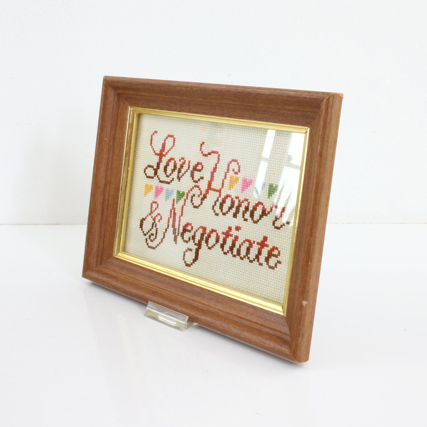 This sweet vintage framed cross stitch is just so charming! The words 'Love Honor & Negotiate' are stitched in an elegant script and adorned with colorful little hearts. Piece is framed behind glass in a simple wood frame with a gold interior border.
