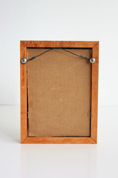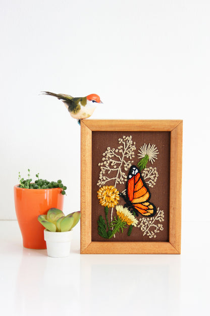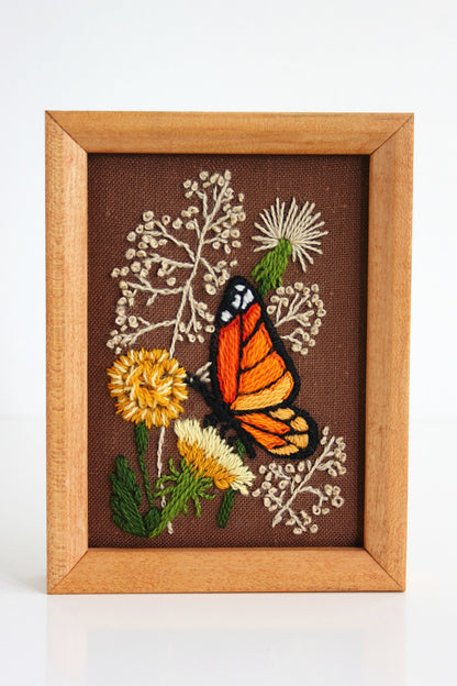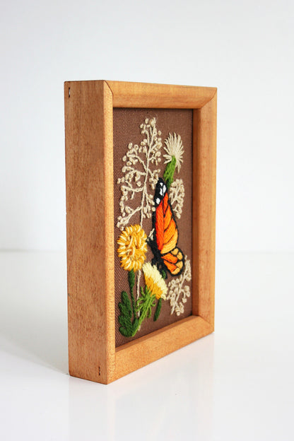 This colorful vintage butterfly embroidery is so sweet! Hand embroidered crewel work in brightly colored yarn depict a beautiful monarch butterfly on a brown background. Piece is framed in a beautiful light wood. Picture wire is strung across the back, so this beauty is all ready to hang and admire!
