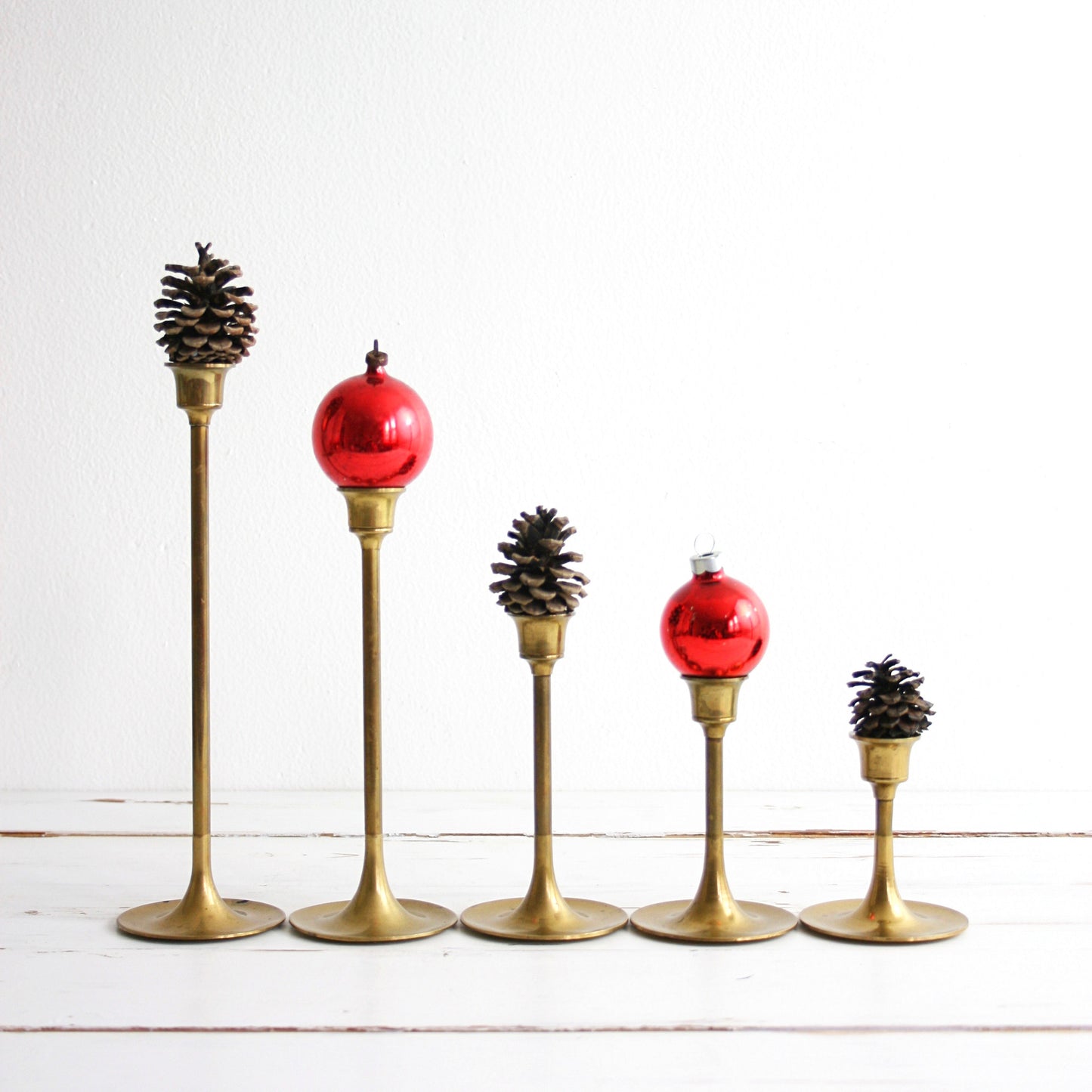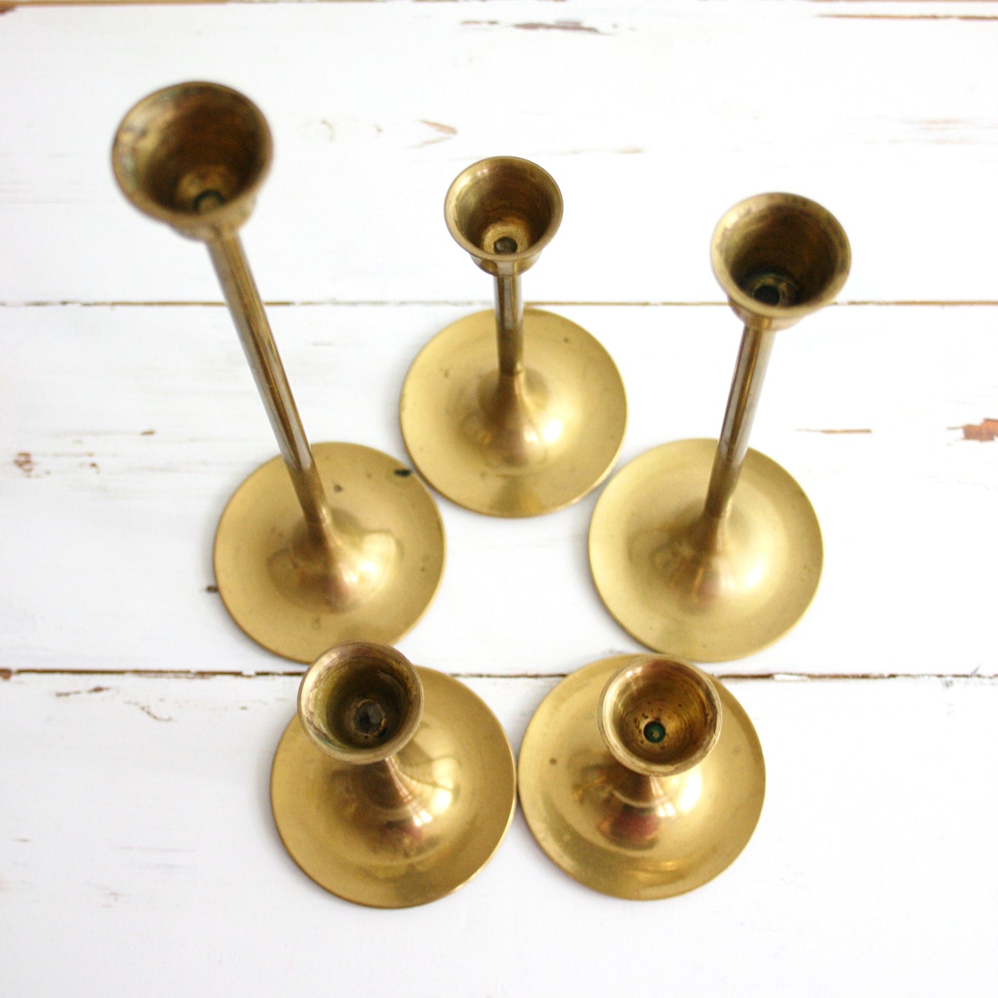 SOLD - Vintage Graduated Brass Candlesticks / Set of Five Mid Century Modern Brass Candlesticks