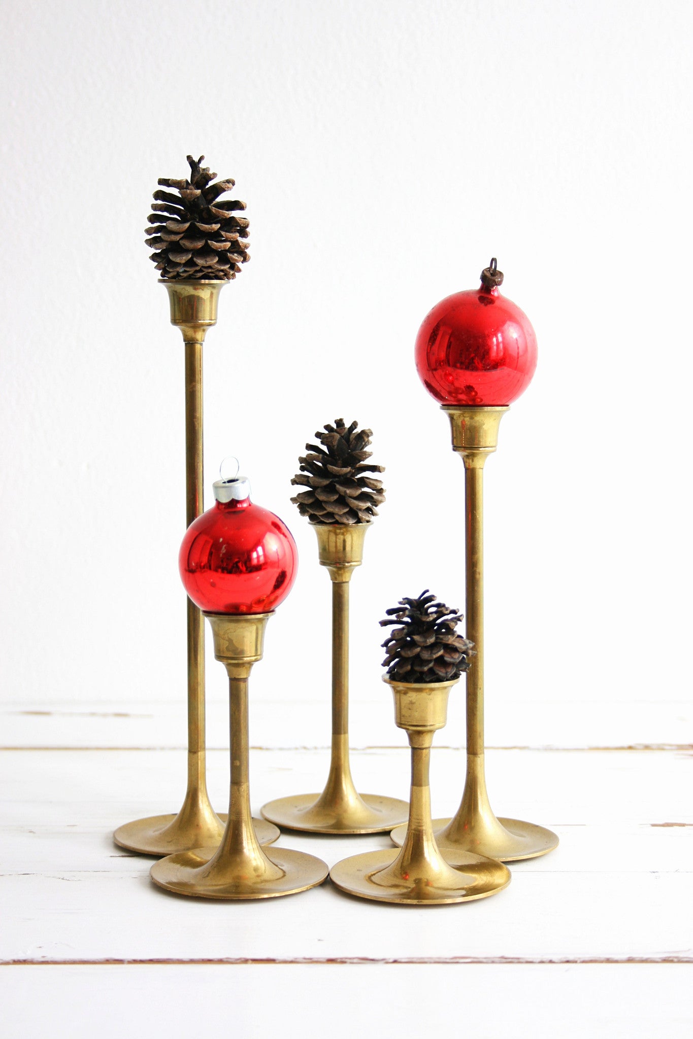 This handsome set of five vintage mid century brass candlesticks is just gorgeous! With a light patina and warm, gorgeous golden color, these candlesticks are varying heights, allowing you to create any number of centerpieces or displays. Simple yet stunning, these graduated brass candlesticks are sure to add a touch of mid century charm to your table or shelf!