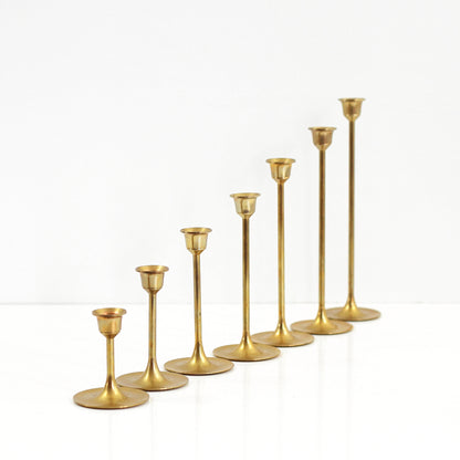 This handsome set of seven vintage mid century brass candlesticks is just gorgeous! With a light patina and warm, gorgeous golden color, these candlesticks are varying heights, allowing you to create any number of centerpieces or displays. Simple yet stunning, these graduated brass candlesticks are sure to add a touch of mid century charm to your table or shelf!