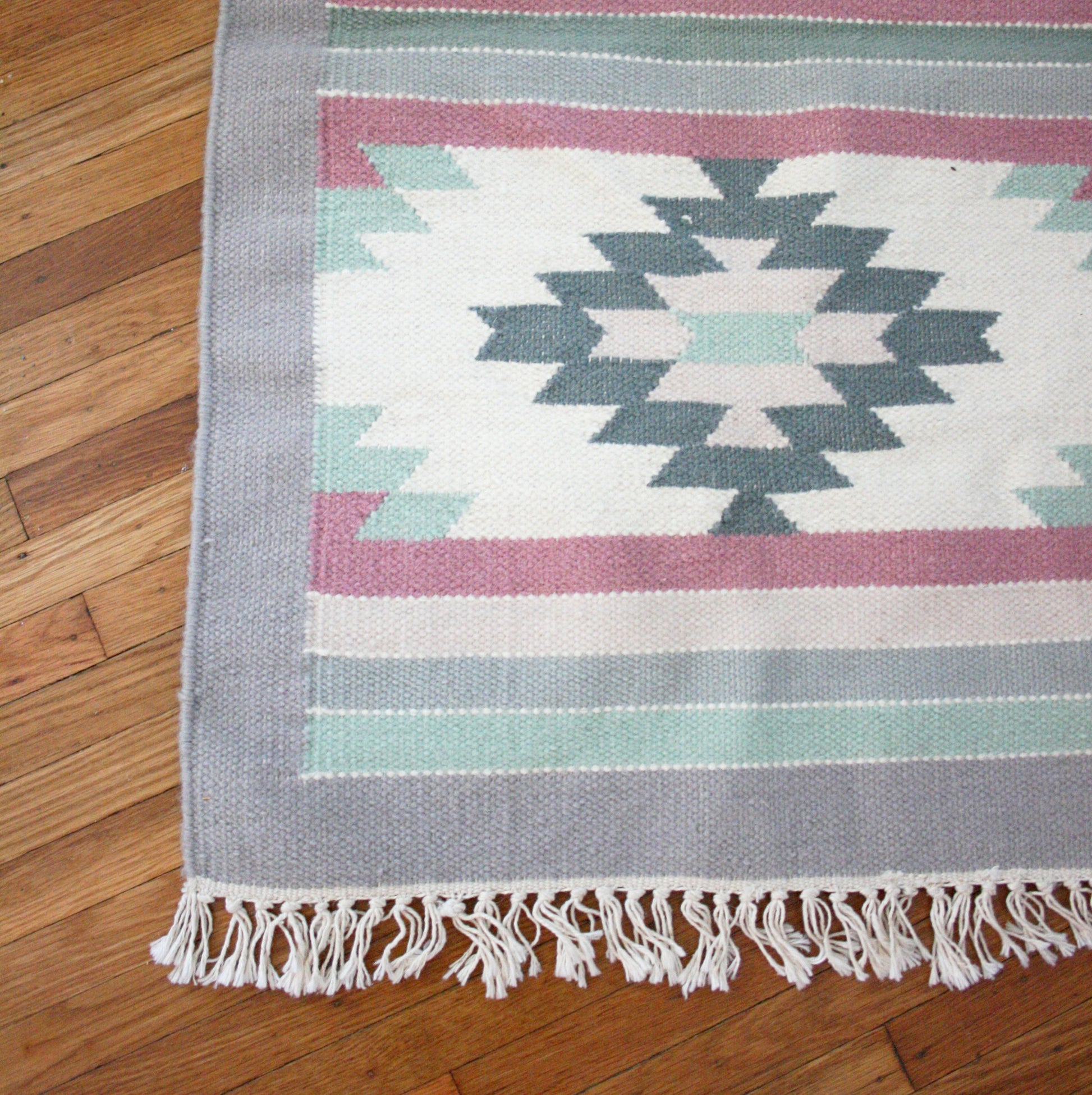 This absolutely gorgeous vintage hand knotted 100% wool pile throw rug from India is a real stunner! Made of 100% wool pile, this hand-knotted rug has a gorgeous geometric design in muted shades grey, off-white, sage green, and raspberry. Finished off with fabulous fringe detailing on both ends, this 2' x 3' throw rug is sure to add durable and oh-so cozy style to your space!