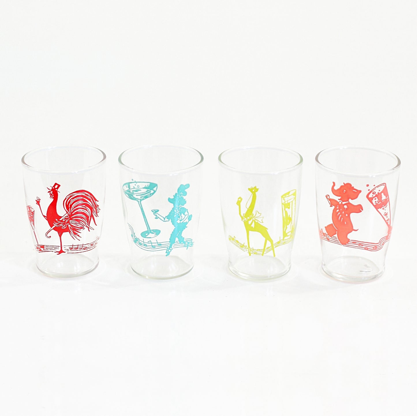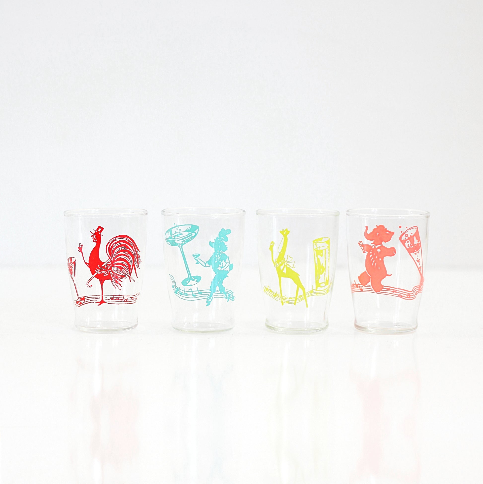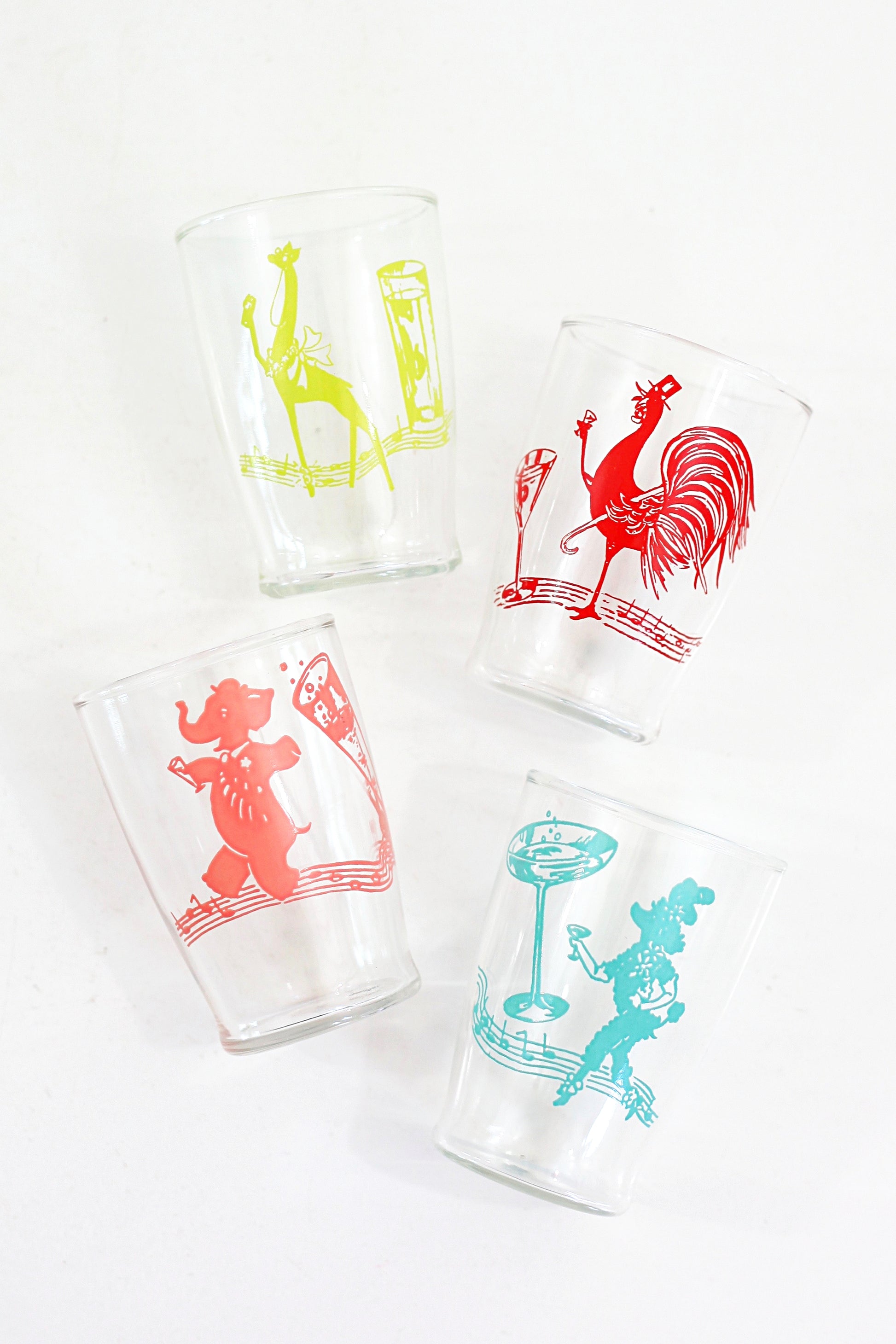 This wonderfully kitschy set of four vintage cocktail glasses is so just retro and fun! These whimsical glasses each feature a colorful animal holding their favorite cocktail. Just think how fun these would make your next cocktail party - and they're sure to make your bar cart extra retro-fabulous as well!