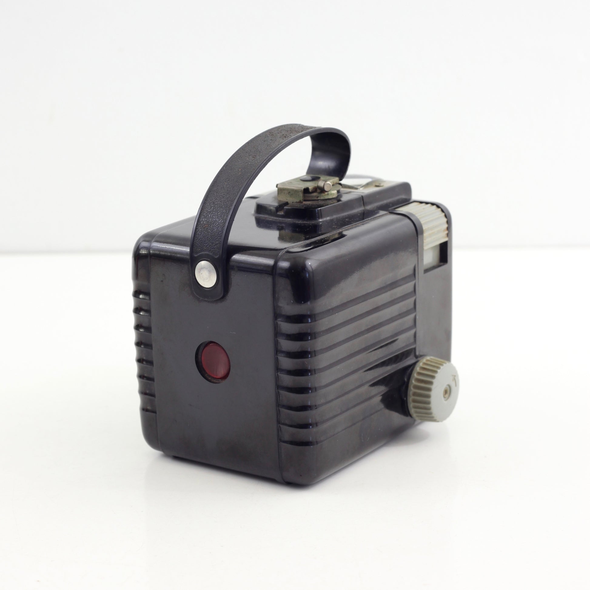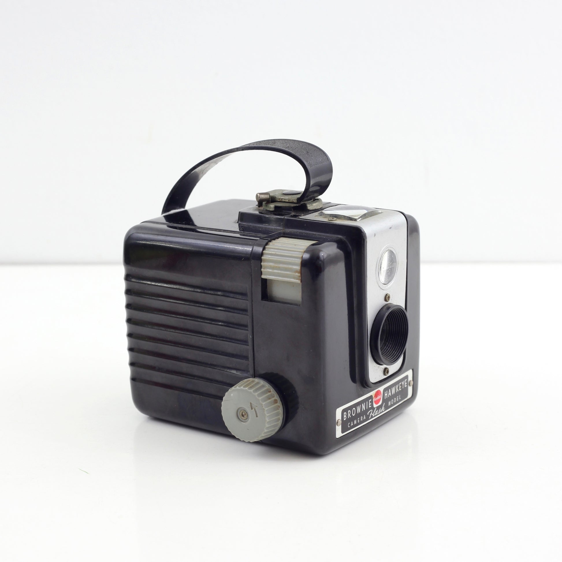 This fantastic vintage 1950s Kodak Brownie Hawkeye bakelite camera is so cool! Made of sturdy black bakelite with silver details and great typography, this little box camera is full of vintage charm. A beautiful and iconic vintage box camera!