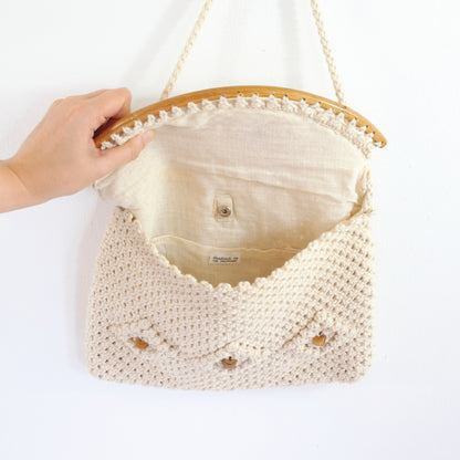 This vintage macrame purse is a real boho beauty! Hand made in the Philippines, this gorgeous bag is made of off-white cotton cording, wooden beads, a bamboo closure, and muslin lining. Pretty and practical, this dreamy vintage purse is about to become your go-to accessory!