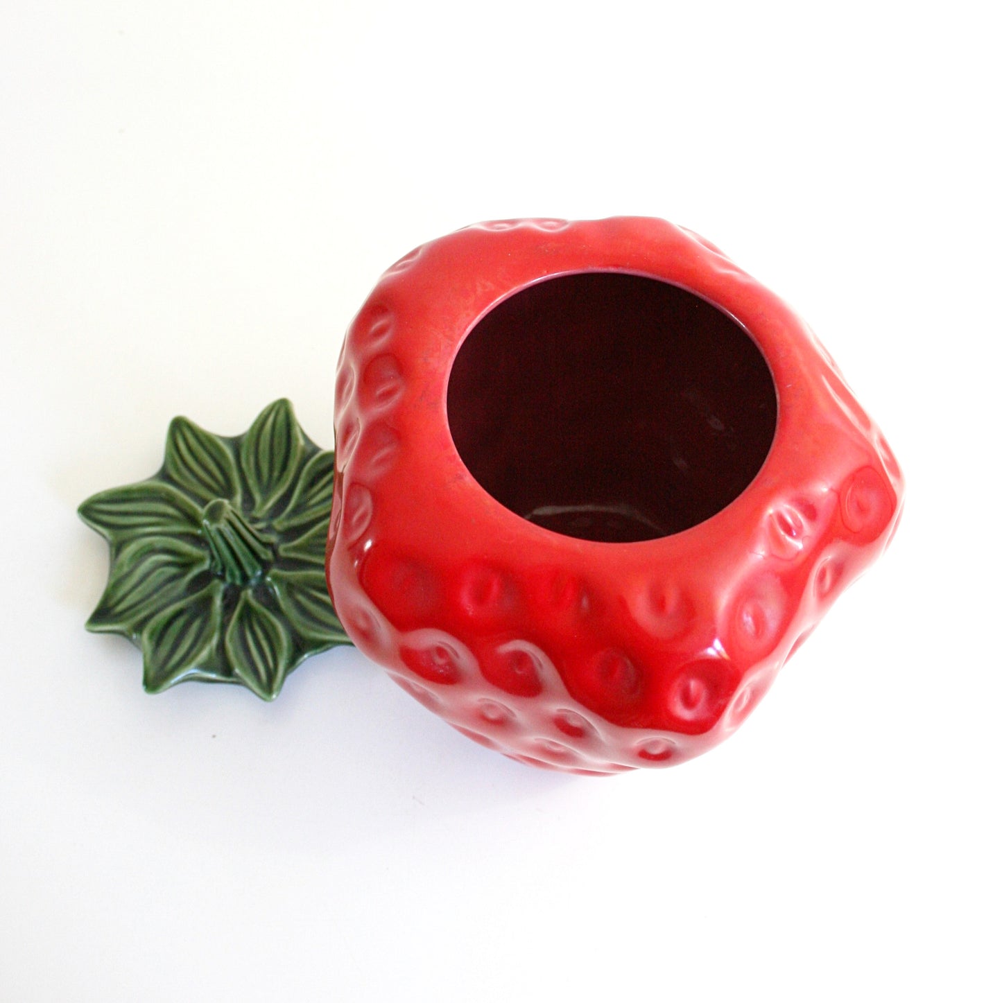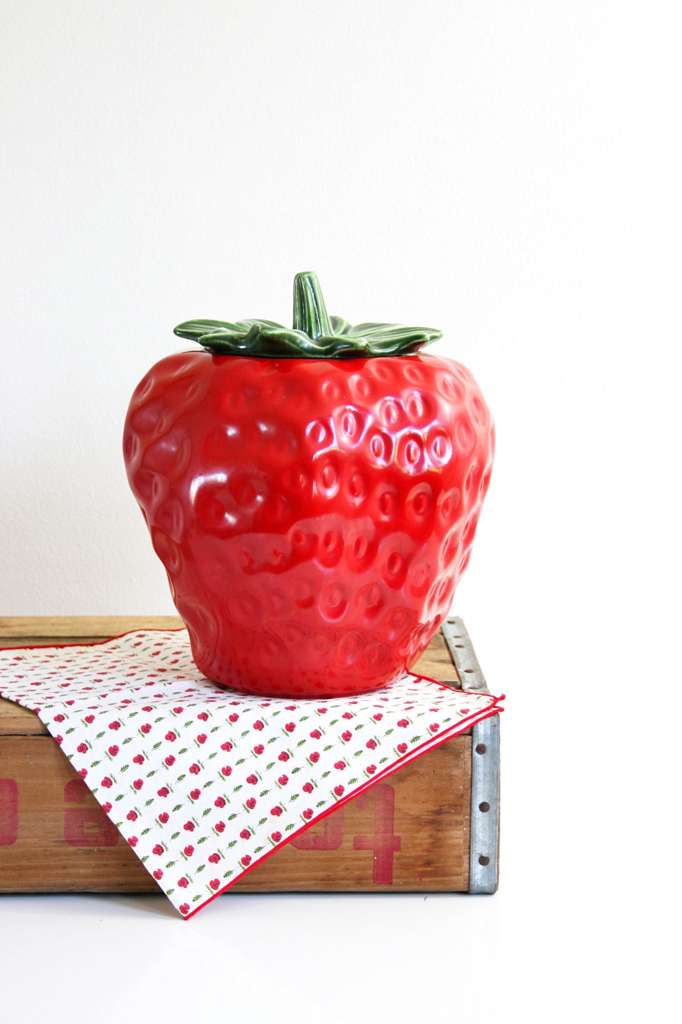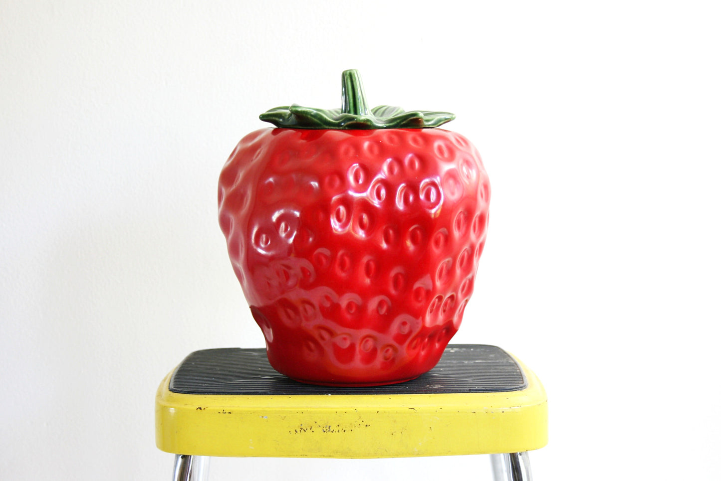 This bright and beautiful vintage ceramic strawberry cookie jar is so colorful and fun! Made of sturdy ceramic with lovely details, this ceramic canister was made by McCoy in the 1970s. As fun as it is functional, this sweet strawberry is perfect for keeping cookies or snacks, but would also be great for storing craft supplies - or just displaying and admiring! No matter where or how you use it, one thing's for sure - this cookie jar is 'berry' cute!