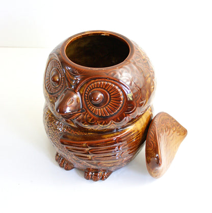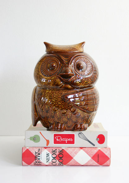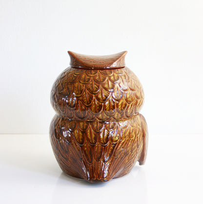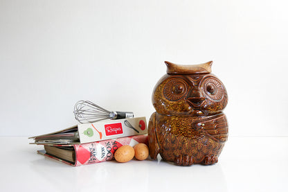This bright and beautiful vintage ceramic owl cookie jar is so retro and fun! Made of sturdy ceramic with lovely details (I just love the owl's feathers!), this ceramic canister was made by McCoy in the 1970s. Finished in rich, beautiful coffee brown high-gloss glaze. As fun as it is functional, this canister is perfect for keeping cookies or snacks, but would also be great for storing craft supplies - or just displaying and admiring! No matter where or how you use it, one thing's for sure - this cookie jar is a real hoot!