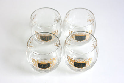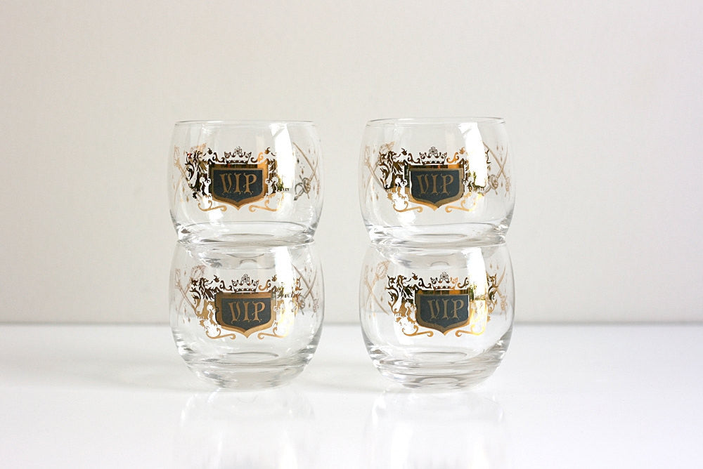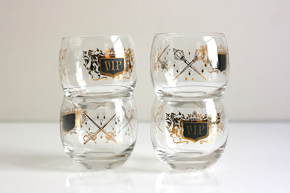 This awesome set of four vintage mid century black and gold VIP roly poly glasses is so classy and cool! With a black and gold 'VIP' crest design on the front, crossed gold swords one one side, and crossed gold scepters on the other, these tumblers will make any drink special. You know you're important - isn't it time your glasses did, too?