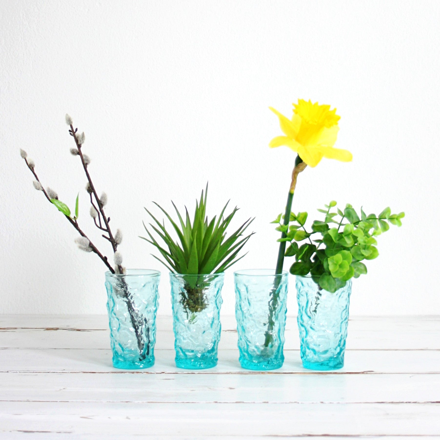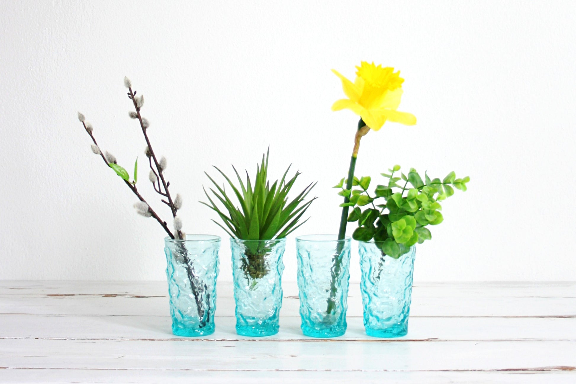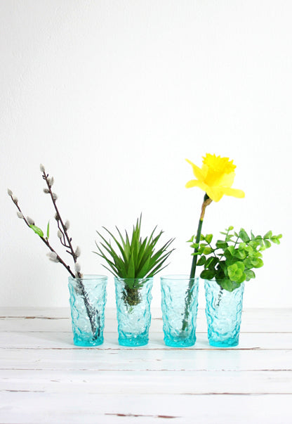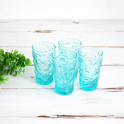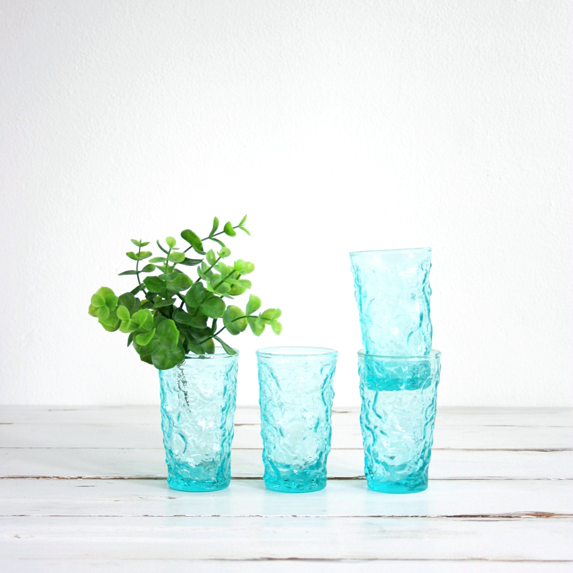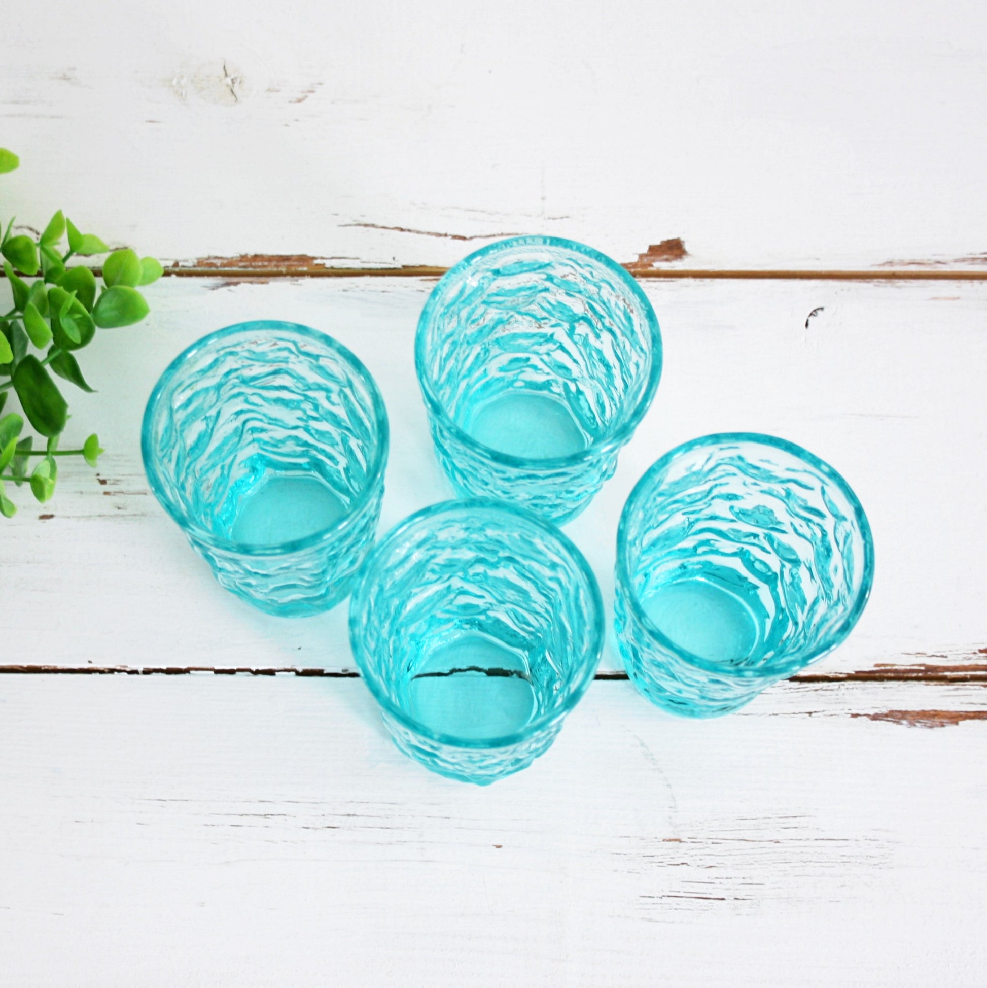 If you're a fan of colorful vintage glassware, then you're going to love these gorgeous mid century modern Lido glasses by Anchor Hocking! Manufactured by Anchor Hocking in the 1960s, these bright and beautiful juice glasses are part of their 'Lido' line of glassware, which consists of a great textured 'crinkle' pattern. These glasses were made in a variety of colors, but these aquamarine beauties are the most collectible and the hardest to find! Rarely have I seen glassware so rich and bold in color - these glasses almost appear to glow in the light!