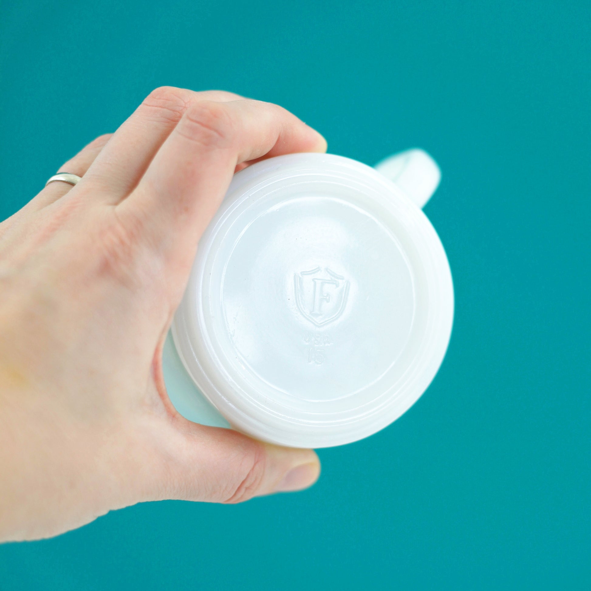 This fun vintage milk glass initial mug by Federal Glass is so retro and fun! Made of sturdy bright white milk glass with a classic 'D'-shaped handle, this mug features a fabulous black capital letter N on each side, complete with fun scrolls and swirls. The perfect way to make your morning cup of coffee or tea extra Nice -- with a capital N!